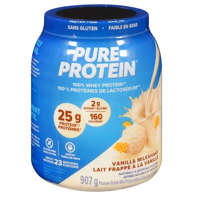 Pure Protein 100% Whey Protein Powder delivers a powerful blend of protein. Whether you blend it, shake it or add it to your smoothies, the delicious Vanilla flavour provides a tasty way to add protein to your day. Directions: For Adults: Add one (1) scoop to 237 mL of water, juice, milk or yogurt, and mix. Stir until well blended. Drink immediately. You can drink Pure Protein 100% Whey any time during the day to add protein to your daily intake. Be sure to figure the extra calories provided by milk, juice, yogurt or whatever you may add.Contains: Milk, Soy and Sulphites.