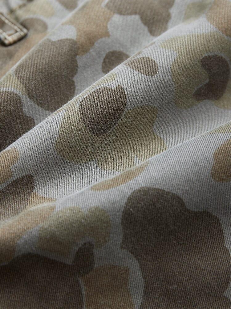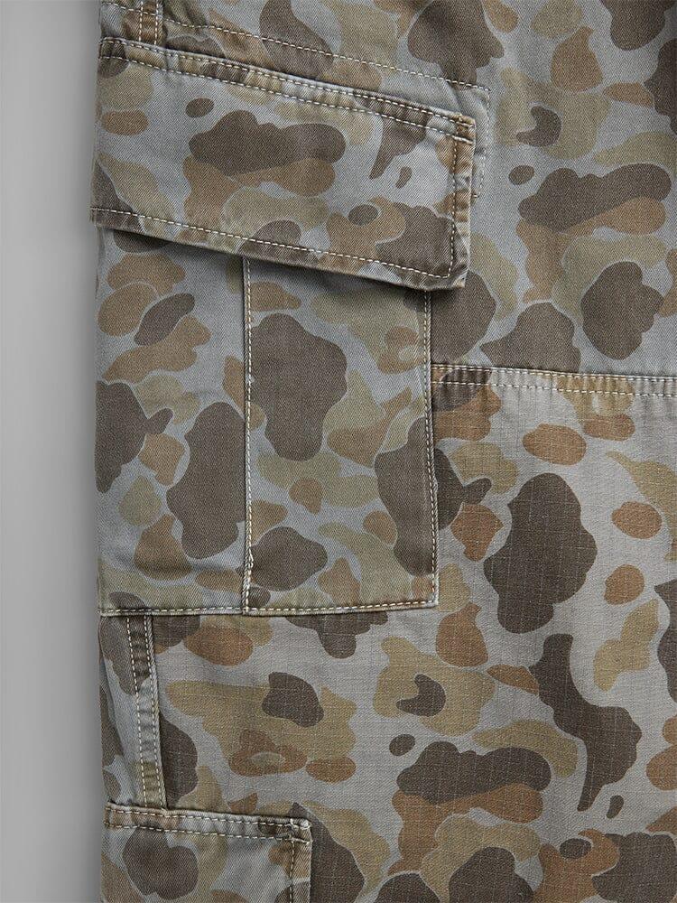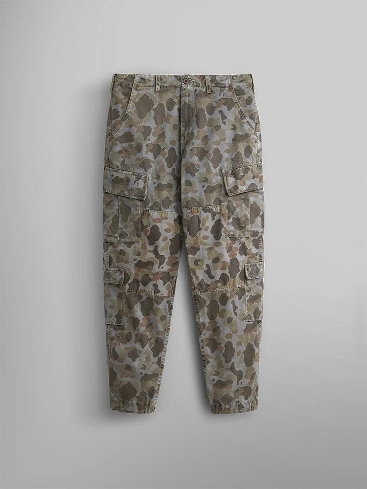 Our take on combat pants, this pair features multiple cargo pockets and nylon details for a cool visual effect. They’re available in a vintage-inspired battlewash camo. FEATURES battlewashed waistband w/button and zip closure two large side cargo pockets with hidden button on pocket flap two small pockets w/hidden button closure on flap nylon piecing at the knee flat drawstring at bottom hem flap pockets on back