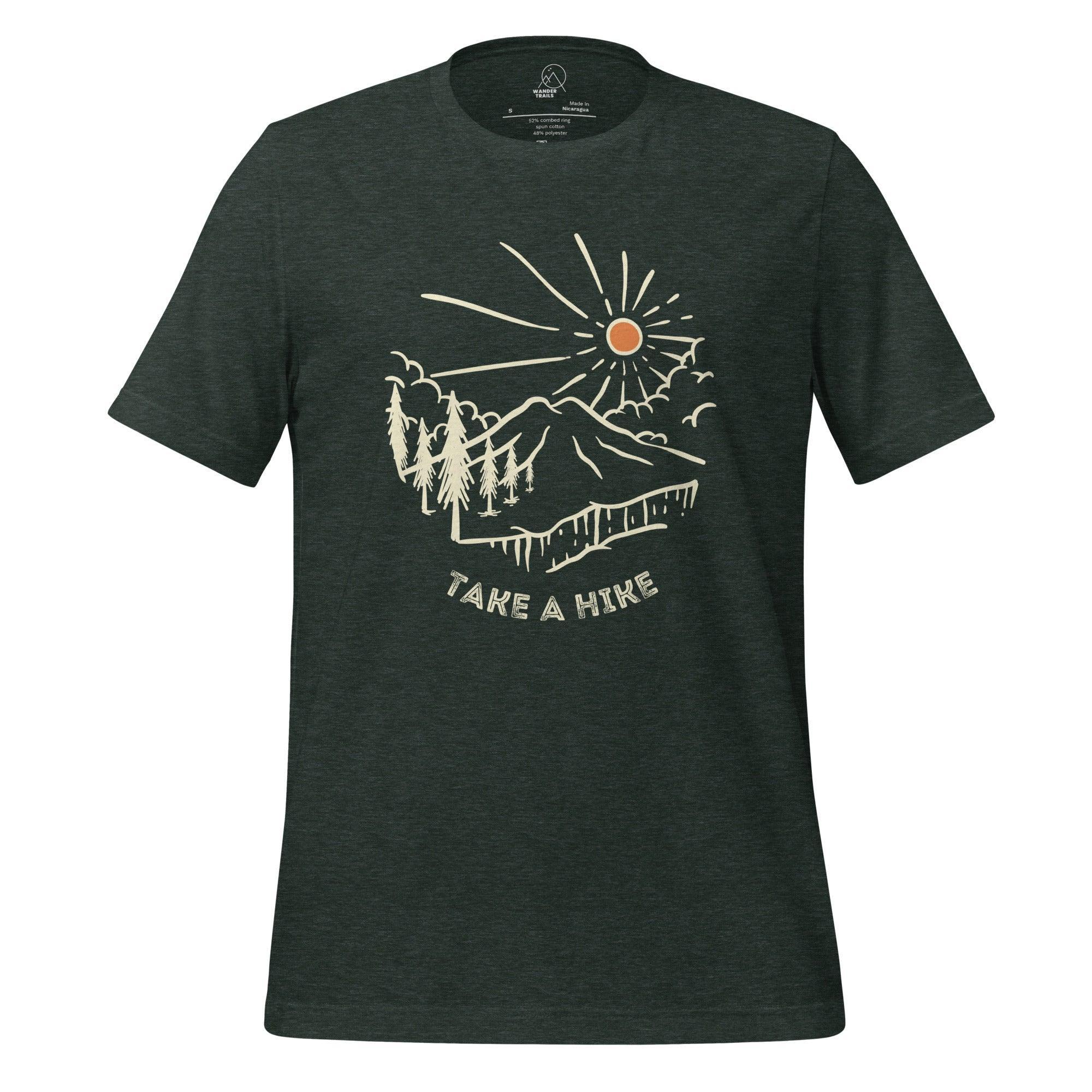 Take a Hike Unisex t-shirt. This t-shirt is everything you've dreamed of and more. It feels soft and lightweight, with the right amount of stretch. It's comfortable and flattering for all. • 100% combed and ring-spun cotton (Heather colors contain polyester) • Blank product sourced from Nicaragua, Mexico, Honduras, or the US This product is made especially for you as soon as you place an order, which is why it takes us a bit longer to deliver it to you. Making products on demand instead of in bulk helps reduce overproduction, so thank you for making thoughtful purchasing decisions! Size guide LENGTH (inches) WIDTH (inches) CHEST (inches) XS 27 16 ½ 31-34 S 28 18 34-37 M 29 20 38-41 L 30 22 42-45 XL 31 24 46-49 2XL 32 26 50-53 3XL 33 28 54-57 4XL 34 30 58-61 5XL 35 31 62-65