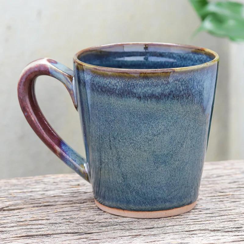 Chase the morning doldrums away with a sip of steaming coffee or tea from this beautiful mug designed by Thai artisan Duangkamol. Hand crafted from ceramic, the mug is glazed in glossy indigo with dark red accents around the rim and handle.