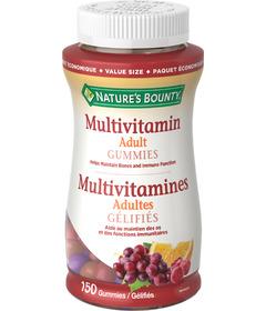 Nature's Bounty delicious Adult Multivitamin Gummies provide a unique way to help maintain your bones and immune function. Naturally flavoured in orange, cherry and grape, you'll look forward to adding them to your daily routine. Adult Dosage: Adults, chew two (2) gummies per day with food. Take a few hours before or after taking other medications.WARNING: Zinc supplementation can cause a copper deficiency. KEEP OUT OF REACH OF CHILDREN. Store in a dry place and avoid excess heat. Security seal.