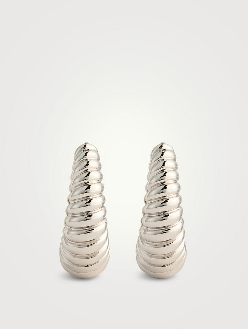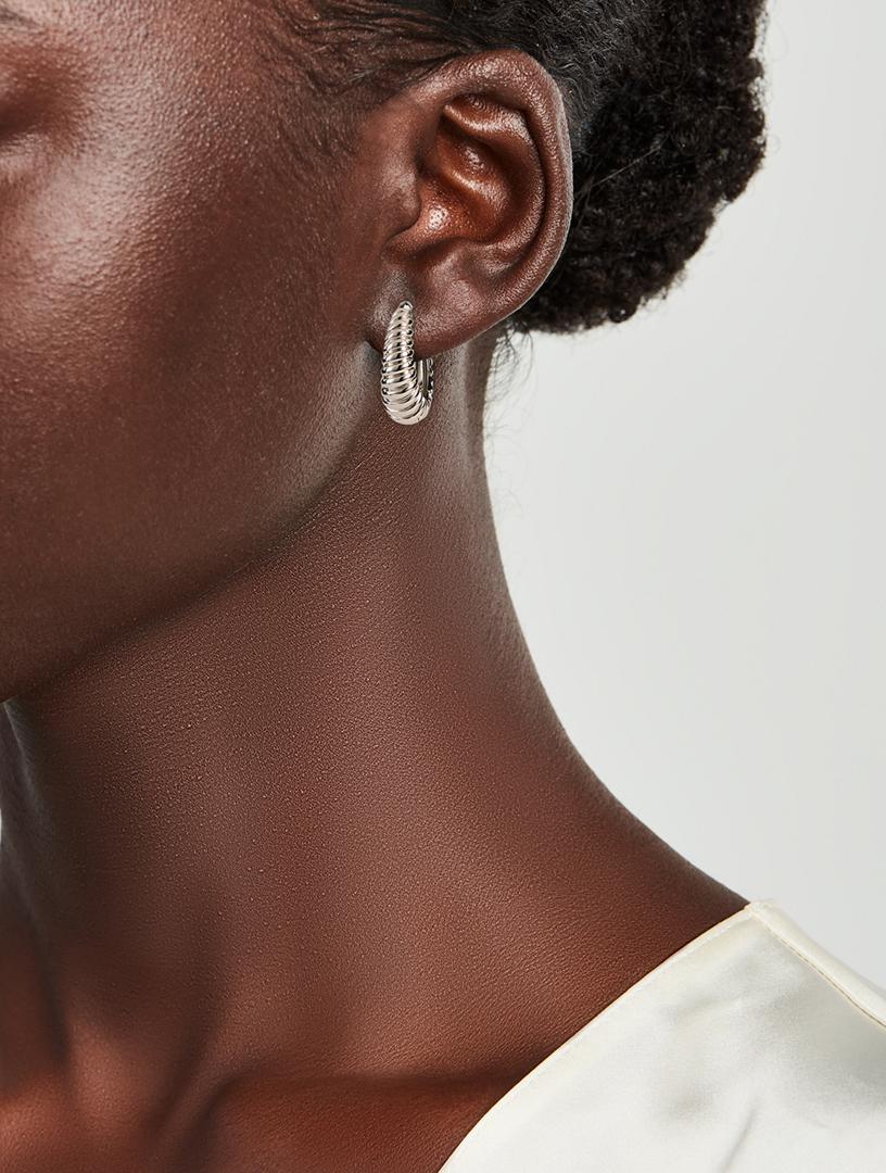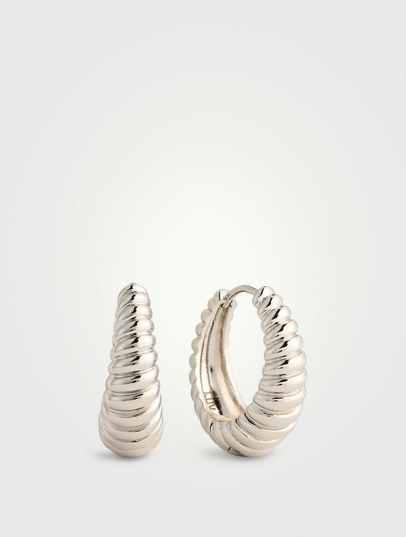 Made from silver-plated brass, these medium-sized ridged tear-drop hoops are perfect for everyday wear. All Luv Aj jewellery is waterproof and tarnish resistant. Luv Aj uses Ion Plating, which is a Physical Vapor Deposition (PVD) process used to create durable, long-lasting finishes on metal. The base metal is brass, which then is plated with at least 0.1 micron of 14K Gold or Silver, plus e-coating which qualifies it to pass waterproof tests. 100% nickel-free and cadmium-free.