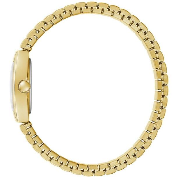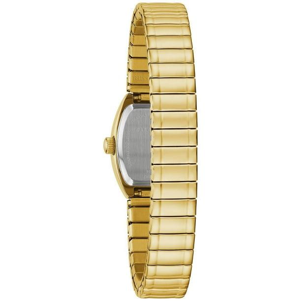 A new shape for elegant wear. Gold-ton stainless steel case with a champagne dial featuring bold, dark easy to read Arabic numerals. Mineral crystal. Gold-tone stainless steel expansion bracelet makes for easy wear.