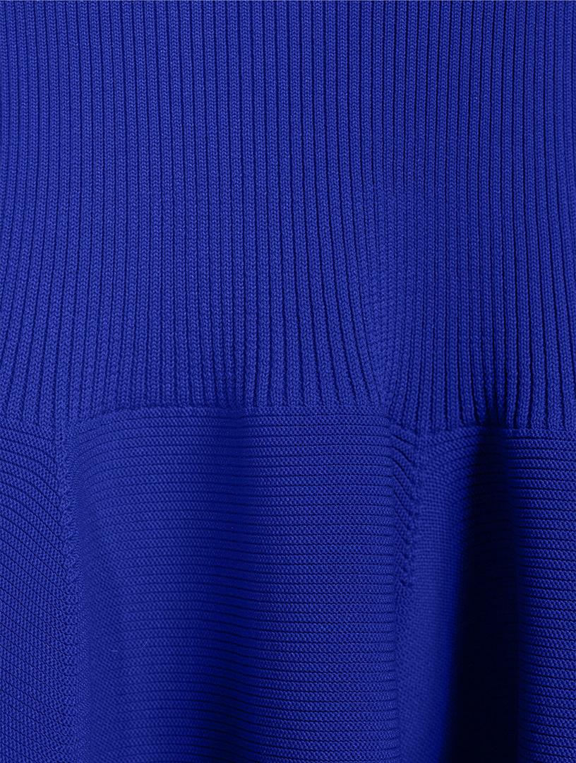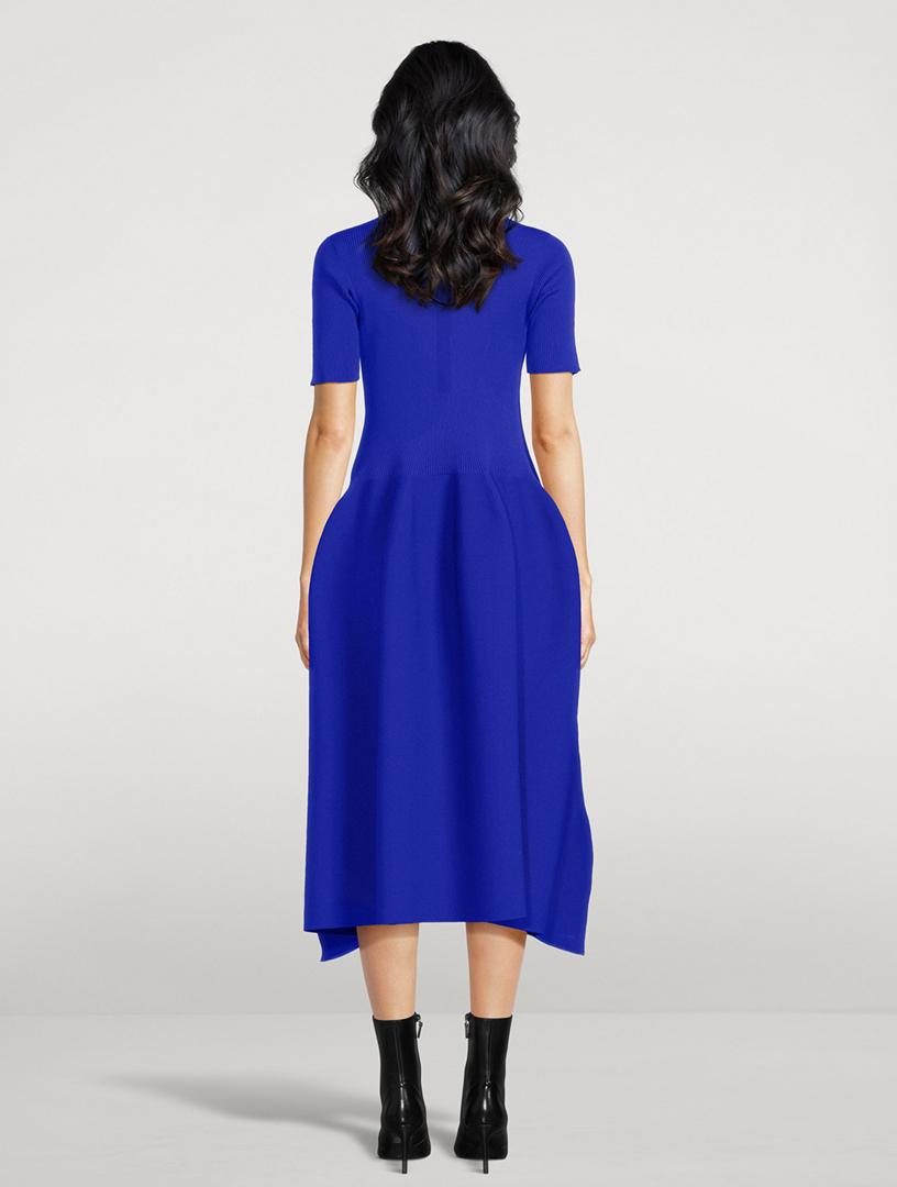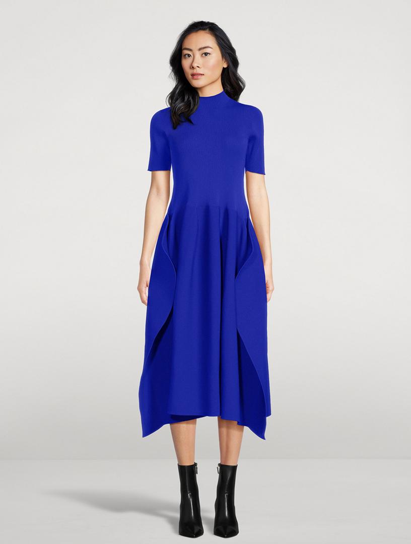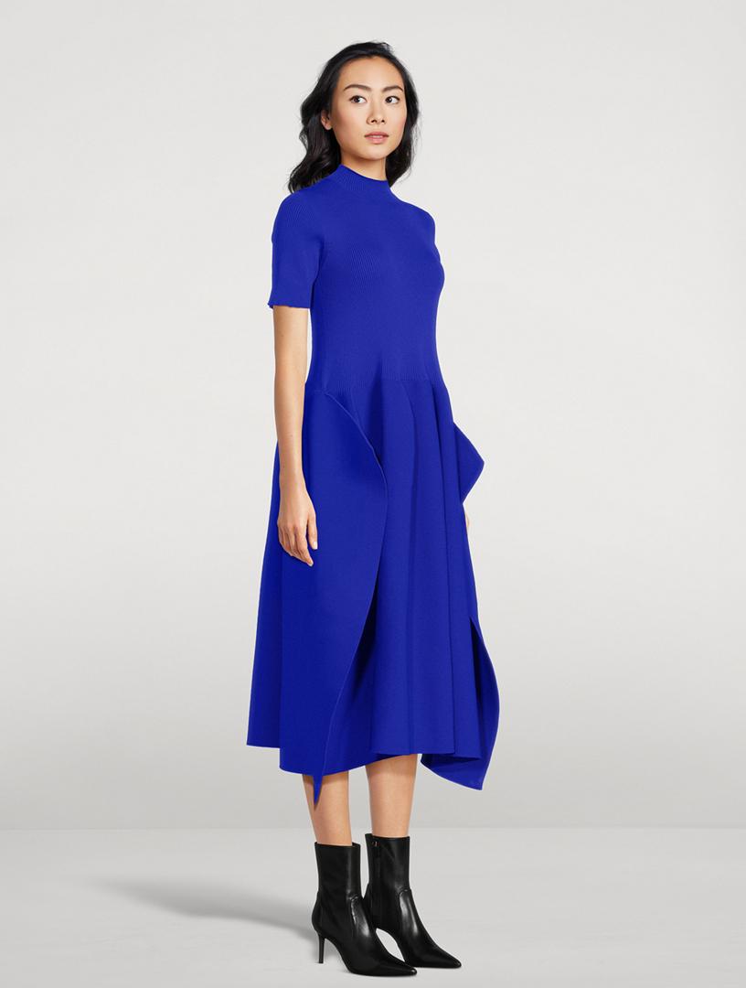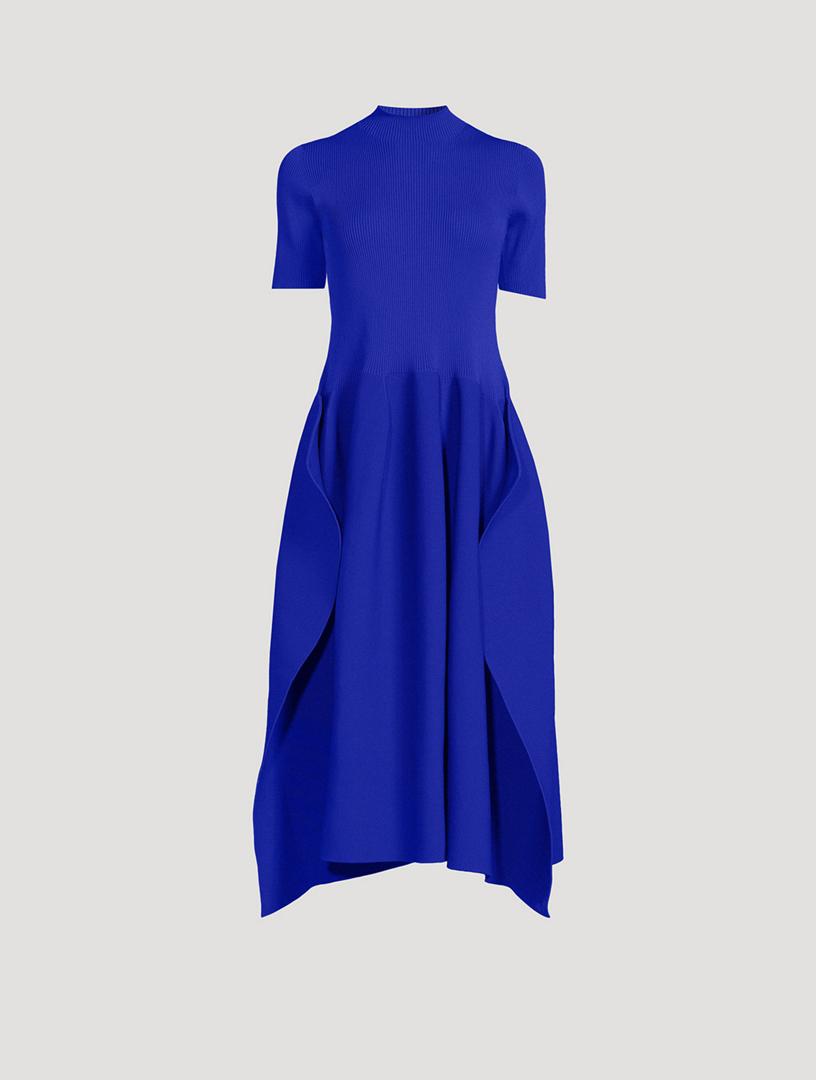 Seamless by design, this dress with geometric side pleats features a voluminous constructed form created by computer programming. 100% Recycled Polyester Mockneck Short sleeves Pull-on Made in Japan