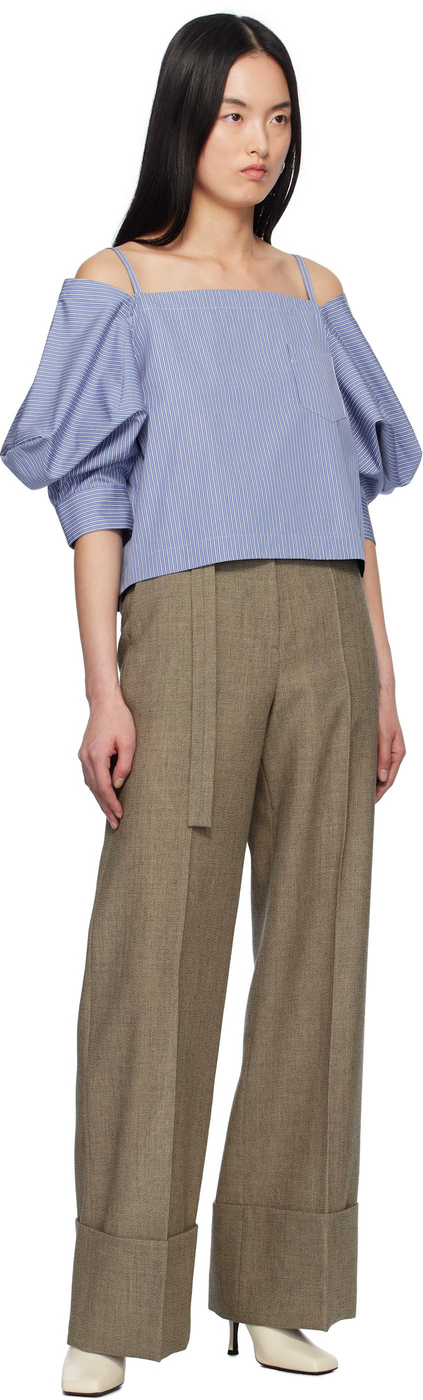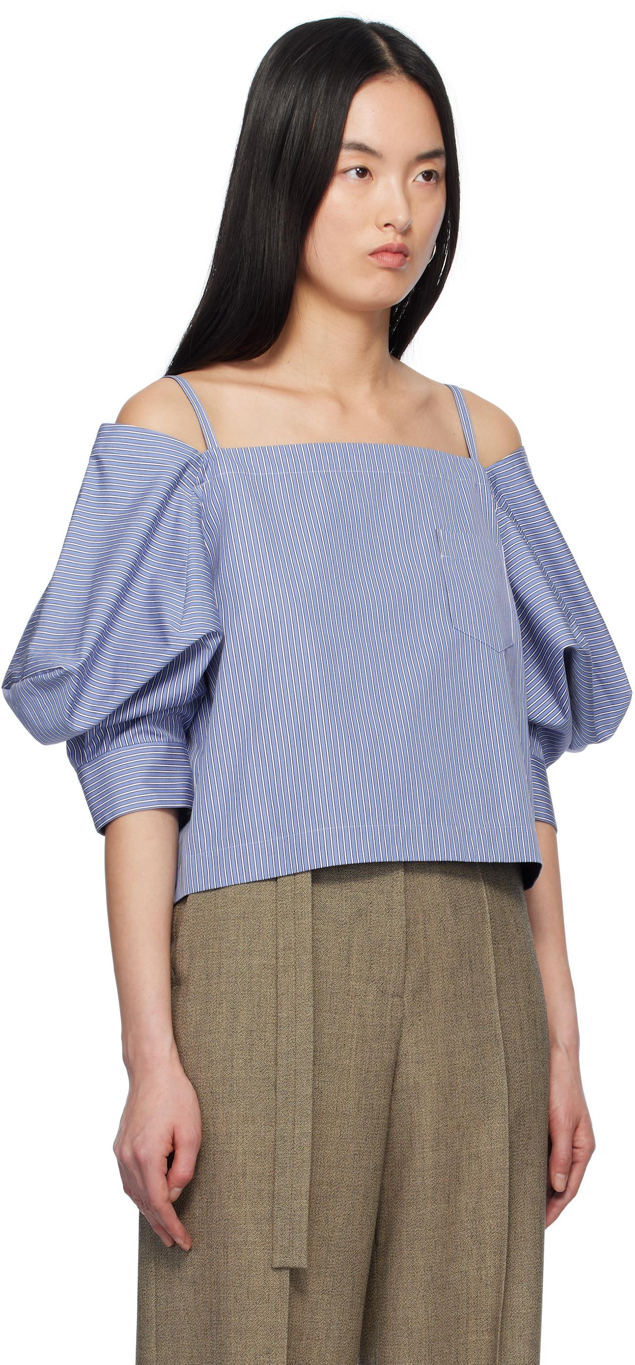 Off-the-shoulder construction · Square neck · Patch pocket at chest · Darts at modified puff sleeves · Pleats at single-button barrel cuffs · Adjustable spaghetti straps · Elasticized back collar