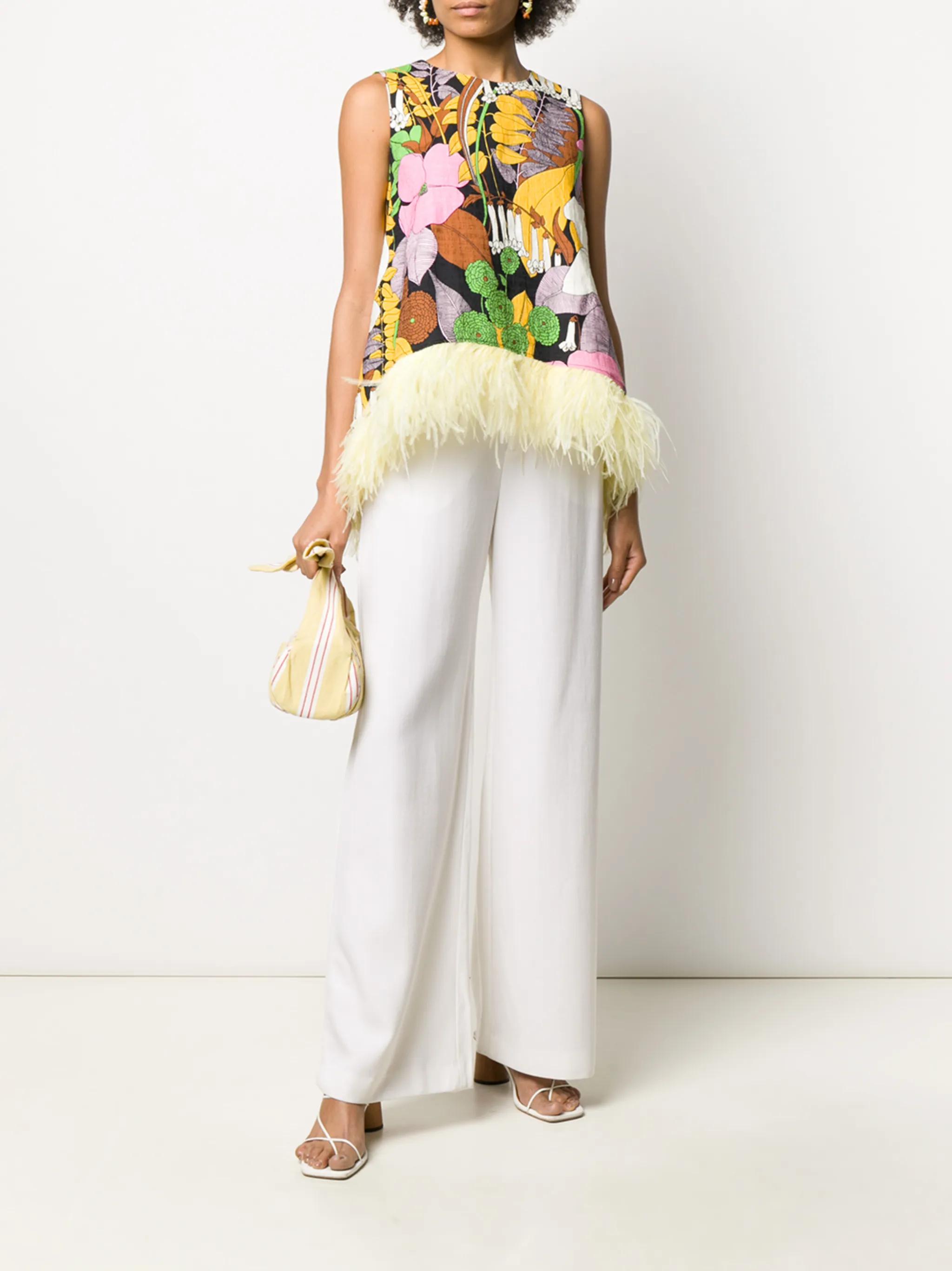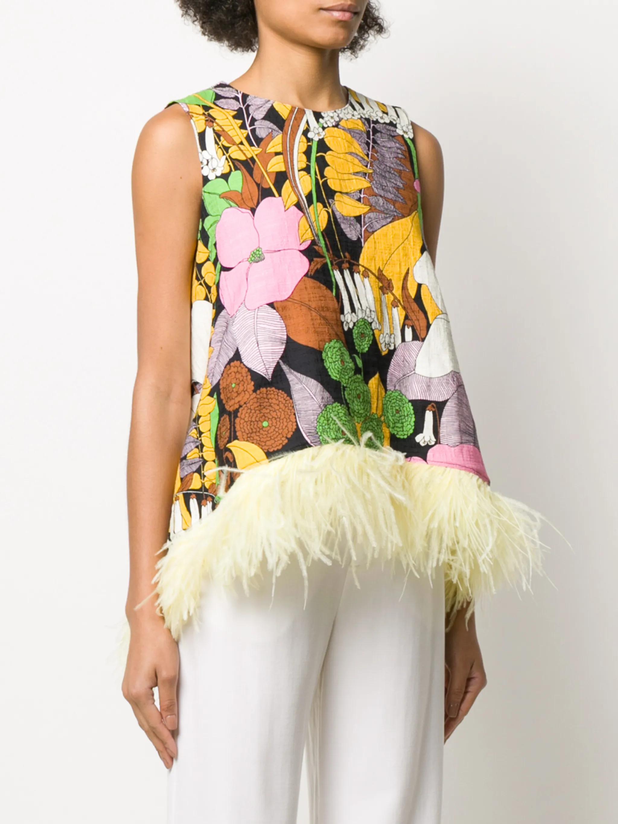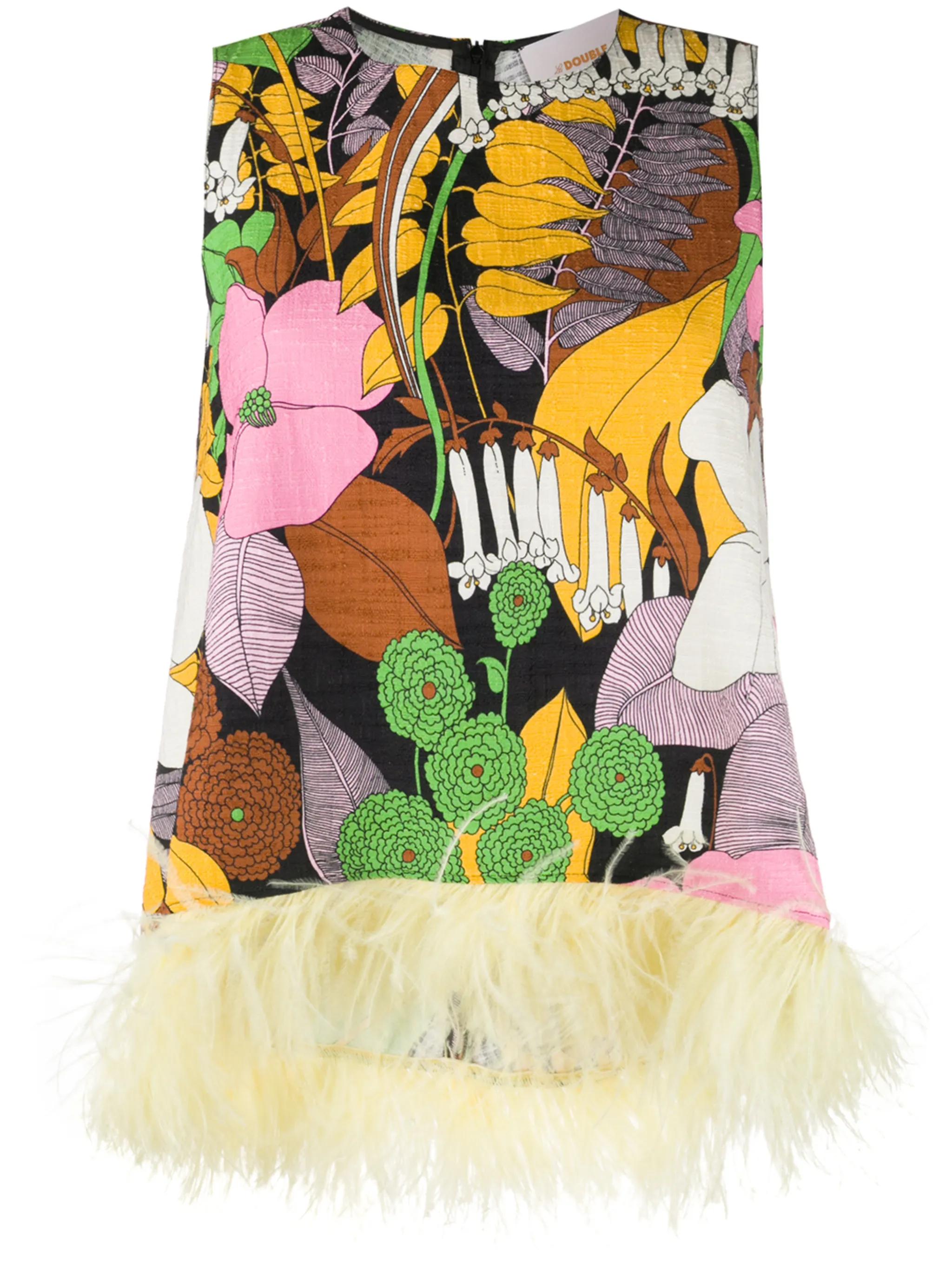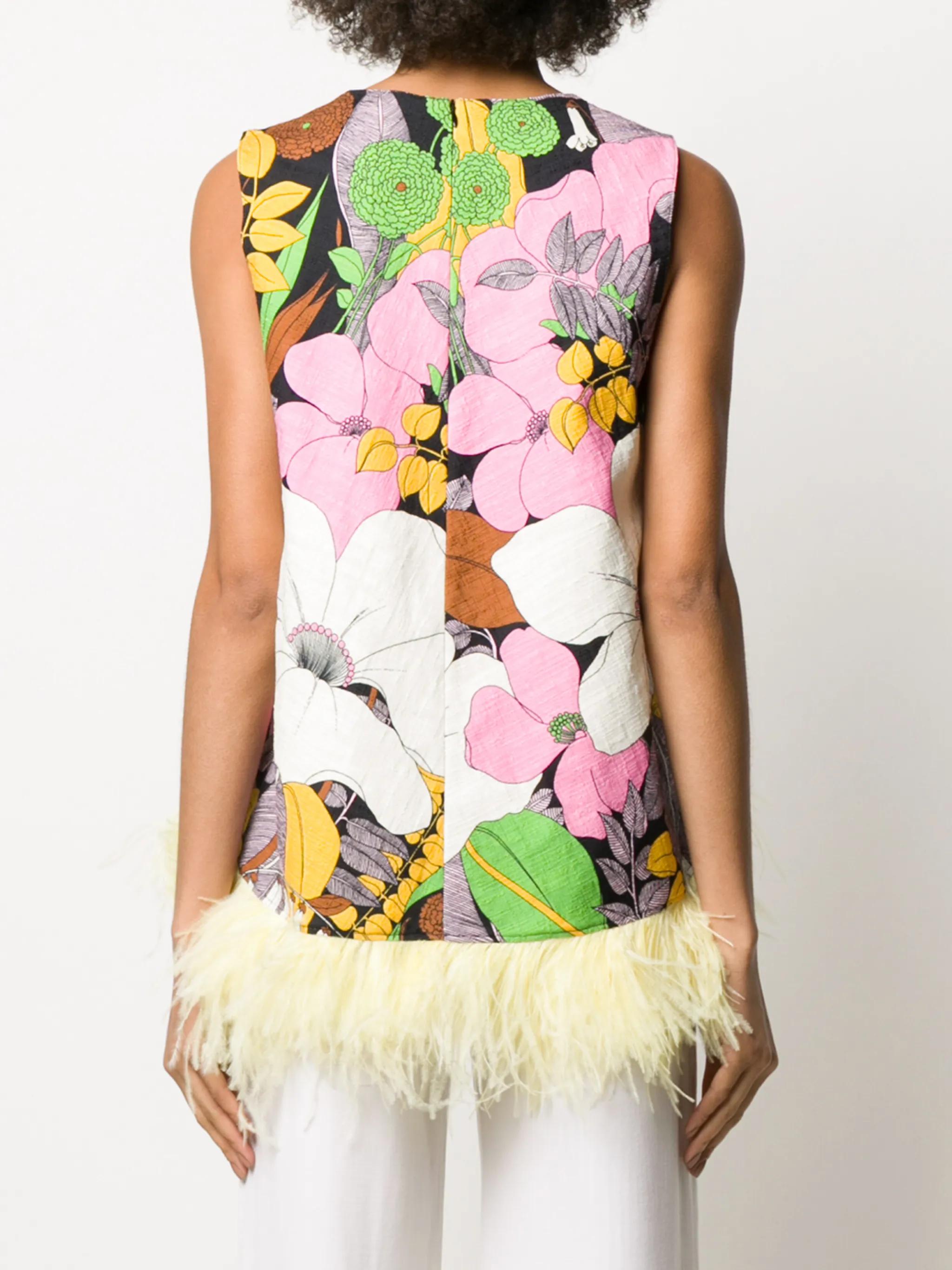 La Scala feather-embellished vest Multicoloured stretch cotton and ostrich feather La Scala feather-embellished vest from La DoubleJ featuring a round neck, a sleeveless design, a rear zip fastening, a floral print and a short length.