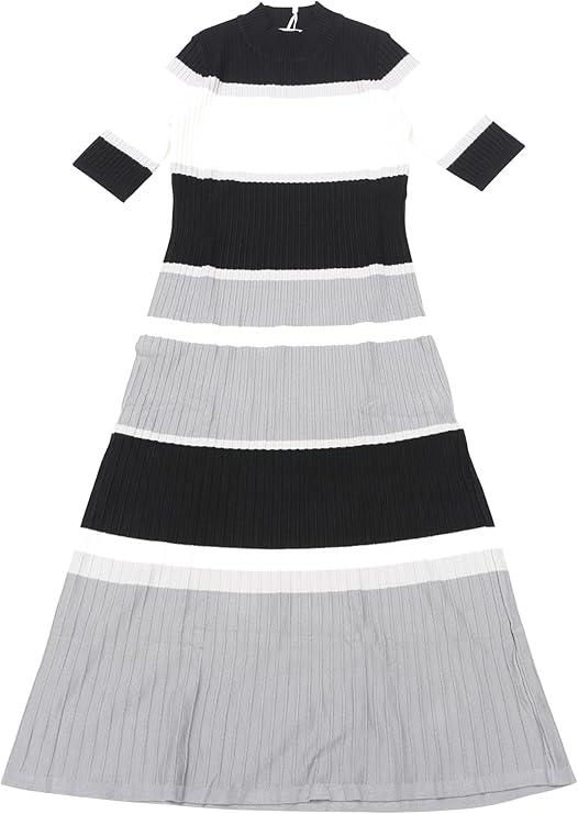 Hobemty Women's Striped Midi Dress Short Sleeve Basic Knitted A-Line Dress Grey Small
