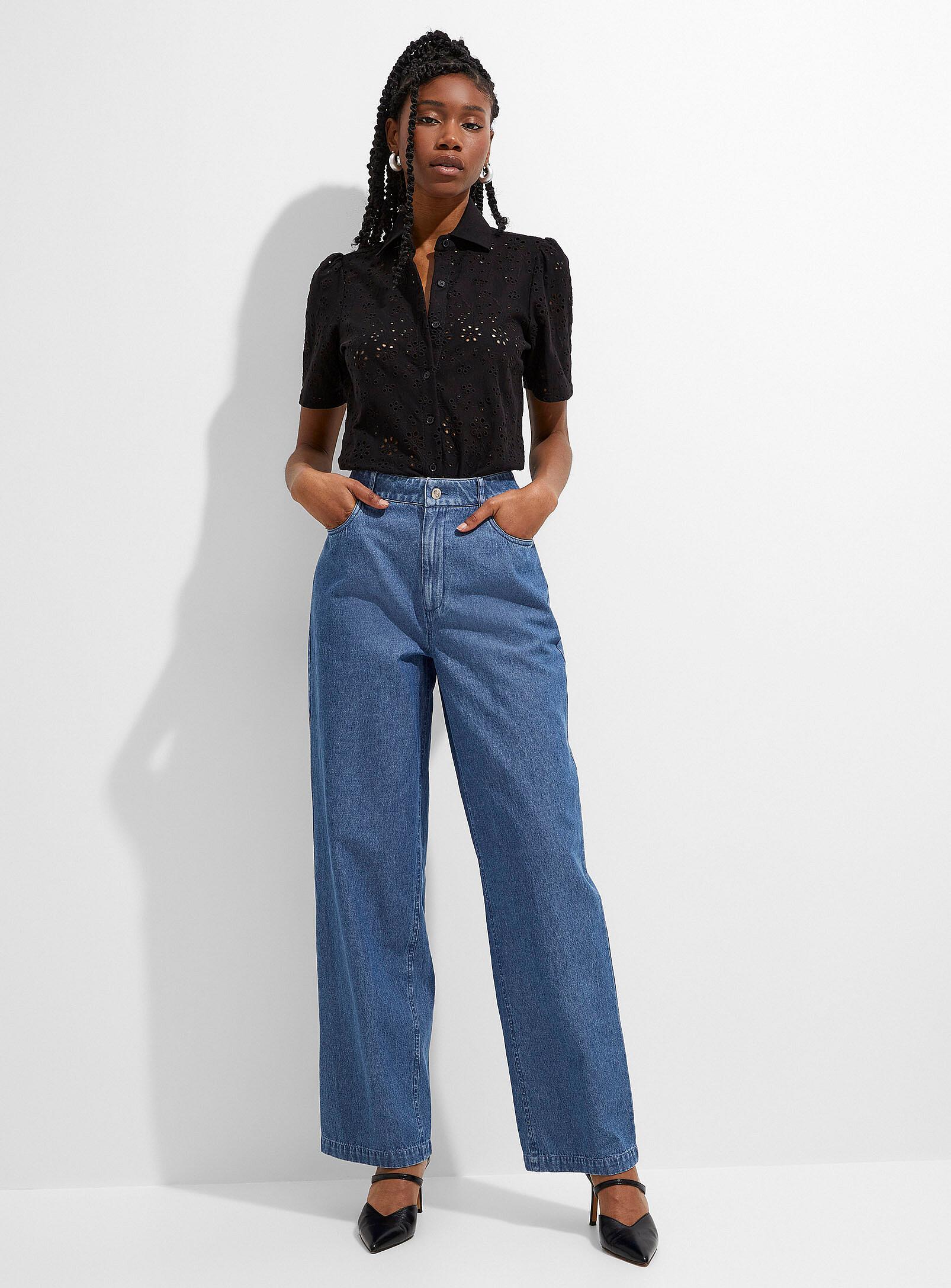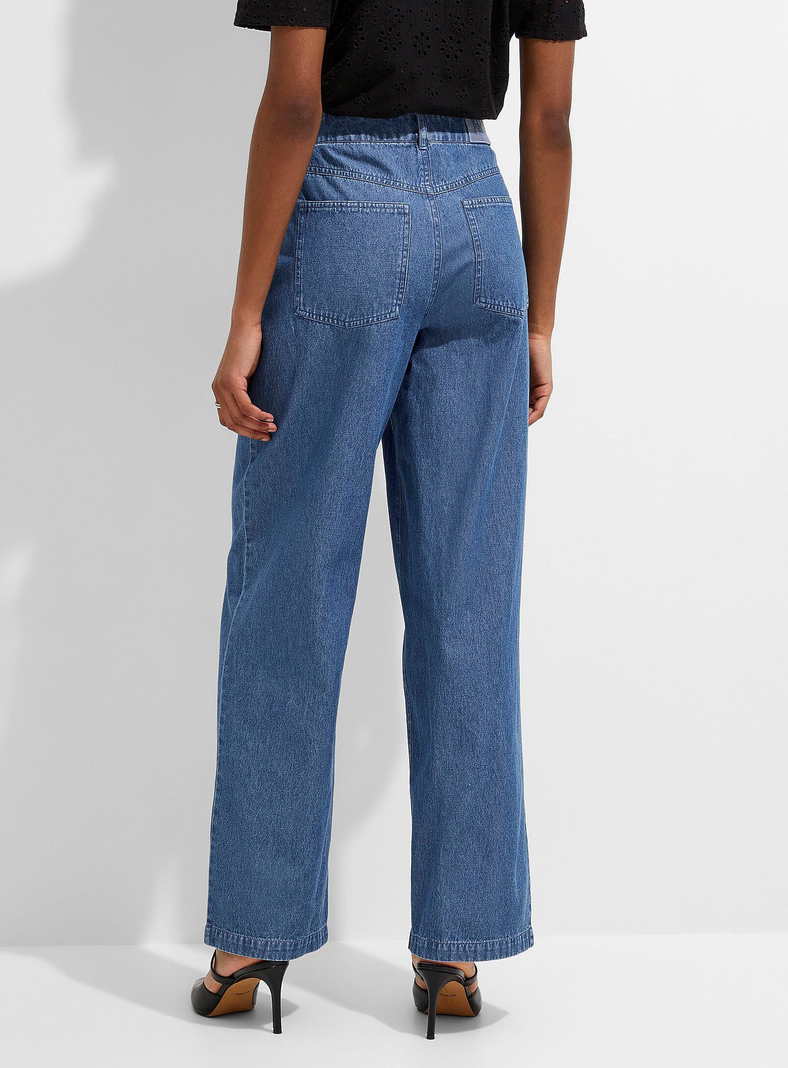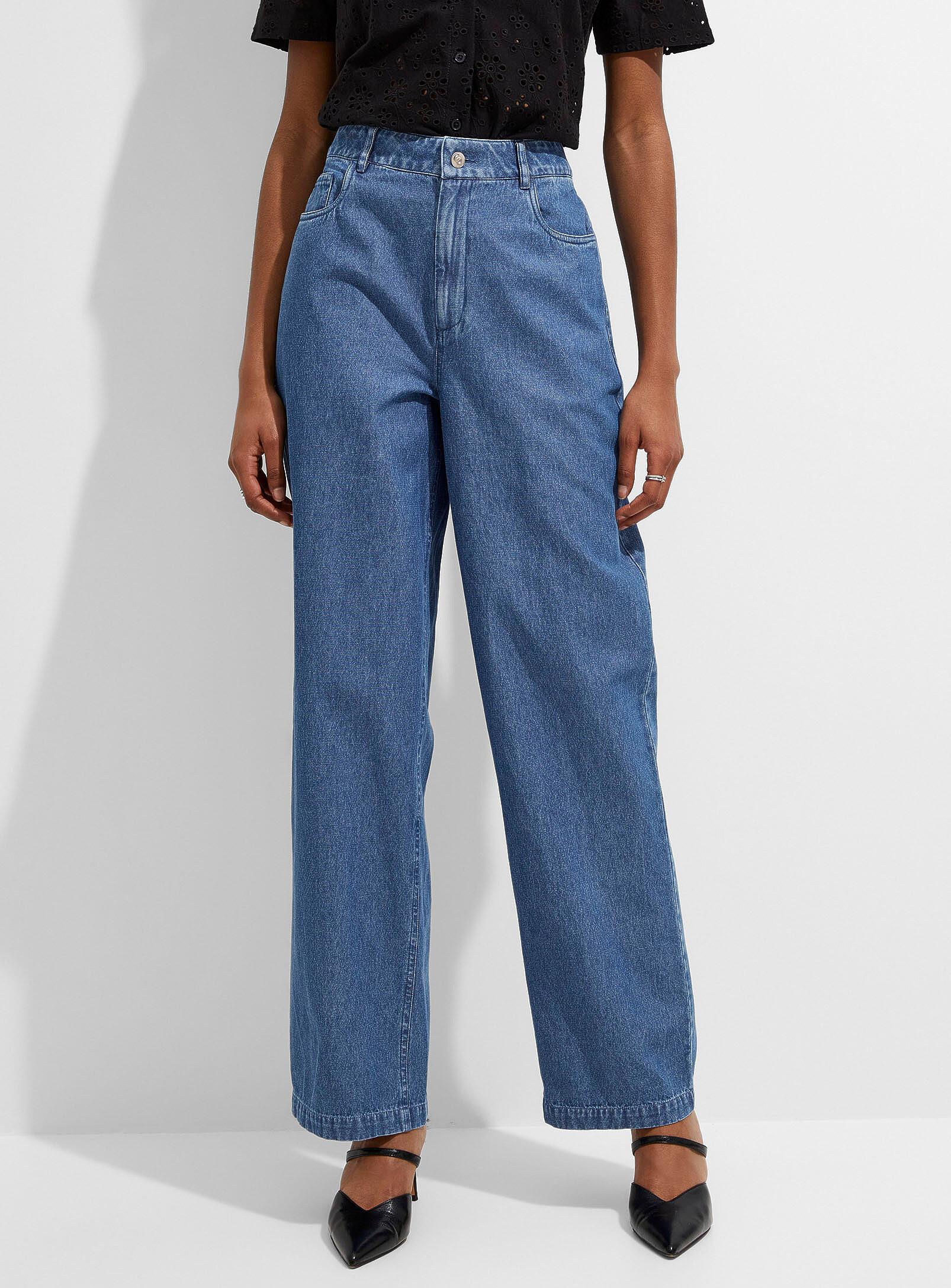 Icône - Lightweight pure cotton denim wide-leg jean Icône Icône by Simons: an exclusive designed in Canada Lightweight and non-stretch 100% cotton denim 5-pocket design Details (size small) Rise: High Fit: Straight, wide leg Rise: 12" (31 cm) Inseam length: 31.5" (80 cm) The size of the item pictured is small