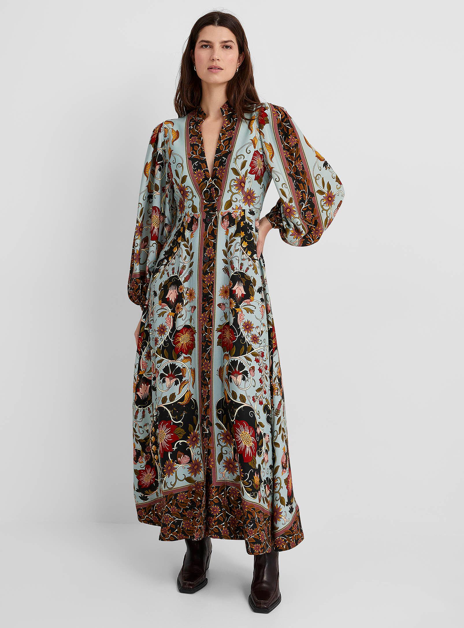 Farm Rio at Contemporaine Positive and invigorating energy empowers this Brazilian label, creating fascinating nature-inspired patterns. It presents a majestic bohemian-inspired piece that blends a palette of serene blue colours with rich earthy tones. Its elongated silhouette, flowy fabric, and puff sleeves imbue it with an ultra-elegant and feminine look. Fabric Flowy 100% rayon fabric with a heavy drape Unlined Style Fit-and-flare style that slims the waist and follows an A-line to the hem Full length