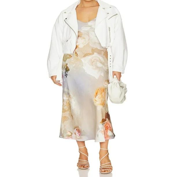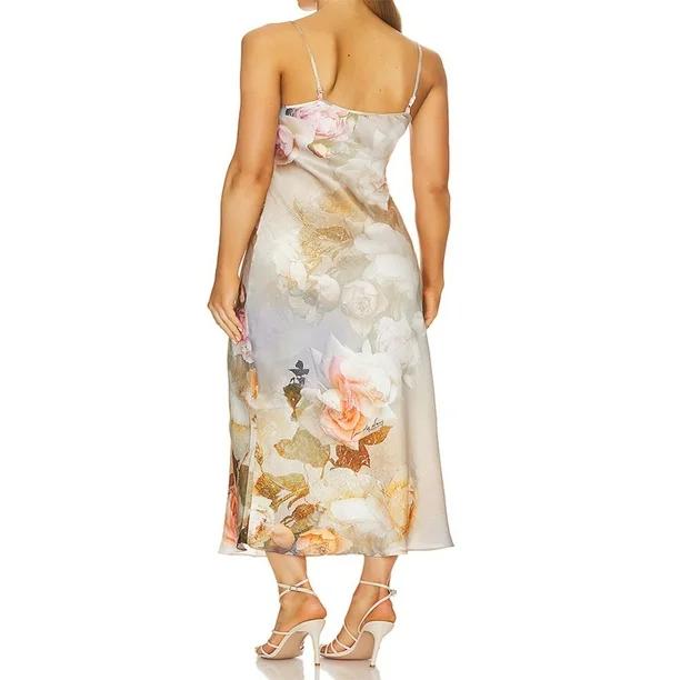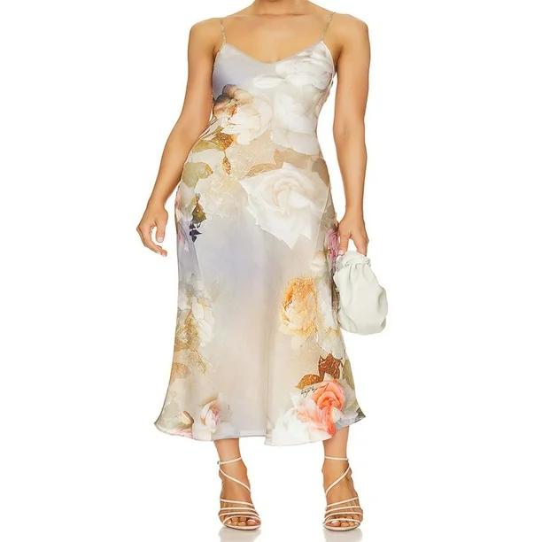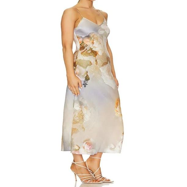 Women‘s Elegant Sleeveless Spaghetti Strap Satin Dress Floral Print Party Long Dress Evening Gown