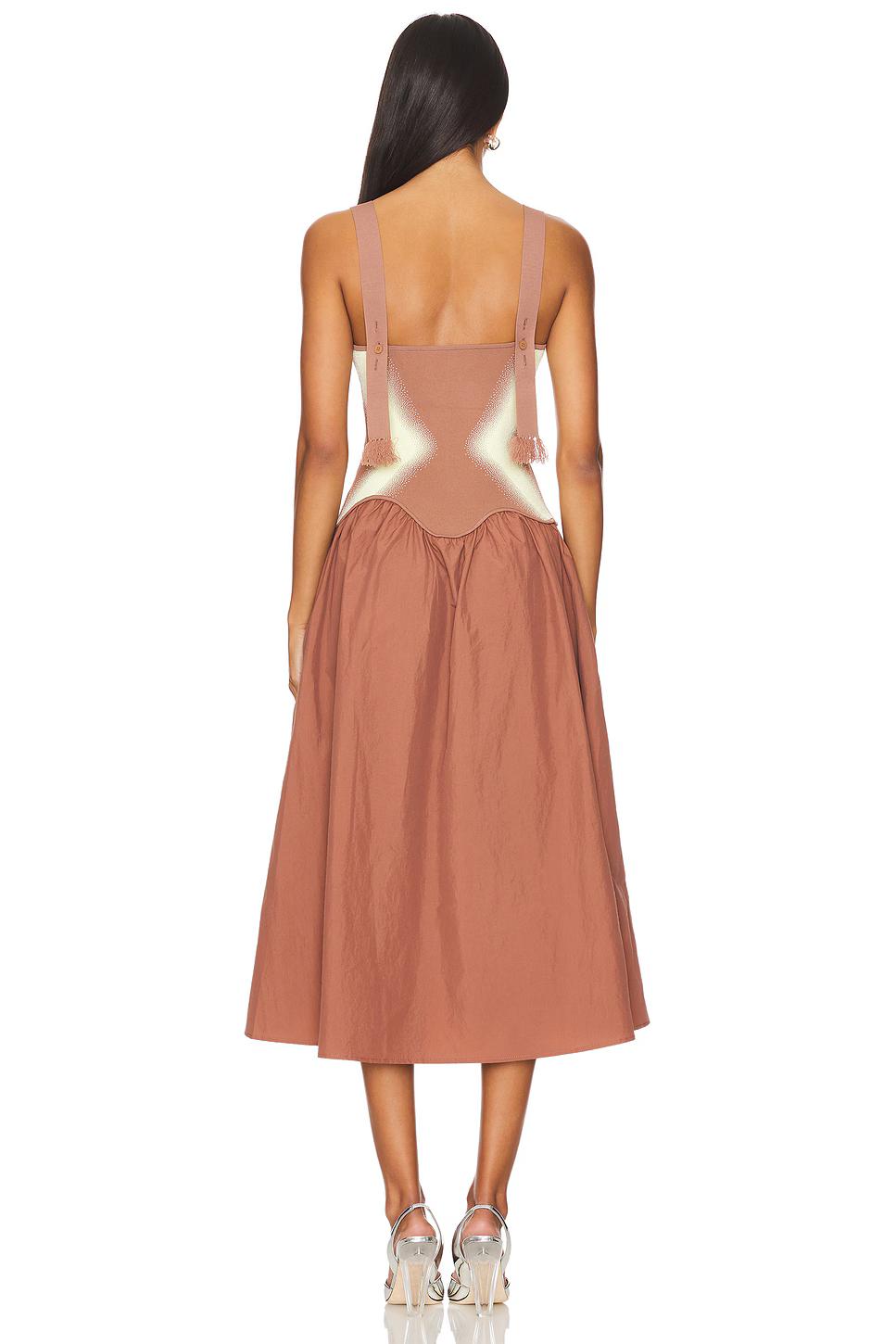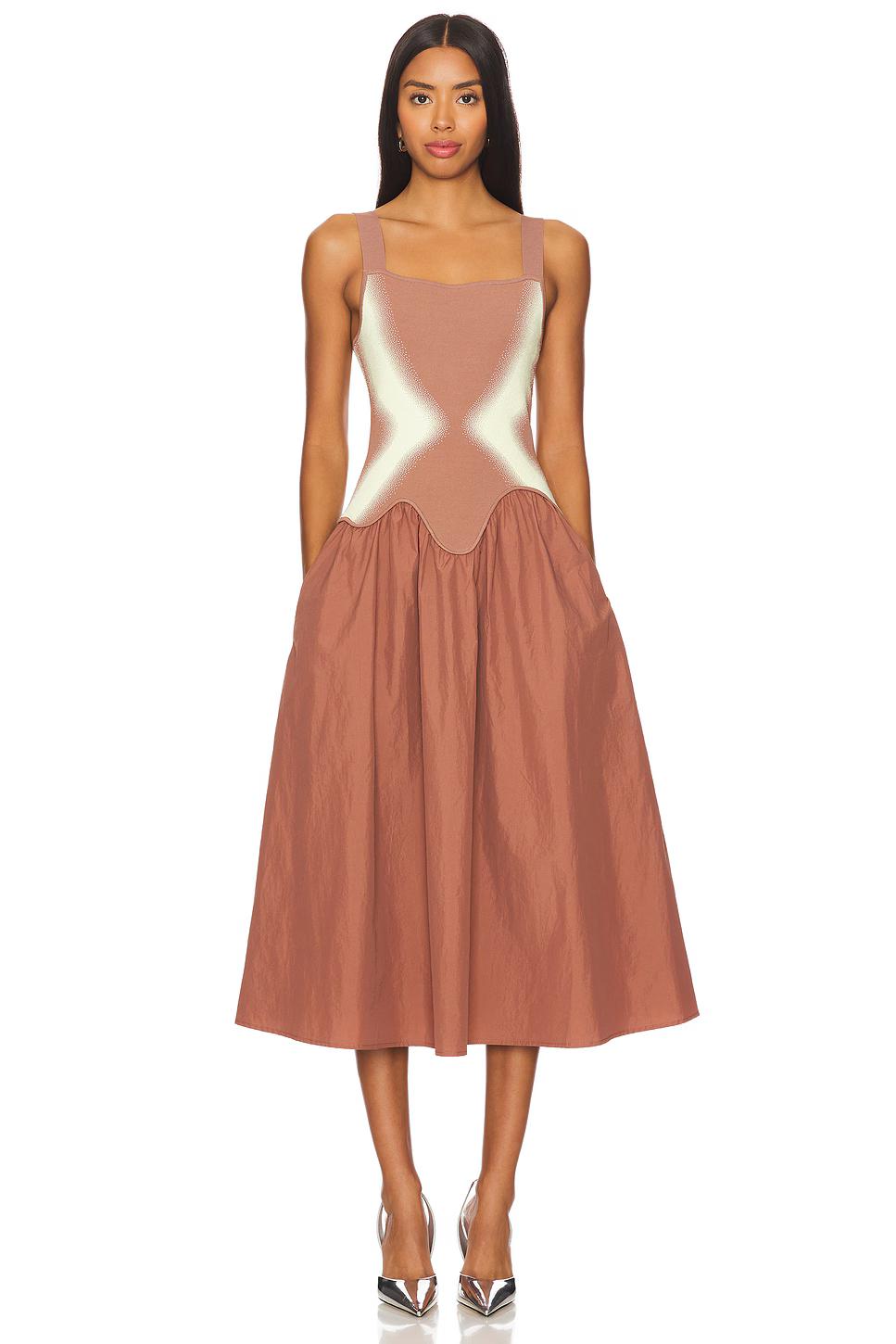 Top: 78.1% recycled viscose, 14.8% recycled rayon, 5.5% polyester, 1.6% spandex Bottom: 73.4% nylon, 26.6% cotton Made in China Machine wash Unlined Ponte bodice Poplin skirt Revolve Style No. PH5R-WD13 Manufacturer Style No. FW24DR004