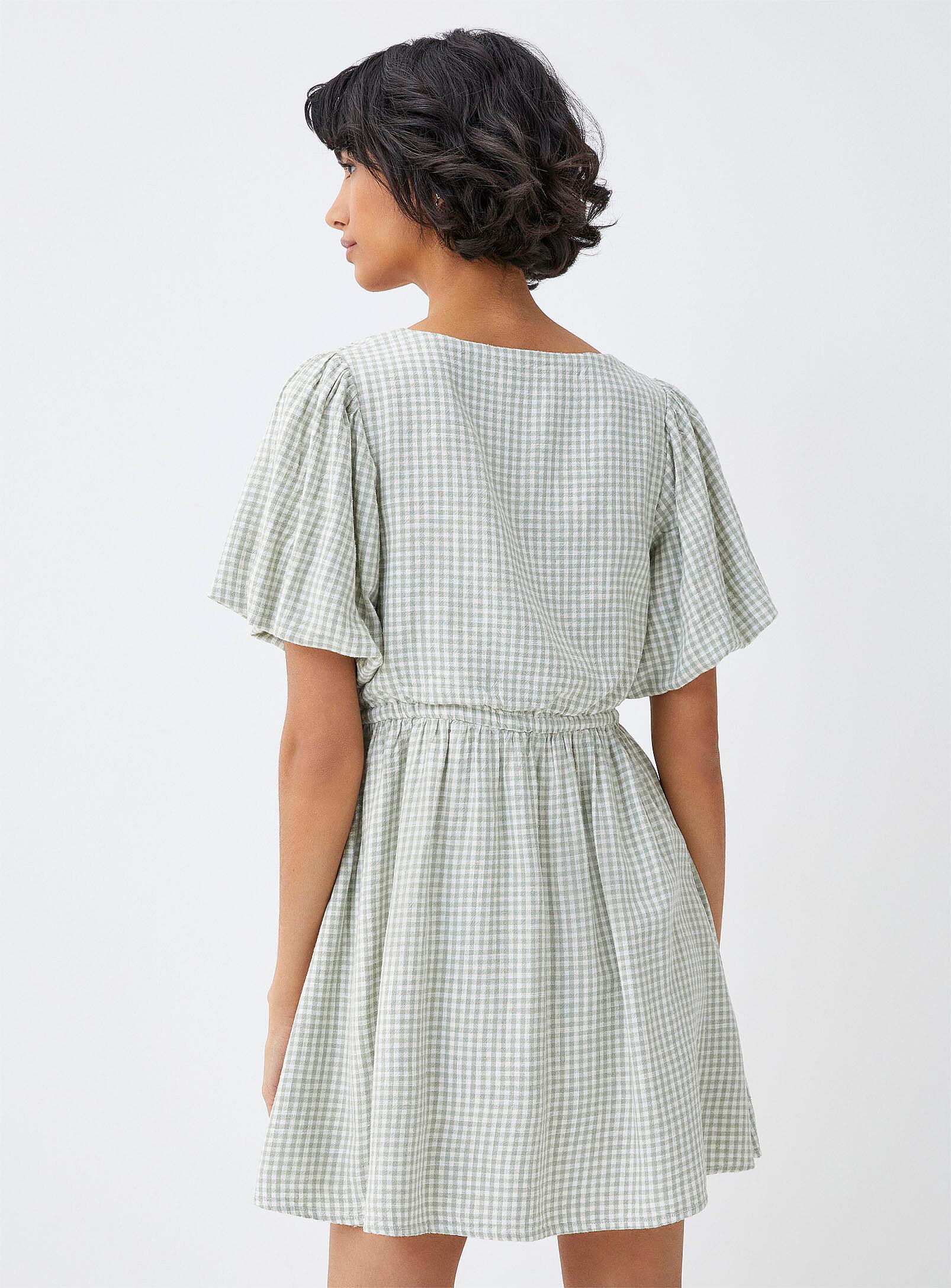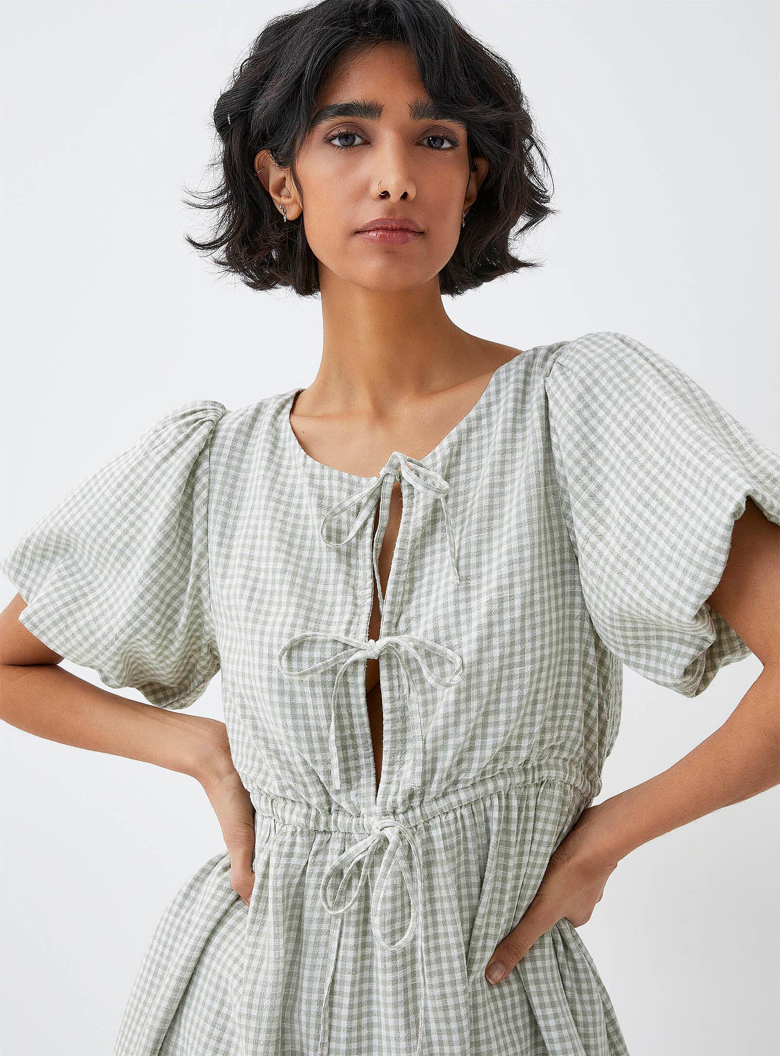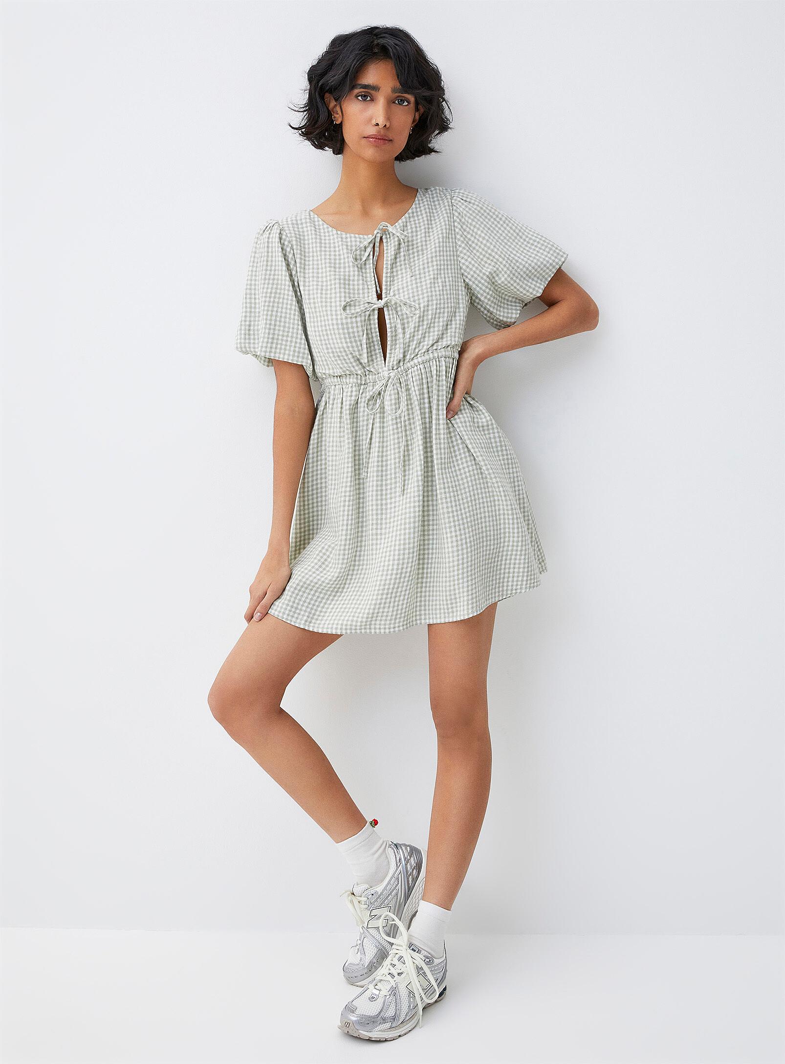 Women > Dressesbr>Twik - Bow puff-sleeve dress Twikbr>b>Twik by Simons: an exclusive designed in Canada/b>br>ul>li>Openings with bows at the front/li>li>Puff sleeves/li>li>Lightweight fabric in a linen and LENZING ECOVERO viscose blend/li>li>Organic cotton lining/li>li>Covered elastic at the waist/li>li>Loose fit/li>/ul>br>br>The size of the item pictured is smallbr>br>Length: 32.75" (83.0 cm), from the top of the shoulder