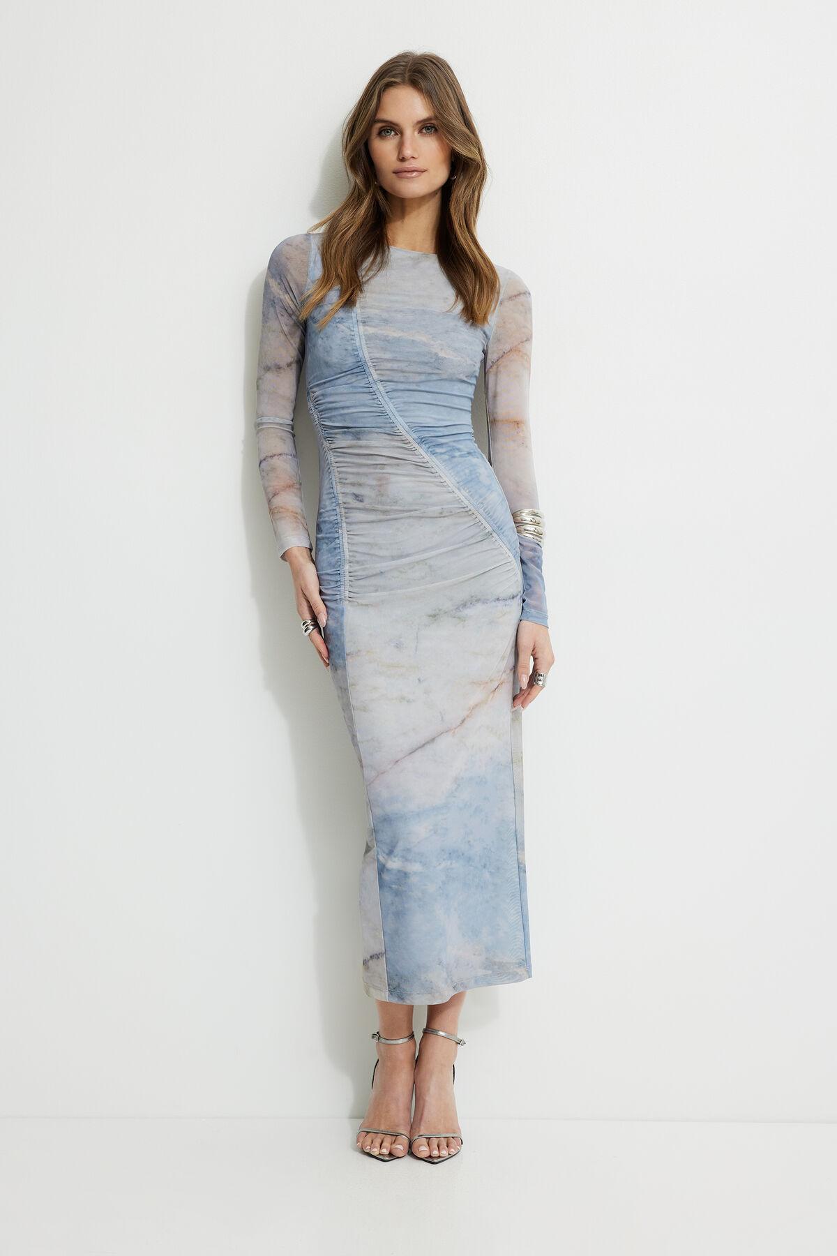 This semi-sheer mesh maxi dress is designed to have a fitted silhouette. Wear it with a jacket on a night out. Features - Asymmetric shirring - Crewneck - Long sleeves - Lined Size & Fit - Fitted - Stretch fabric - Model is wearing size XS Materials & Care - 90% recycled polyester, 10% spandex - Hand wash, cold - Imported