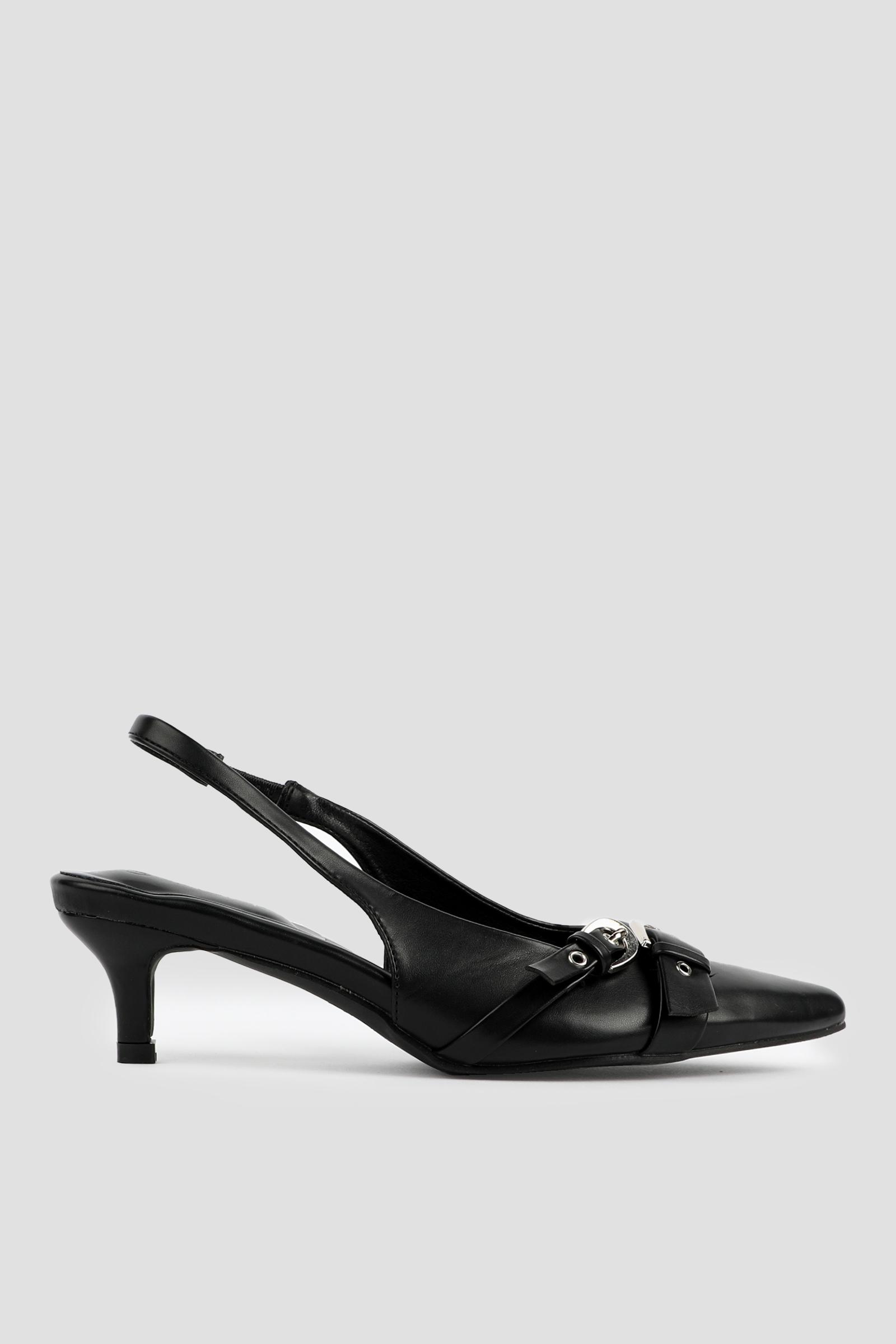 Exclusive piece from our Ardene Contemporary Wear Party collection. Eco-conscious faux leather heels. Pointy toe Buckle strap details Upper: recycled polyurethane Elasticized strap Lining in recycled textile Heel height: 3,5 in Comfort foam insole PVC outsole | Ardene A.C.W. Kitten Heel Slingback Pumps in Black | Size 6 | Faux Leather | Eco-Conscious