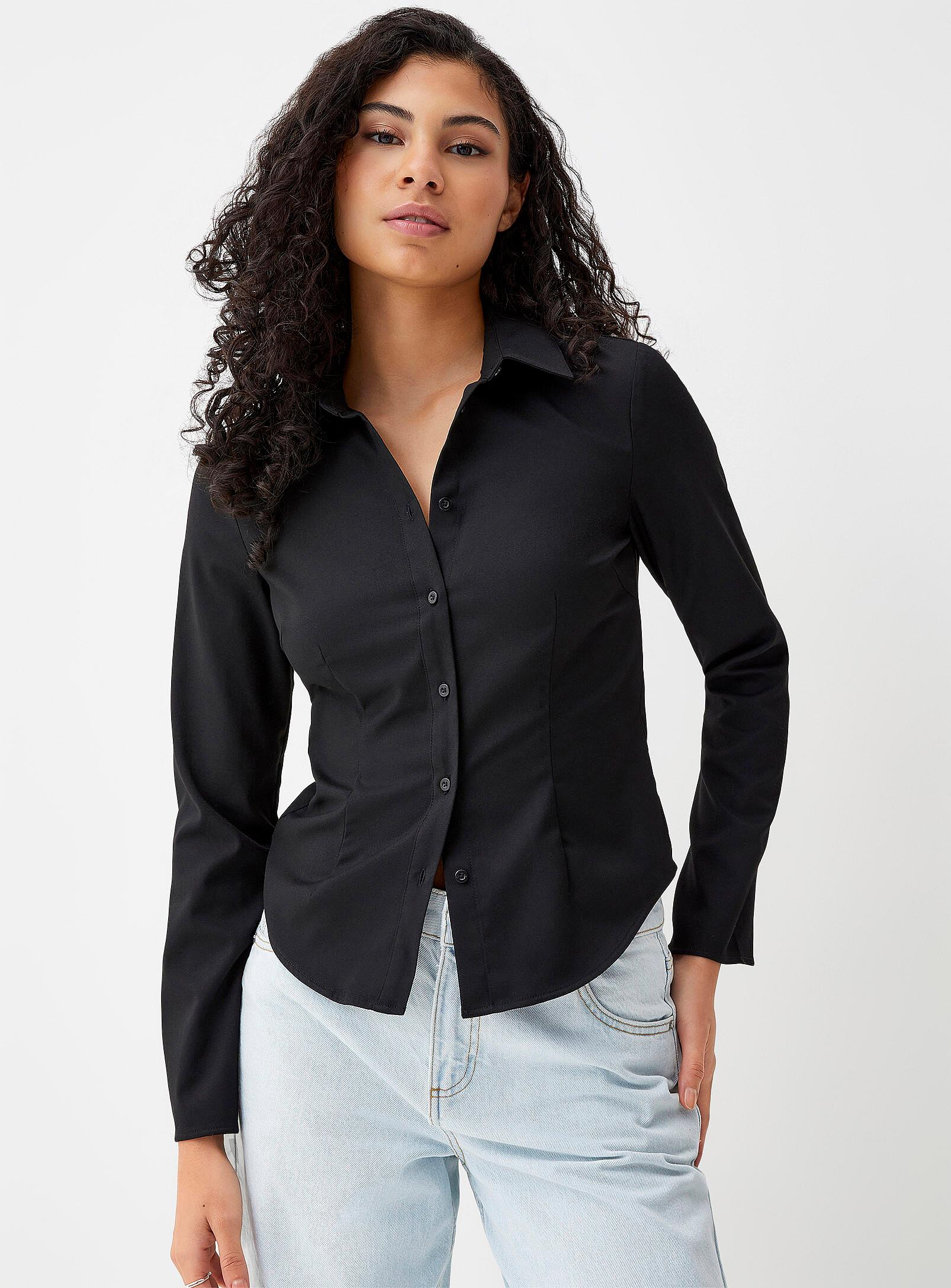 Women > Blouses & Shirts > Collared Shirtsbr>Twik - Fitted stretch shirt Twikbr>b>Twik by Simons: an exclusive designed in Canada/b>br>ul>li>Stretch fabric/li>li>Buttons down the front/li>li>Fitted style/li>/ul>br>br>The size of the item pictured is small