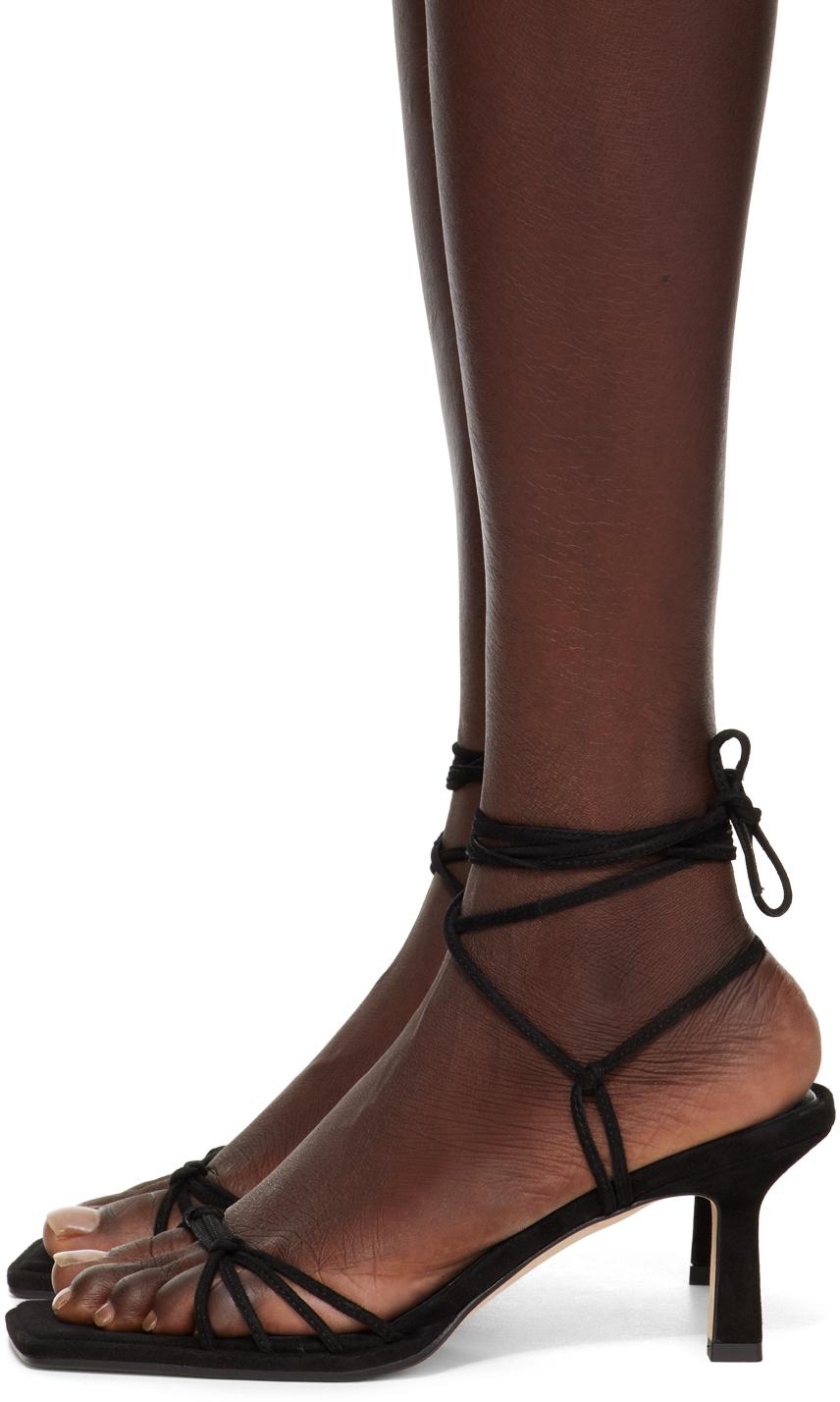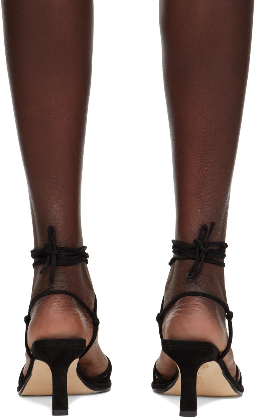 Lambskin suede heeled sandals in black. · Open square toe · Knotted detailing at vamp and ankle · Wraparound self-tie ankle strap · Logo stamp at padded footbed · Buffed leather lining · Covered stiletto heel with rubber injection · Suede sole · Heel: H2.75 Supplier color: Black.