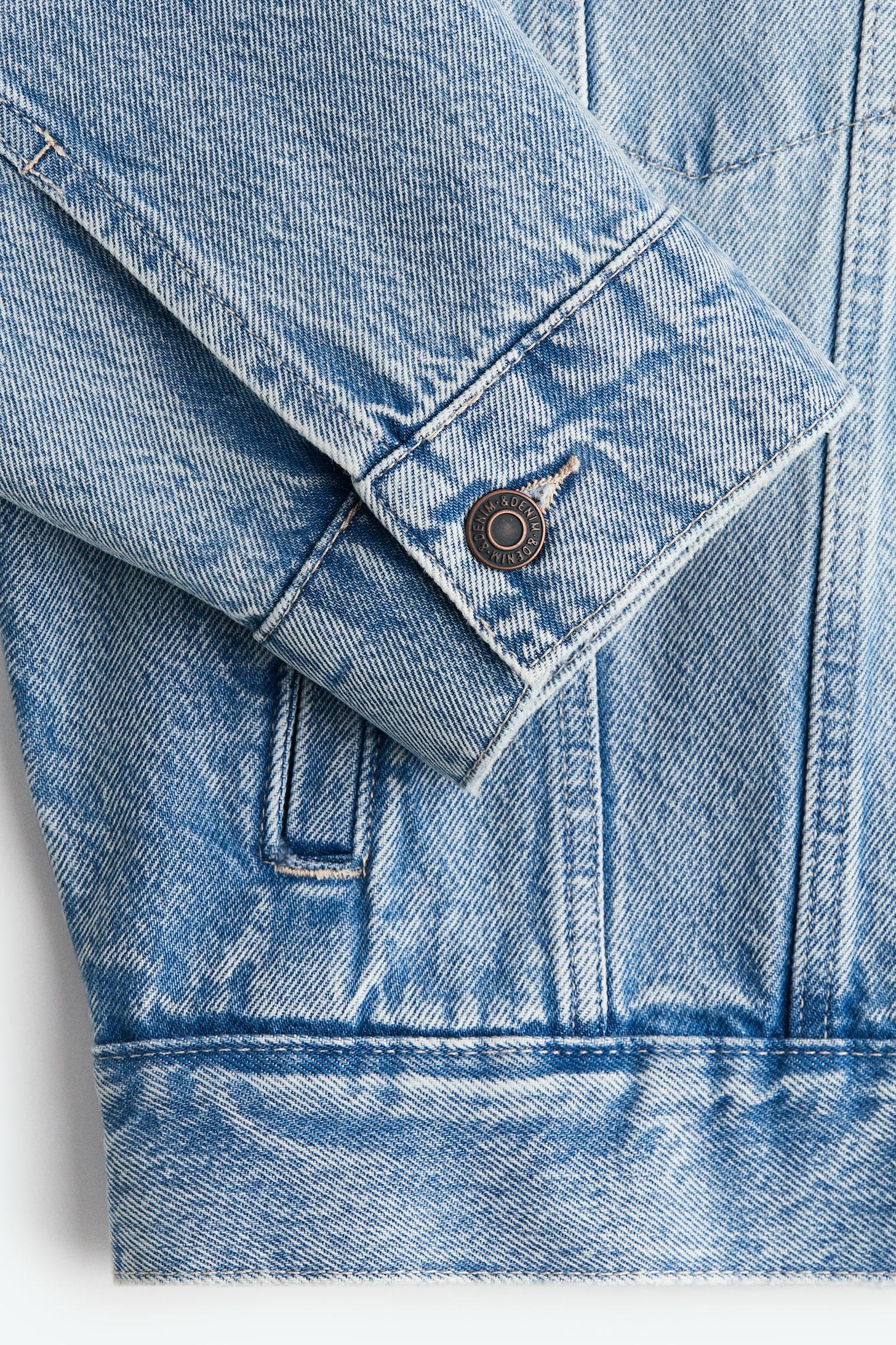 Oversized, trucker-style jacket in rigid cotton denim. Collar, metal buttons at front, chest pockets with flap and button, and a yoke at front and back. Forward-facing shoulder seams, dropped shoulders, and button at cuffs. Adjustable tab at sides of hem with buttons.