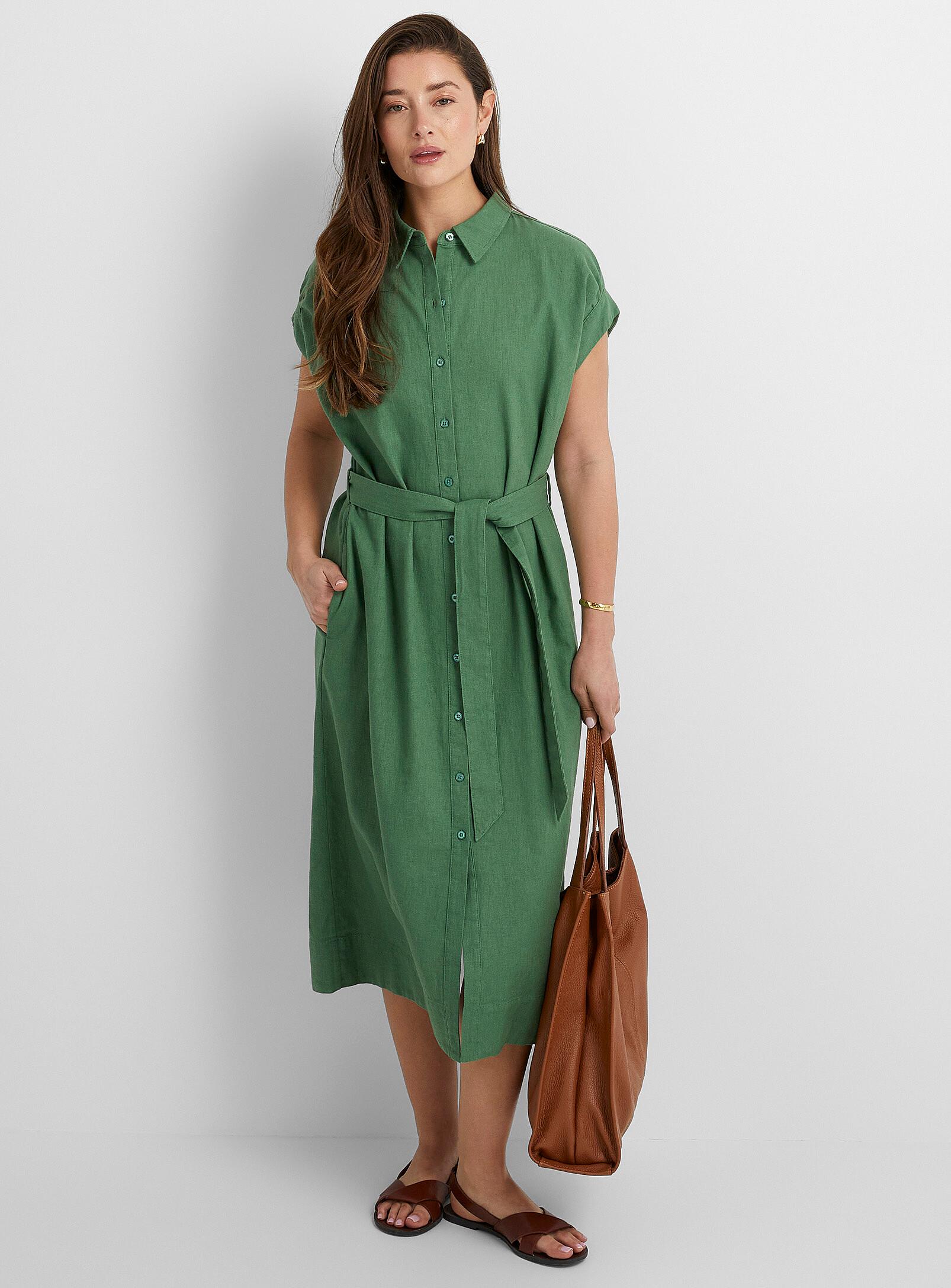 Contemporaine - Belted linen blend dress Contemporaine Contemporaine by Simons: an exclusive designed in Canada Fabric Lightweight fabric in an organic linen and cotton blend Style Fit-and-flare style that slims the waist and follows an A-line to the hem Midi-lenght Details Shirt collar Buttons down the front Matching belt to tie at the waist Puffy cape sleeves Central slit at the front The size of the item pictured is small Length: 46.50" (118.0 cm), from the top of the shoulder