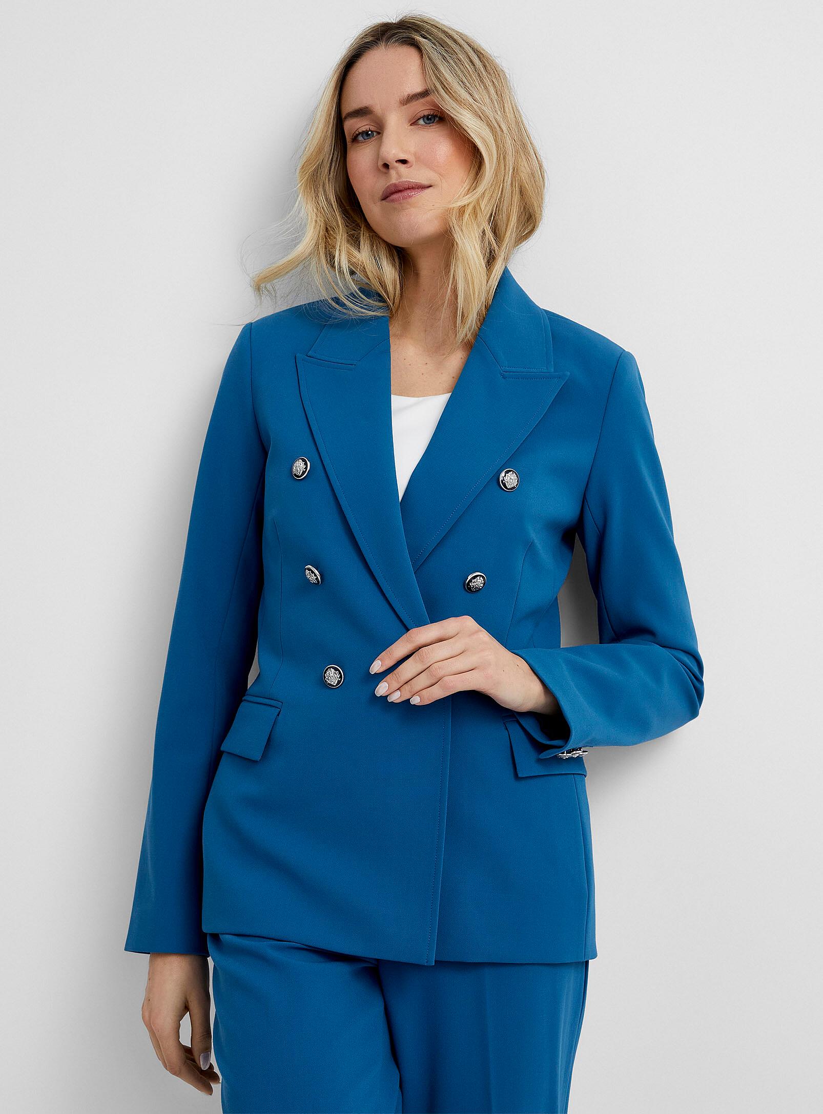 Contemporaine - Crest-button double-breasted blazer Contemporaine Contemporaine by Simons: an exclusive designed in Canada Stretch polyester-blend twill made from recycled plastic bottles Made of forest-friendly viscose Built-in fine satiny lining Crossover style with double-breasted buttoning Regular fit Piped flap pockets Peaked lapel Built-in shoulder pads The size of the item pictured is 4