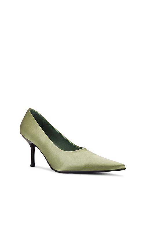 Jeffrey Campbell Chosen Pump in Olive. Size 10, 6, 7.5, 8. Satin upper with manmade sole. Made in China. Slip-on styling. Faux leather footbed with leather lining. Pointed toe. Approx 83mm/ 3.25 inch heel. JCAM-WZ1920. CHOSEN. Step into comfort and fashion this season with these new shoes from Jeffery Campbell. Made with premium leather and a German sole. These pretty babies will keep you coming back for more.