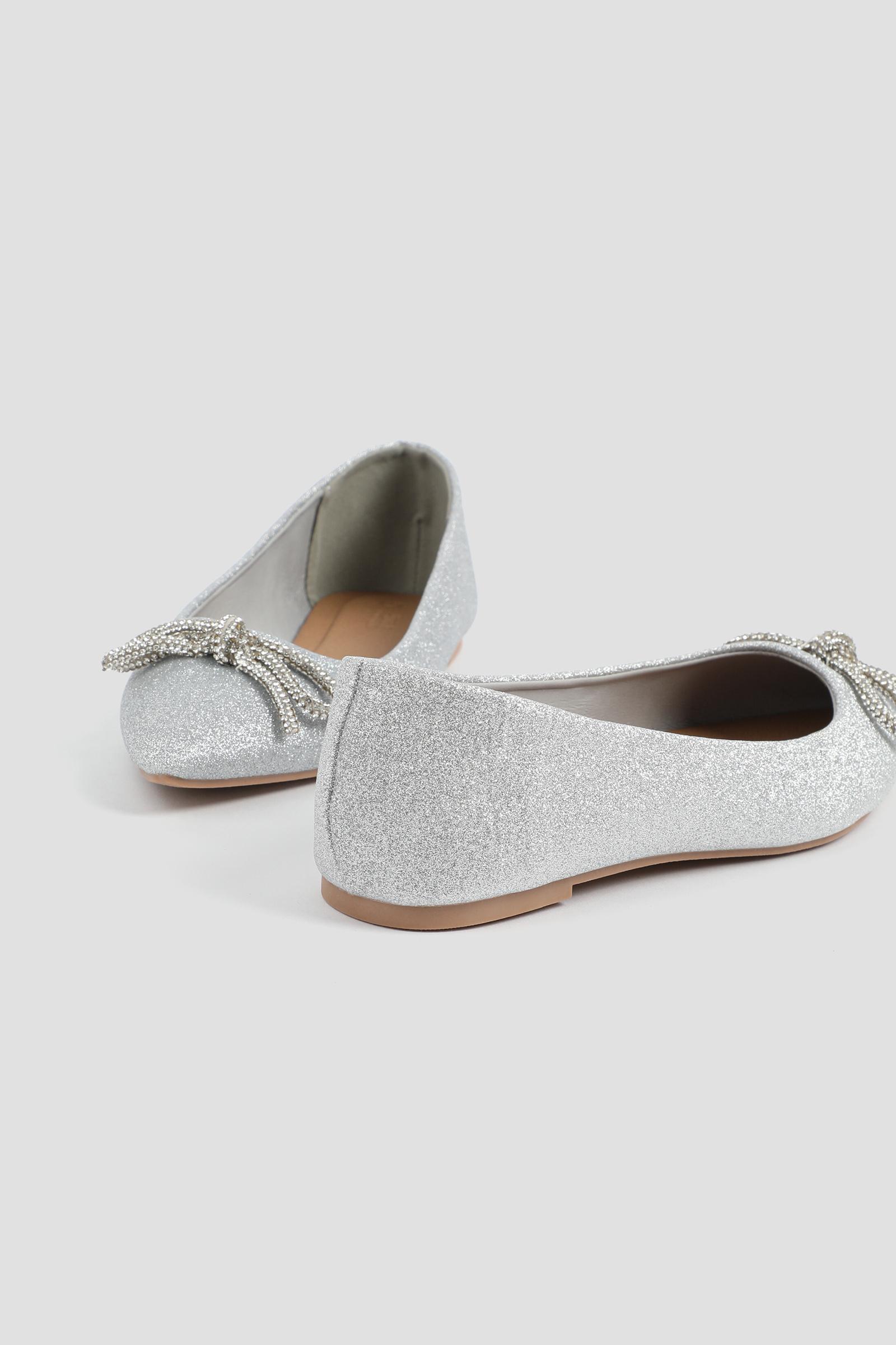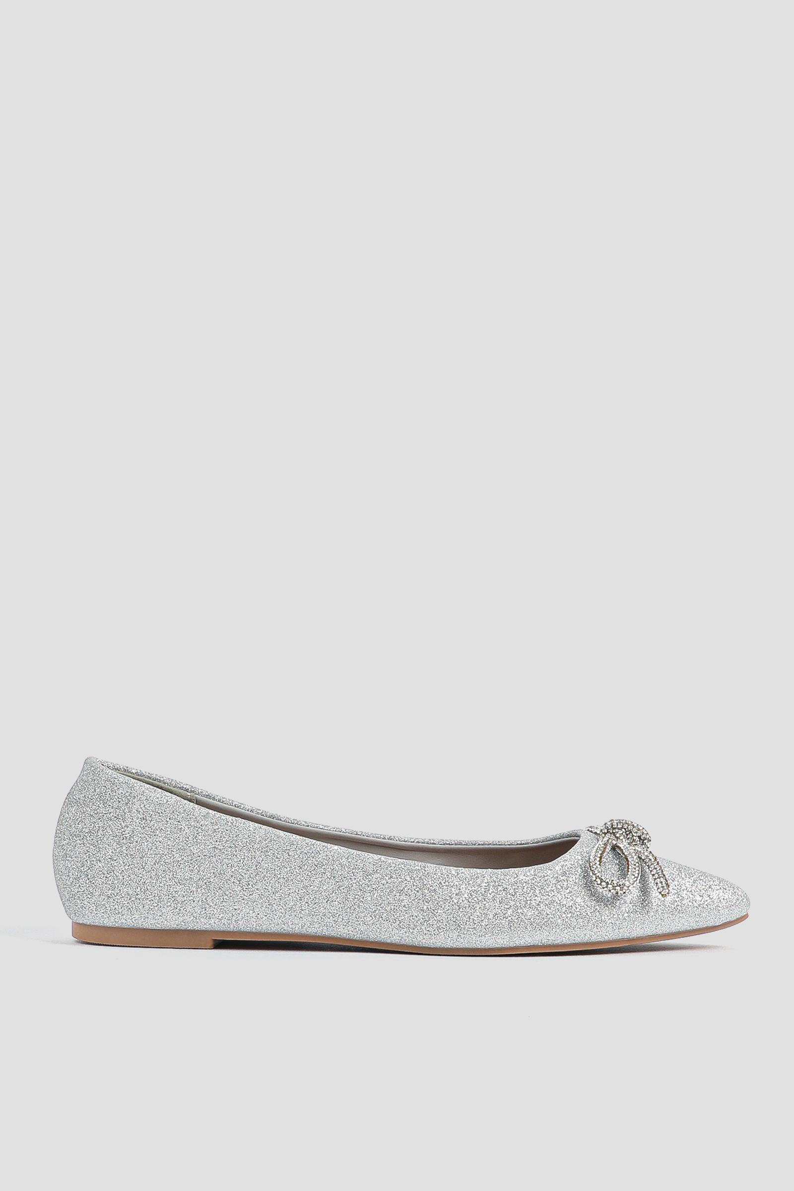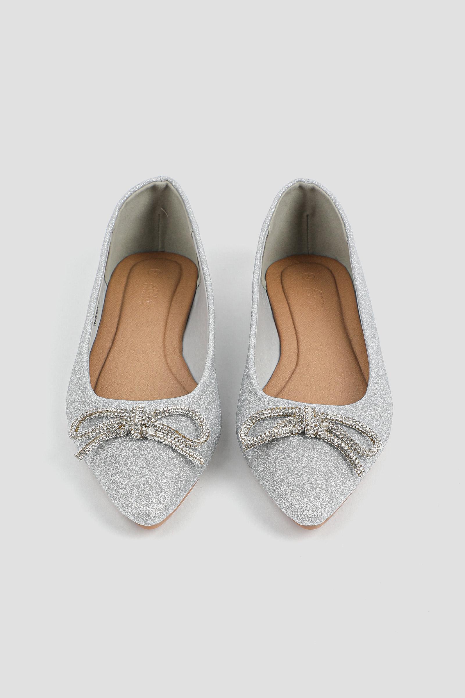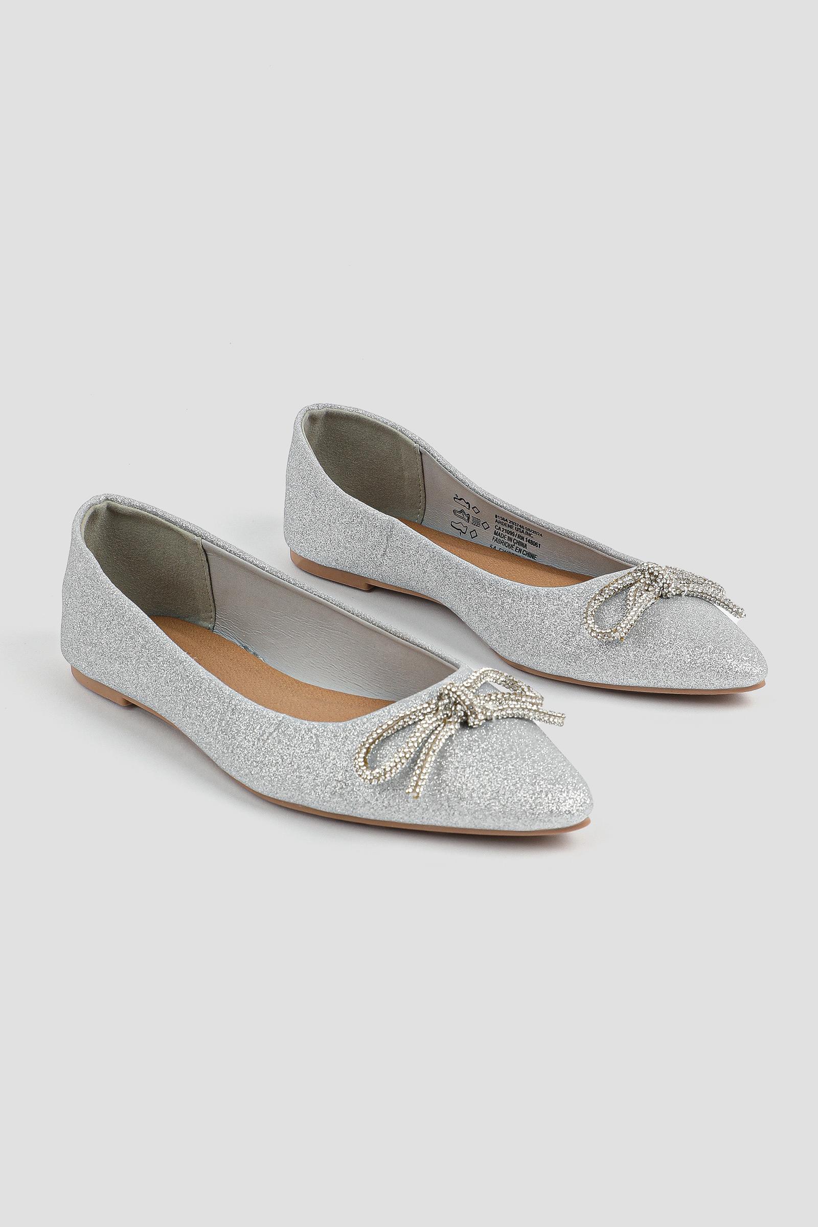 Glitter ballet flats. Pointy toe Tubular bow on vamp Upper: polyurethane Lining: textile Comfort foam insole TPR outsole | Ardene Glitter Ballet Flats with Bow in Silver | Size 10