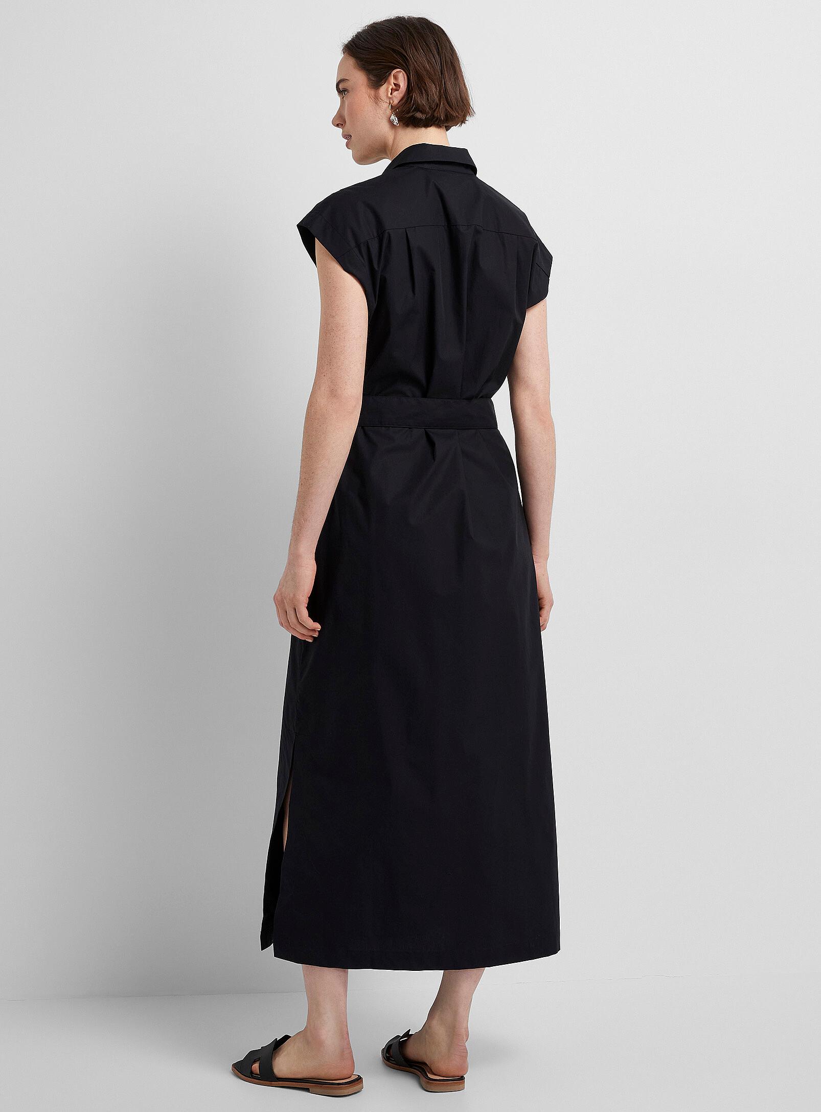 Women > Dressesbr>Contemporaine - Belted cap-sleeve poplin dress Contemporainebr>b>Contemporaine by Simons: an exclusive designed in Canada/b>br>br>b>Fabric/b>ul>li>100% organic cotton poplin/li>li>Unlined/li>/ul>br>b>Style/b>ul>li>Fit-and-flare style that slims the waist and follows an A-line to the hem/li>li>Maxi length/li>/ul>br>b>Details/b>ul>li>Shirt collar/li>li>Cap sleeves/li>li>Buttons down the front/li>li>Matching tie belt (removable)/li>li>Side vents/li>/ul>br>br>The size of the item pictured is smallbr>br>Length: 52.25" (133.0 cm), from the top of the shoulder