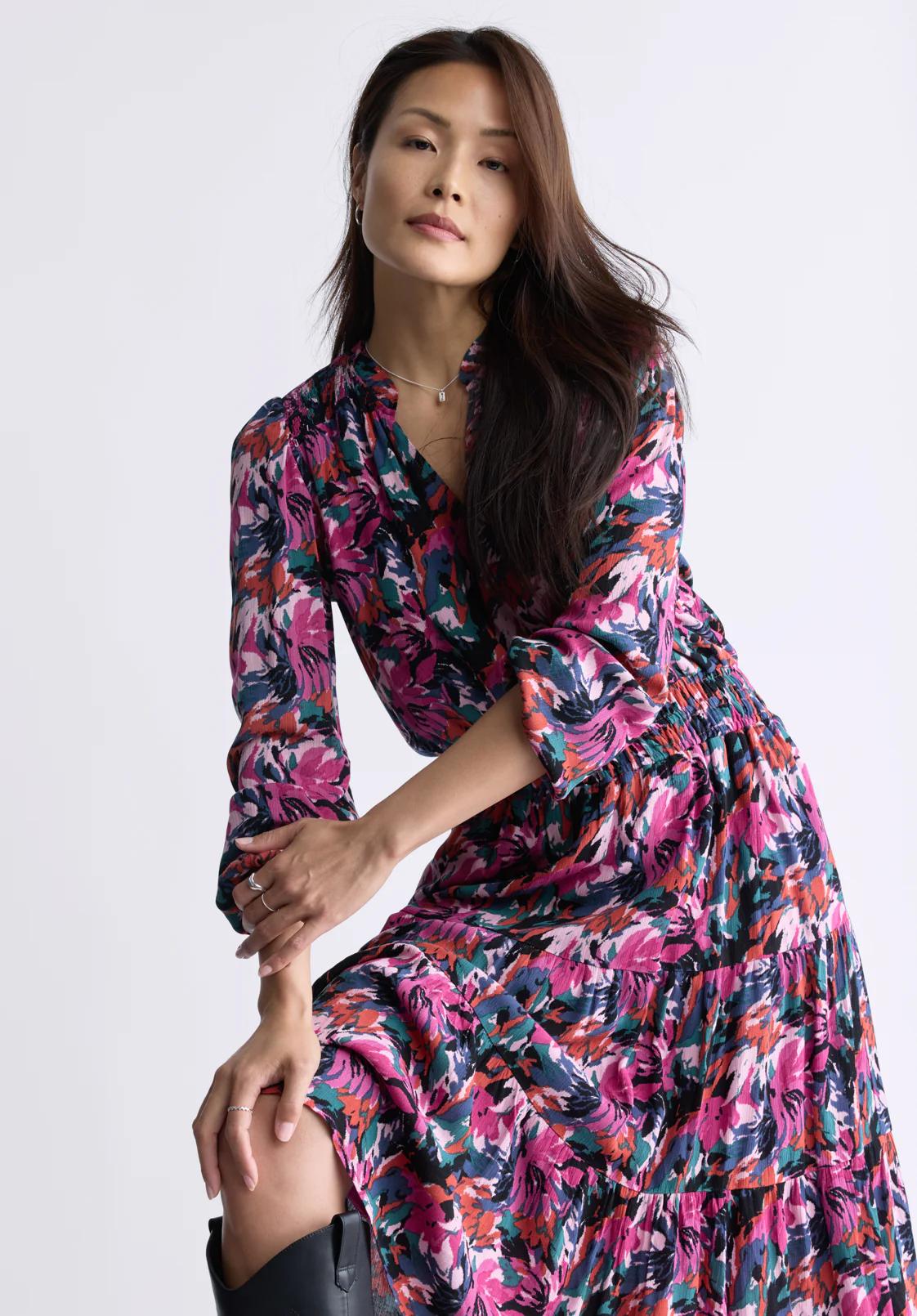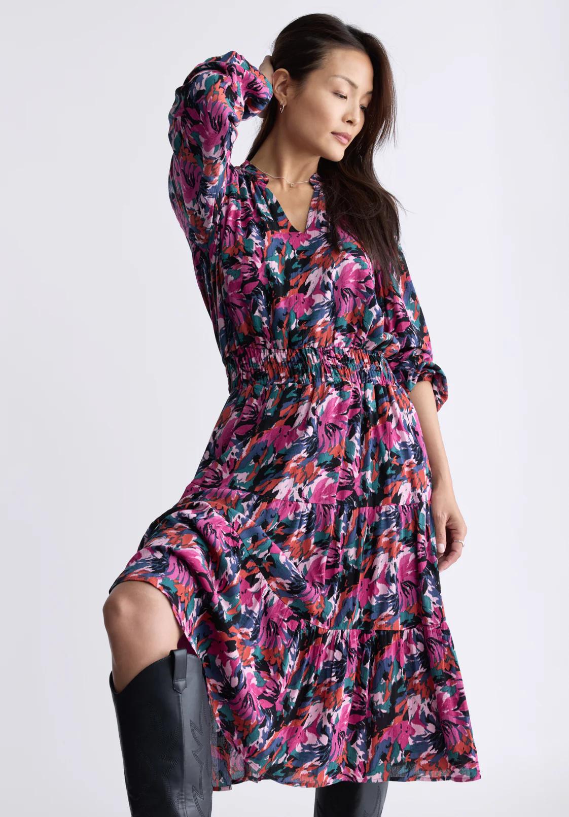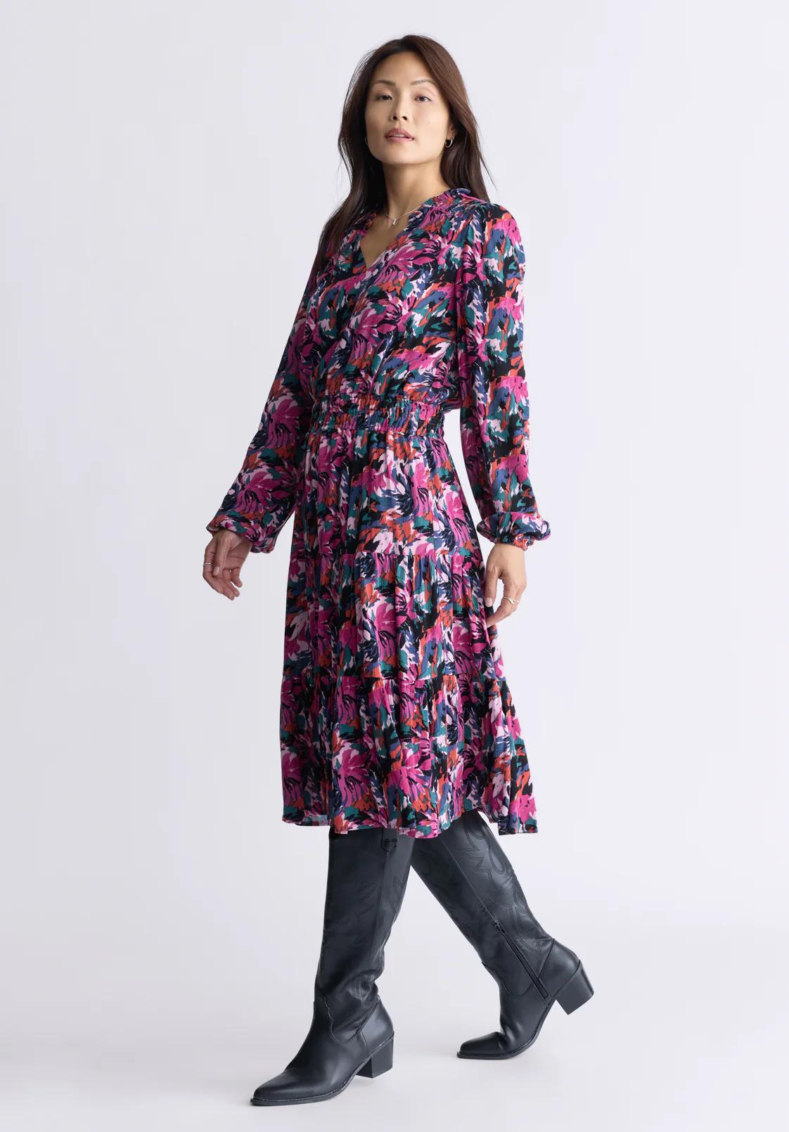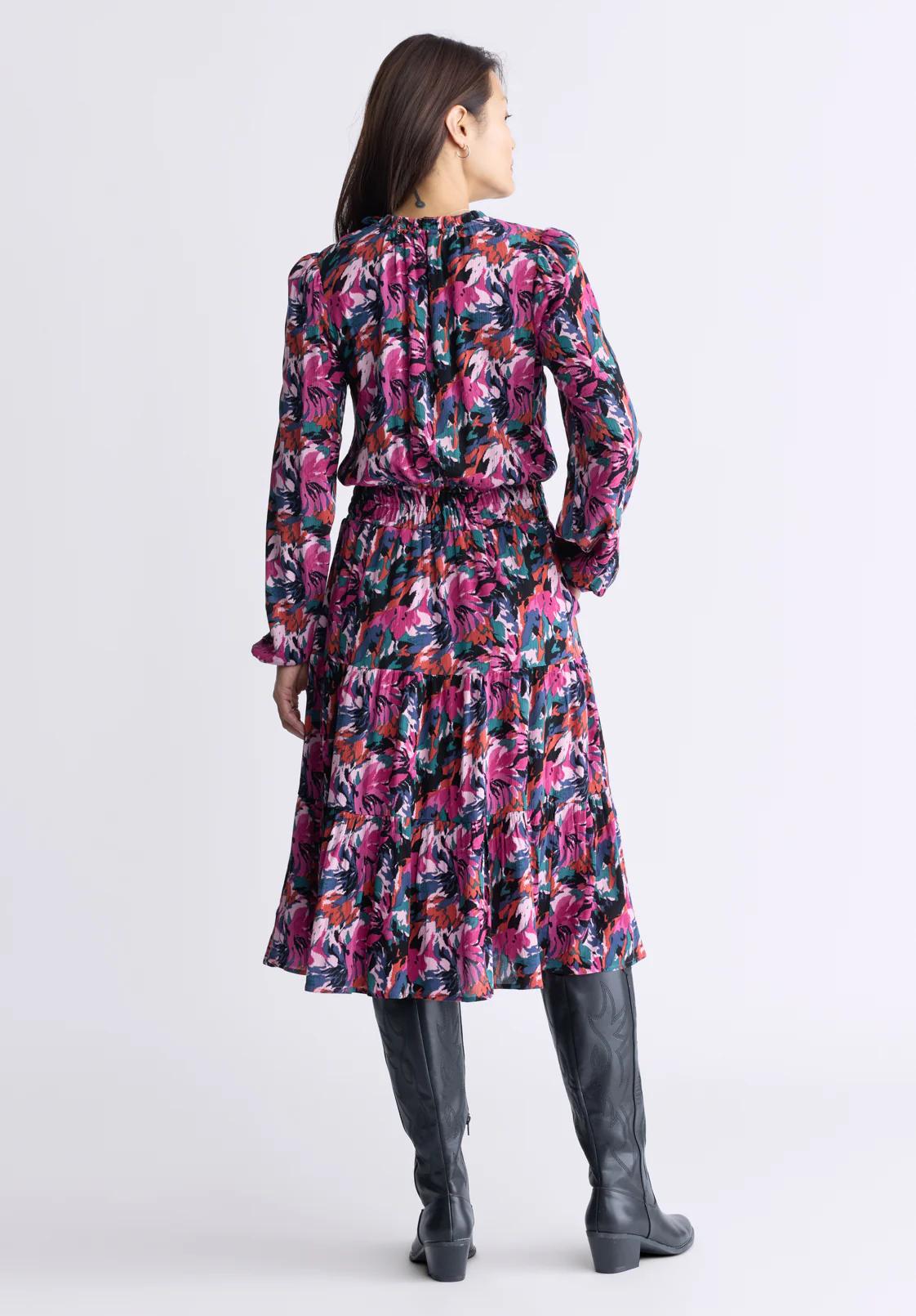The Karrigan long-sleeved midi dress features a V-neckline, pleated back, elasticated cuffs and pleated waist. The skirt is flowing and billowing, creating a most interesting effect. It's easy to coordinate and accessorize, to suit all your outings.