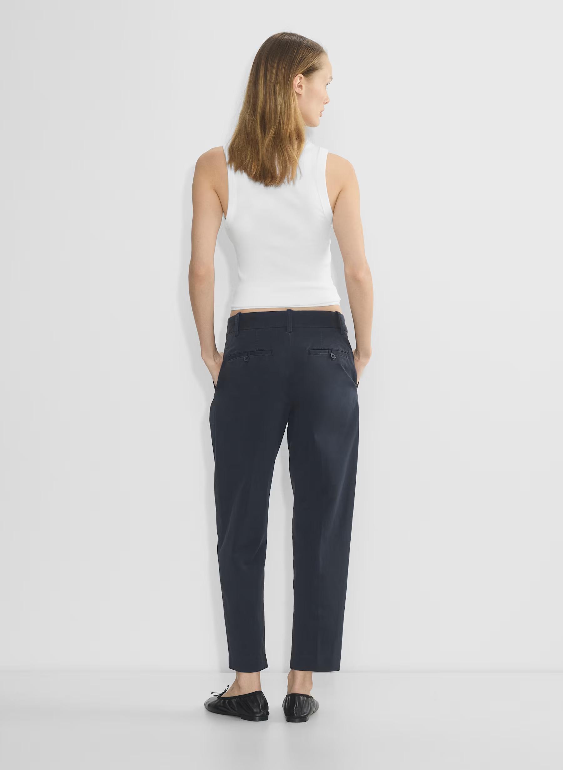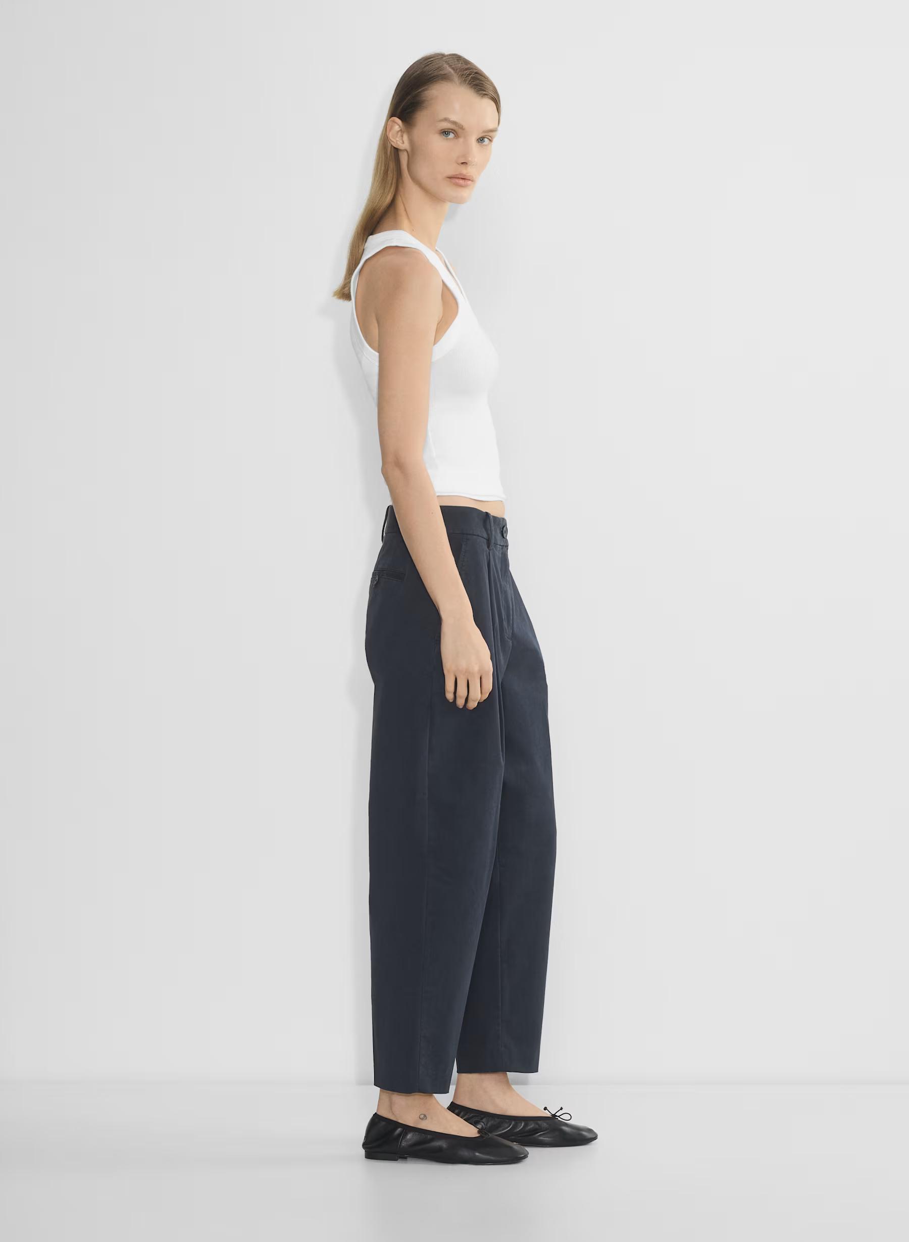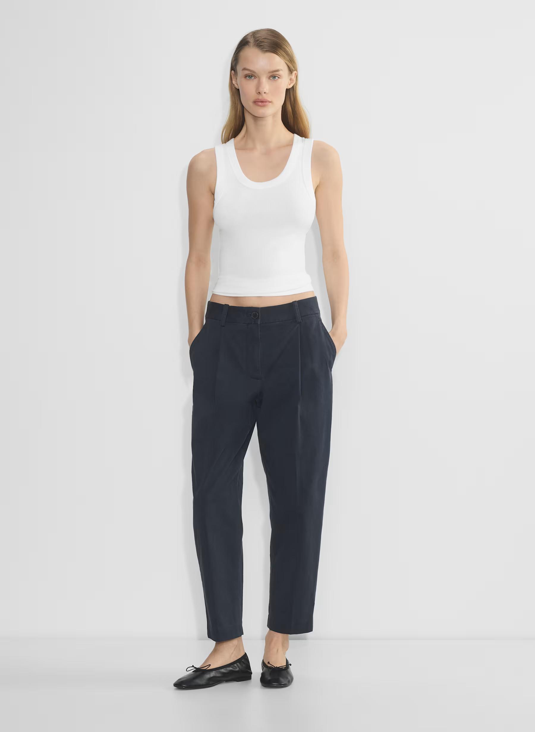 These are pleated mid-rise trousers with slash pockets and a relaxed fit. They’re made with Aritzia’s Chino — stretch cotton twill with a peachy feel. This fabric is easy-care and perfect for year-round wear. It’s made with 97% regenerative cotton.