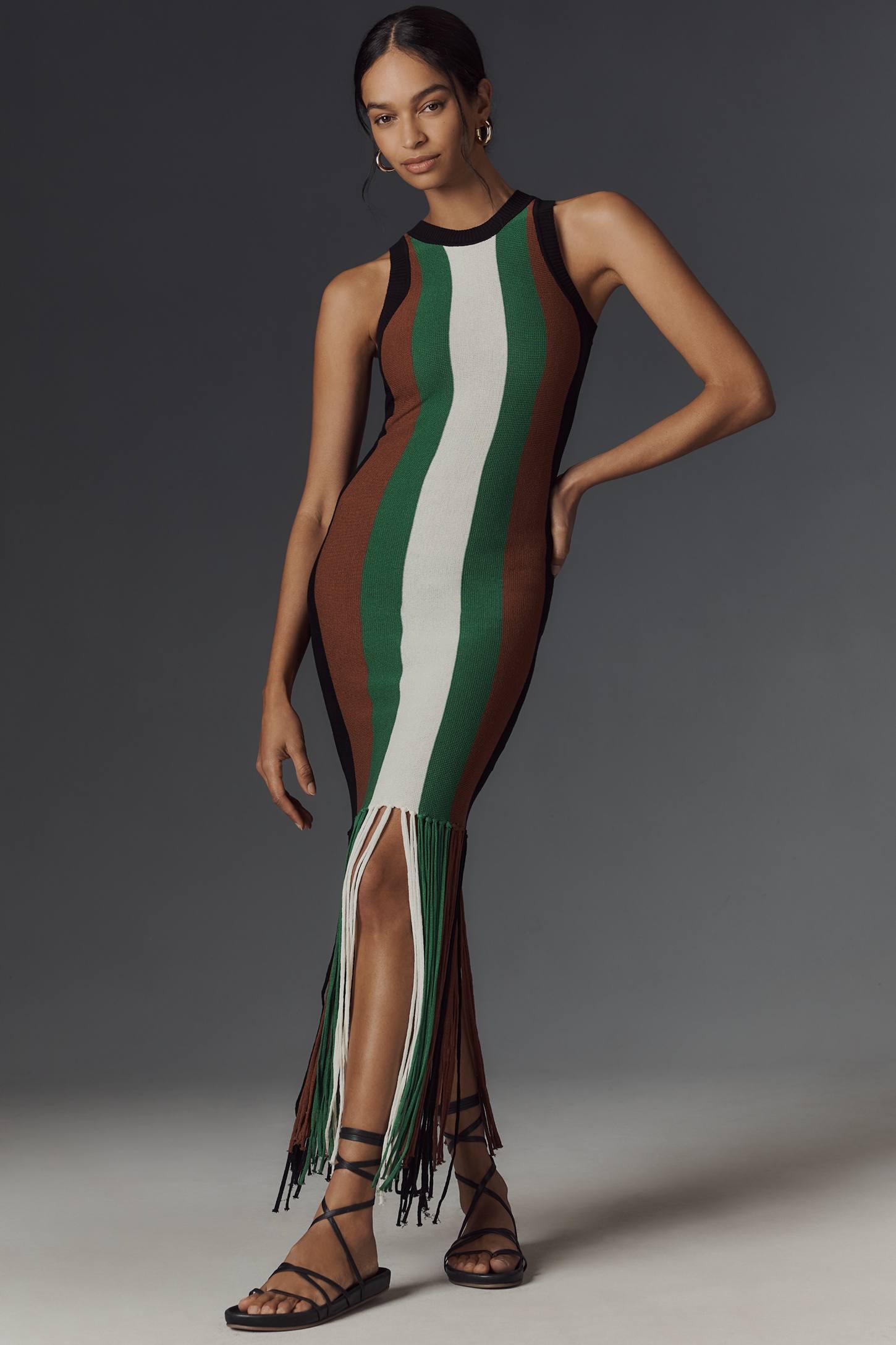 The Silvian Heach Sleeveless Fringe Sweater Midi Dress features flattering vertical stripes, a round neckline, wide shoulder straps, and fringe details at the hem for added movement.