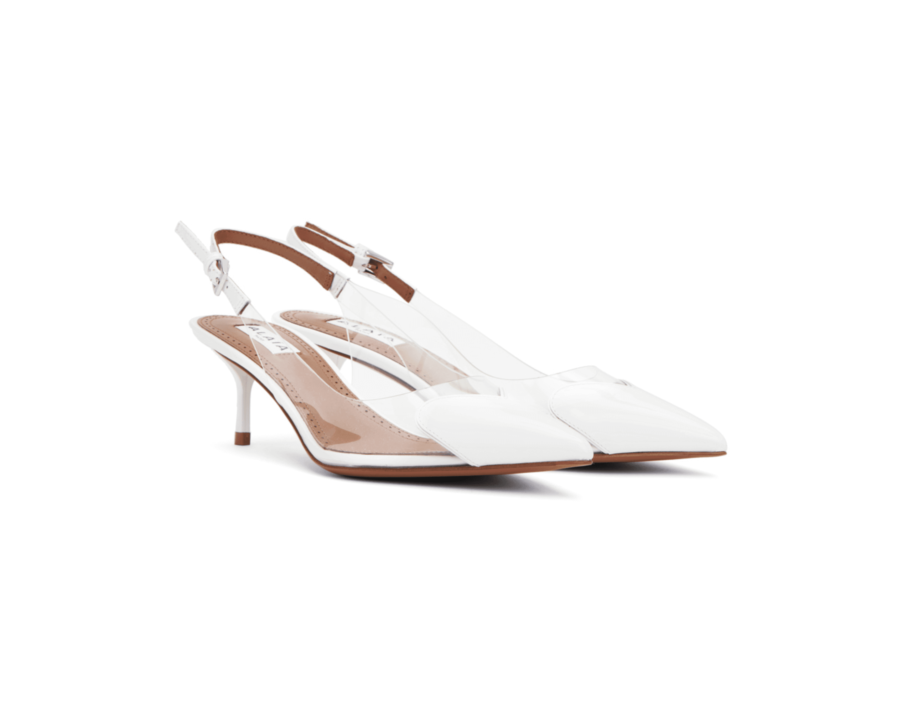 Transparent PU and patent lambskin heels in white. · Pointed toe · Adjustable pin-buckle slingback strap · Logo patch at padded calfskin footbed · Covered kitten heel with rubber injection · Leather sole with rubber injection.