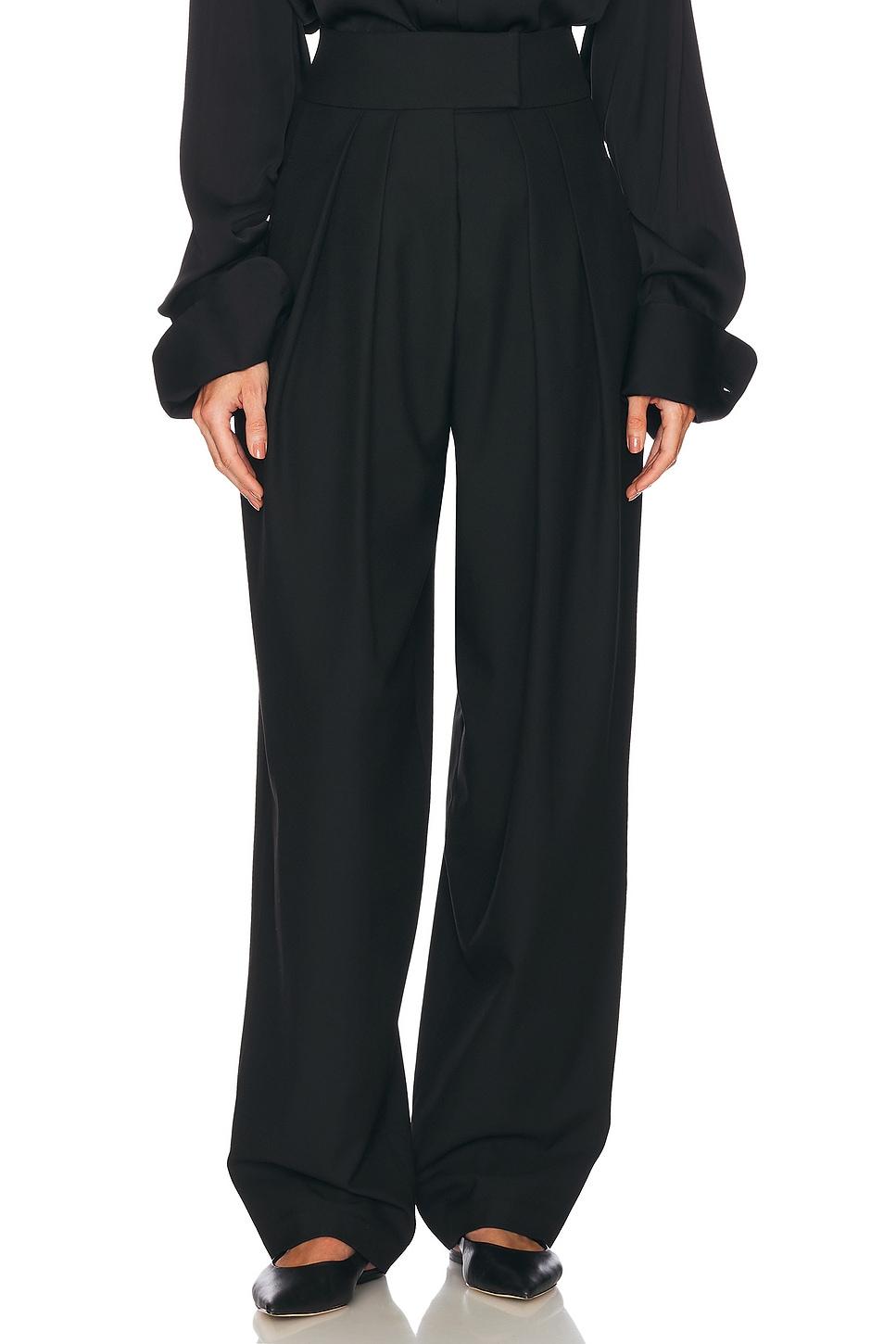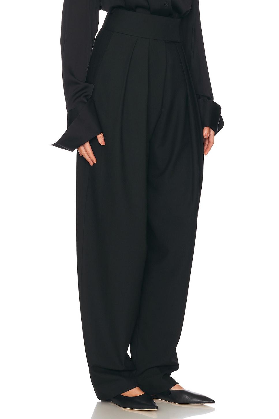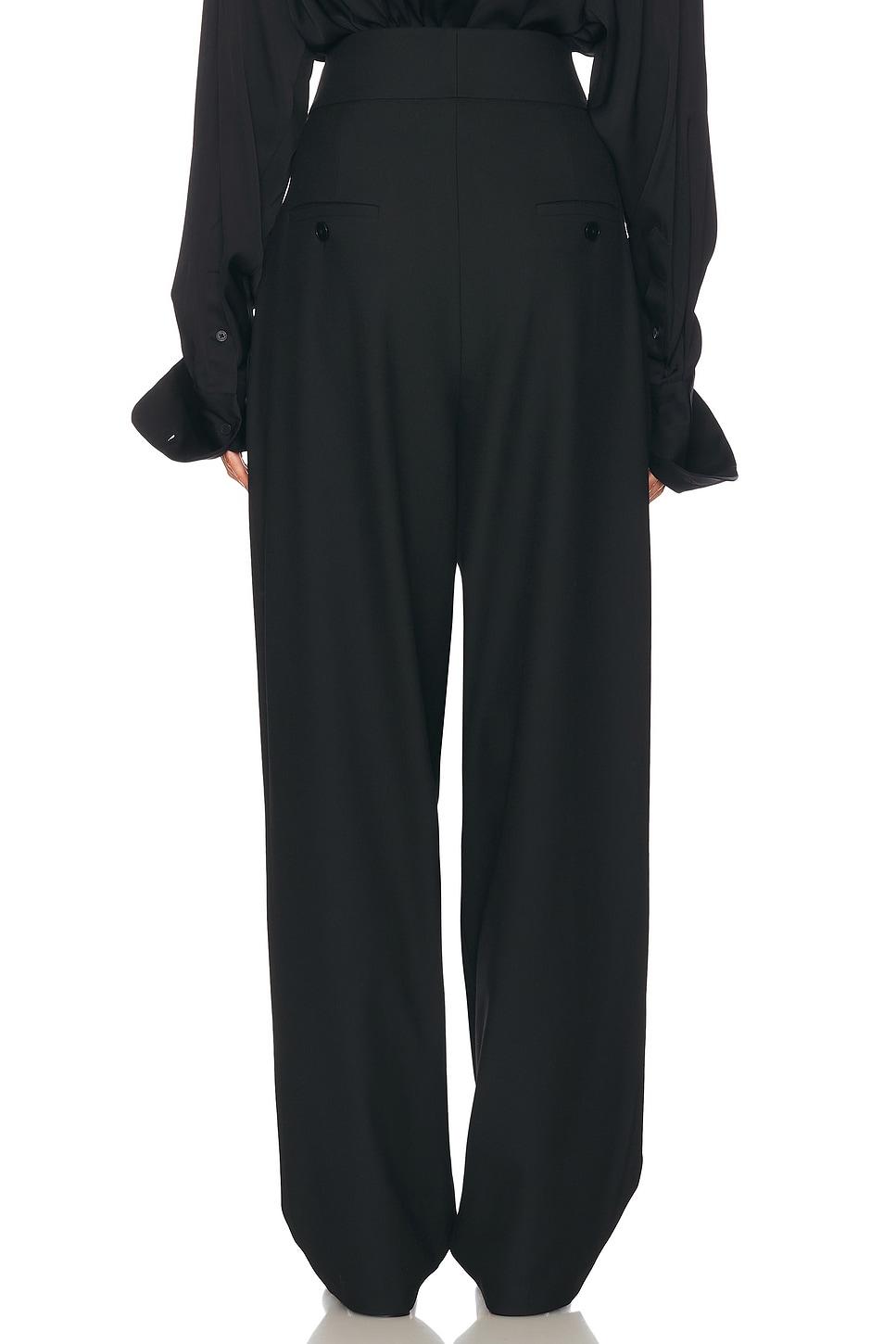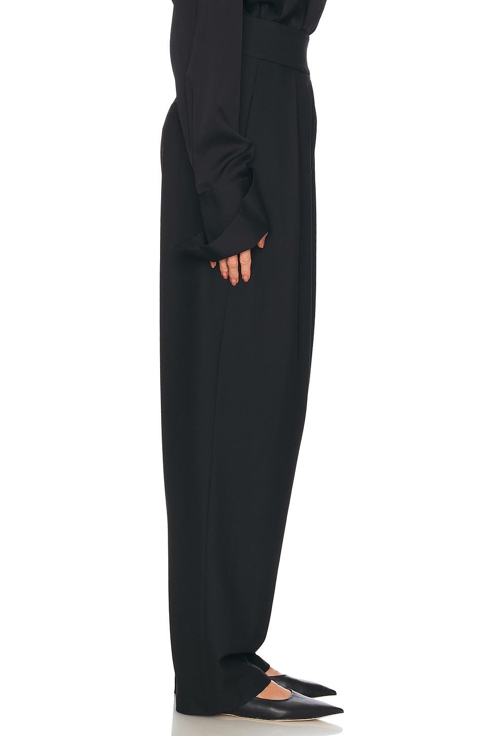 62% polyester, 34% viscose, 4% elastane. Made in China. .Dry clean only. Zip fly with hook and bar closure. Side slip pockets and back welt pockets. Suiting fabric with front pleats. 24" / 61 cm at the knee narrows to 17" / 43 cm at the leg opening.