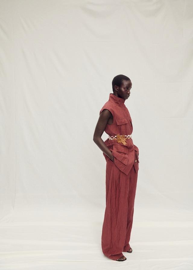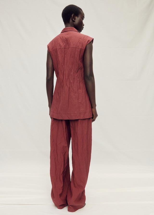 Cotton-blend fabric. Wrinkled effect. Long design. Lapel-collar V-neck collar. Sleeveless. Four patch and flap pockets on the front. Front closure with buttons. Total look. Selection Collection.