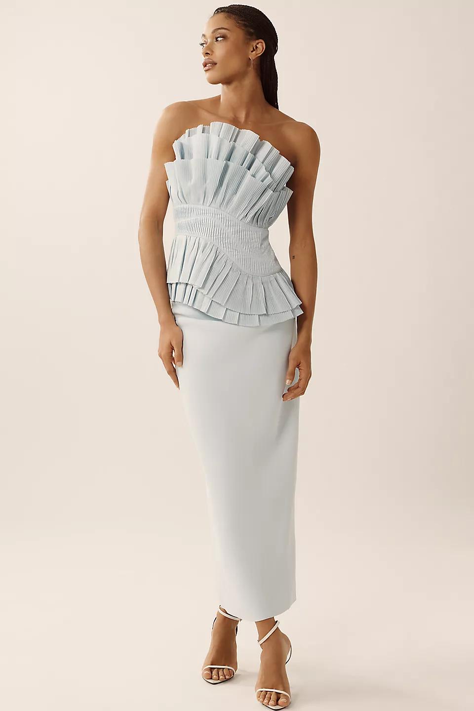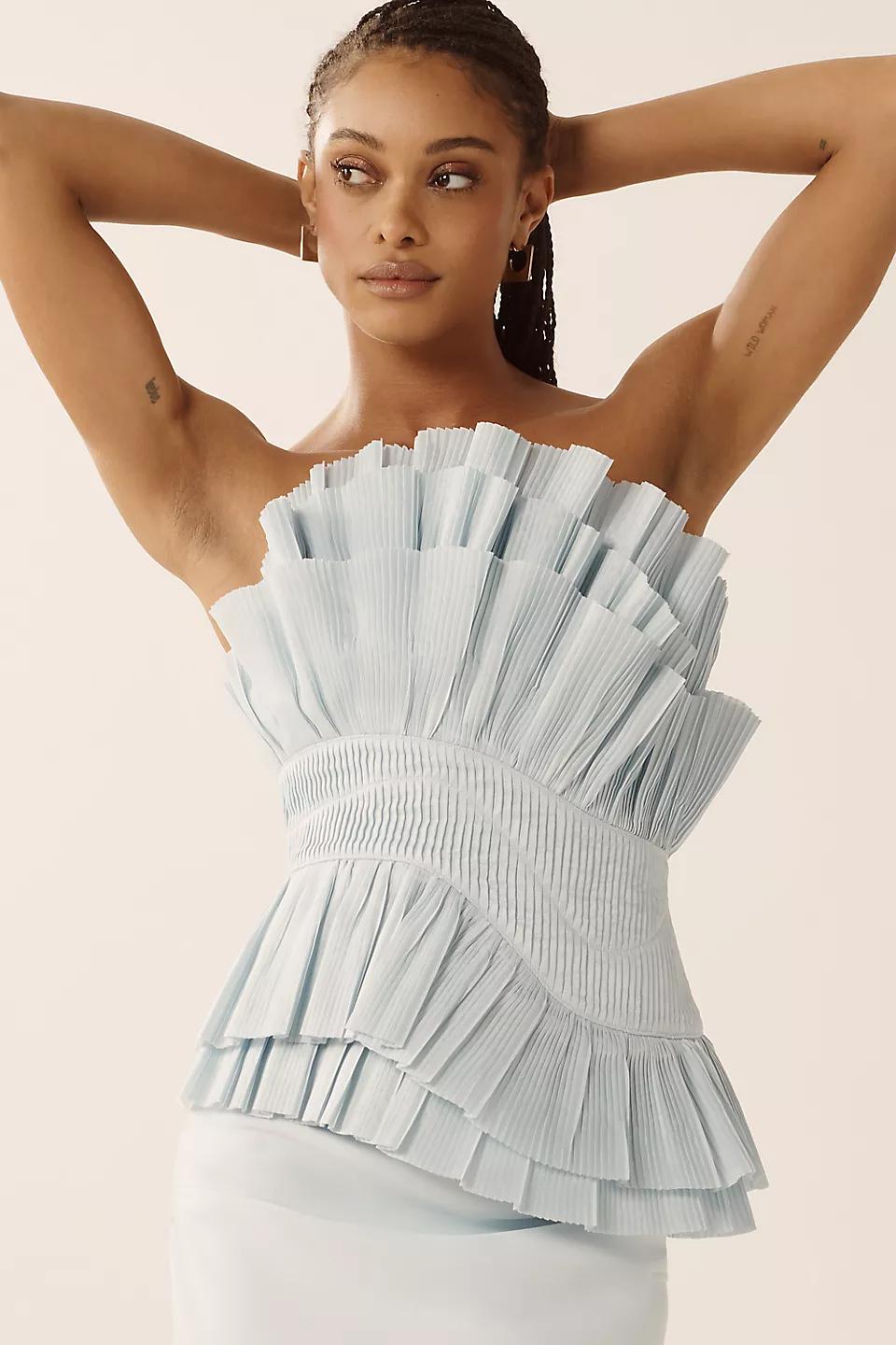 The Acler Tremail Top features a sculptural design with delicate pleated detailing and a layered peplum hem. The strapless silhouette is complemented by an adjustable tie-up back, ensuring a tailored fit.