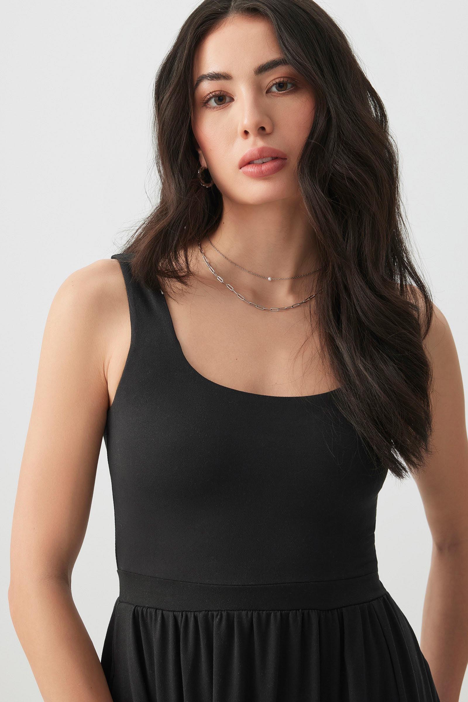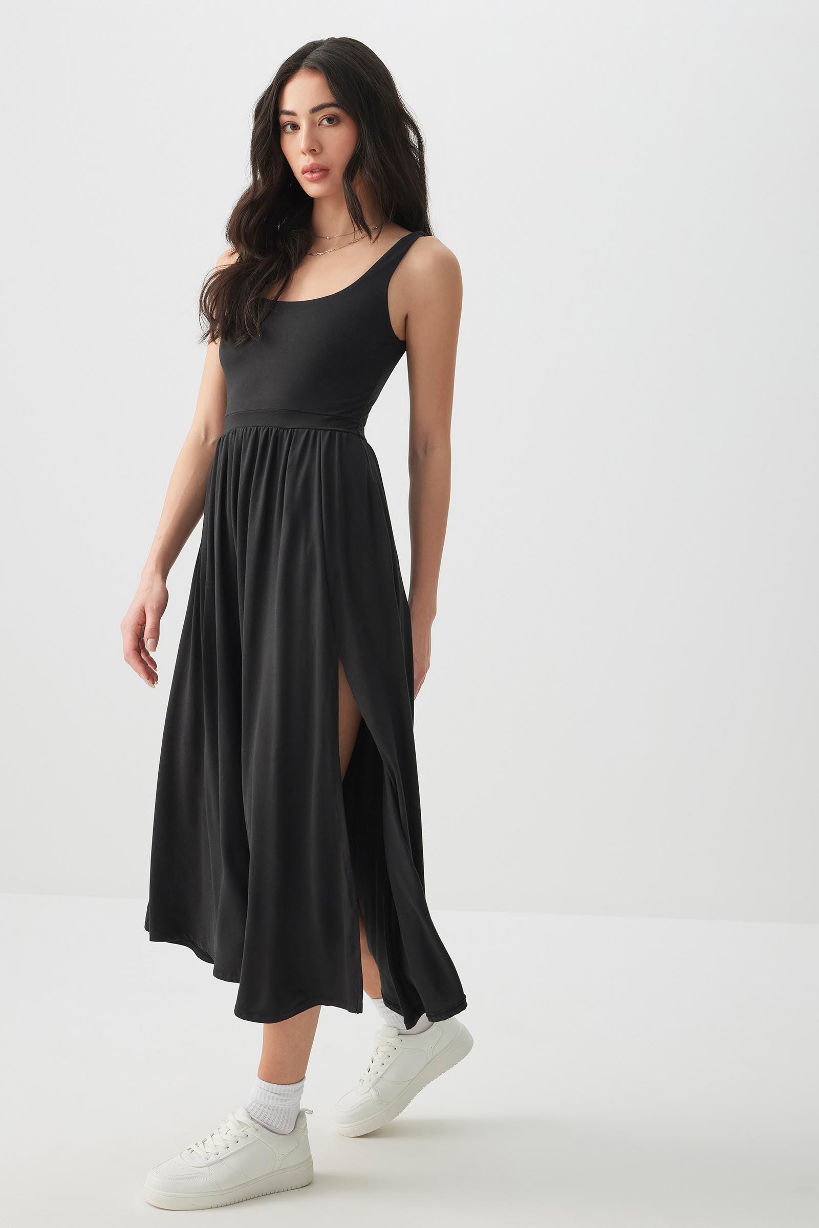Midi dress in super soft eco-conscience knit. Square neckline Medium straps Slit detail Fit and flare 92% recycled polyester, 8% elastane Model is wearing size SRecycled polyester fibers are made of post-consumer plastic. | Ardene Super Soft Midi Dress with Slit in Black | Size XL | Polyester/Elastane