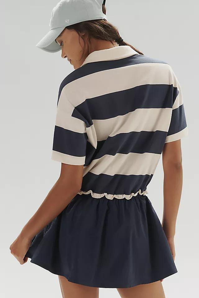 100% cotton; 100% polyamide contrast Oversized polo t-shirt with elbow-length sleeves Collar with quarter-button styling Ruffled drawstring waistline Built-in shorts Pull-on styling Machine wash Imported