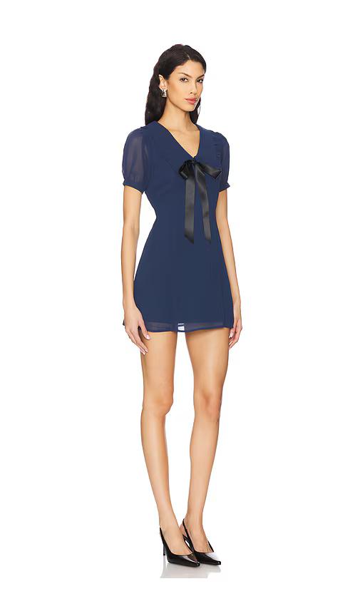 MORE TO COME Louisa Mini Dress in Navy. Size S. Self: 100% polyester Lining: 95% polyester 5% elastane. Made in China. Hand wash cold. Fully lined. Back zip with hook and eye closure. Satin bow at collar. Semi-sheer sleeves. MOTO-WD539. MTD716 R24.