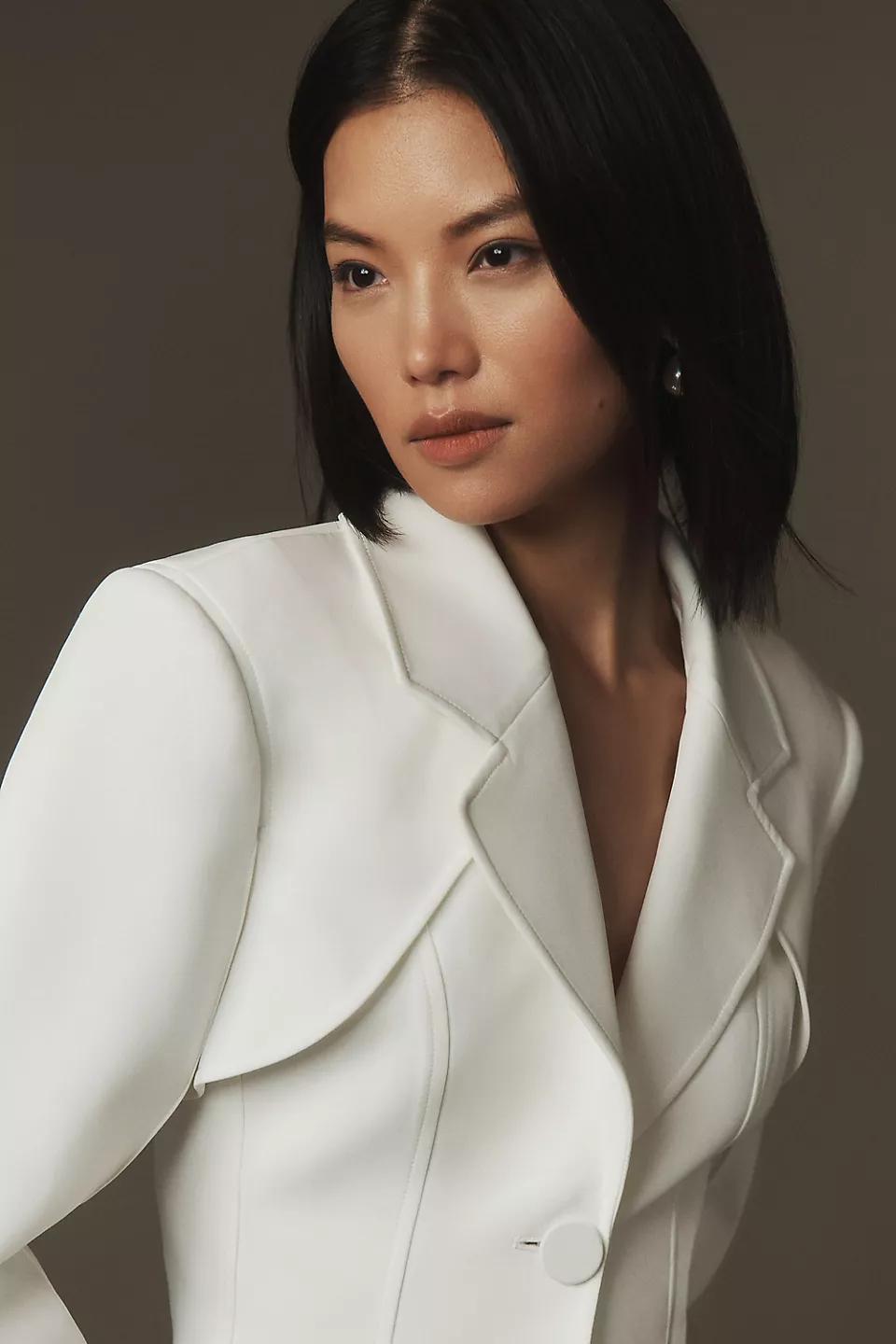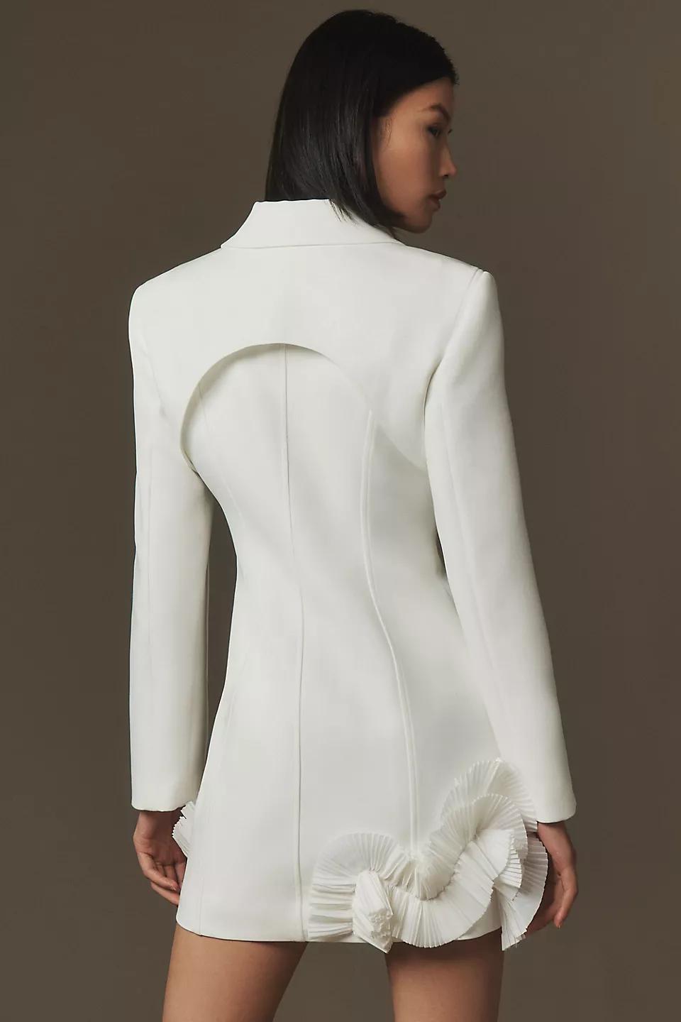 The Hampstead Blazer Dress by Acler is a chic mini with a structured silhouette, ruffled rosette hem, and polished covered buttons, perfect for effortlessly transitioning from day to evening. Polyester, elastane; polyester lining Mini length Drop-shoulder blazer silhouette Woven structured fabric Ruffled rosette detailing at hem Front and back storm flaps Covered button styling Professionally clean Imported