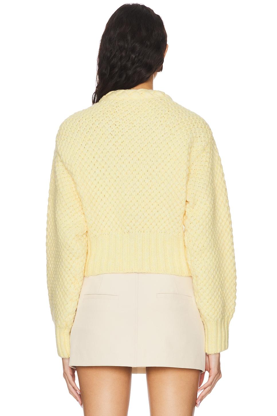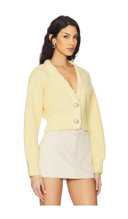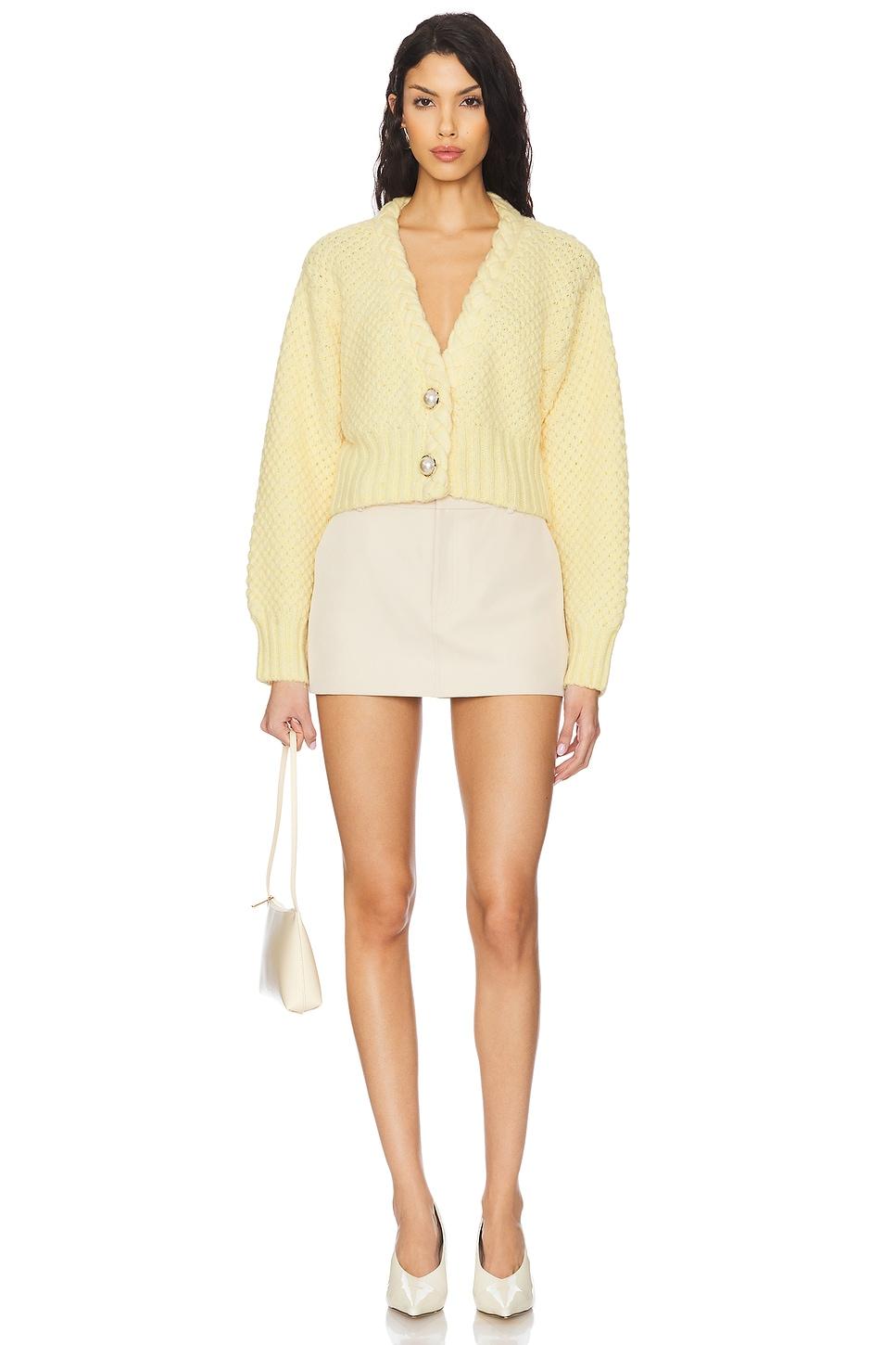 50% recycled polyester 30% polyester 10% wool 10% nylon. Made in China. Machine wash cold. Front snap button closure. Faux pearl buttons. Soft knit fabric. MALR-WK284. MJD1126 H23. Majorelle is a romantic escape driven by a sense of wanderlust and effortless feminine appeal. Based in Los Angeles, the label is girly, flirty, vintage and romantic, perfectly blending elegant dressing for the luxe dreamer who loves to travel the world.
