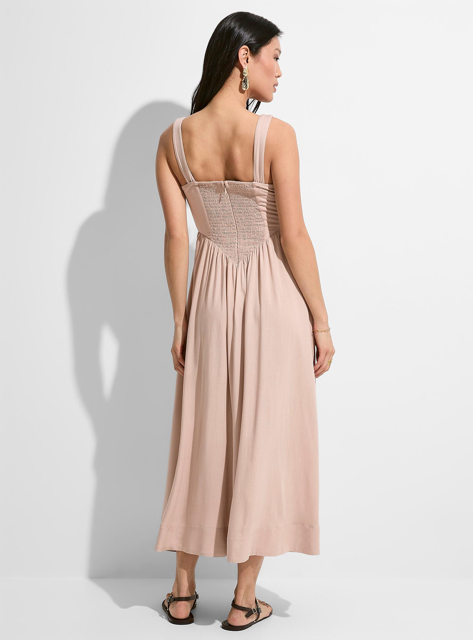 Finely woven and stretch rayon blend for a linen effect. Double-layered bust. Fit-and-flare style. U-shaped collar. Ruching and small decorative bow at the front. Stretch smocked insert at the back. Wide adjustable straps with hidden buttons. Hidden zip closure at the back