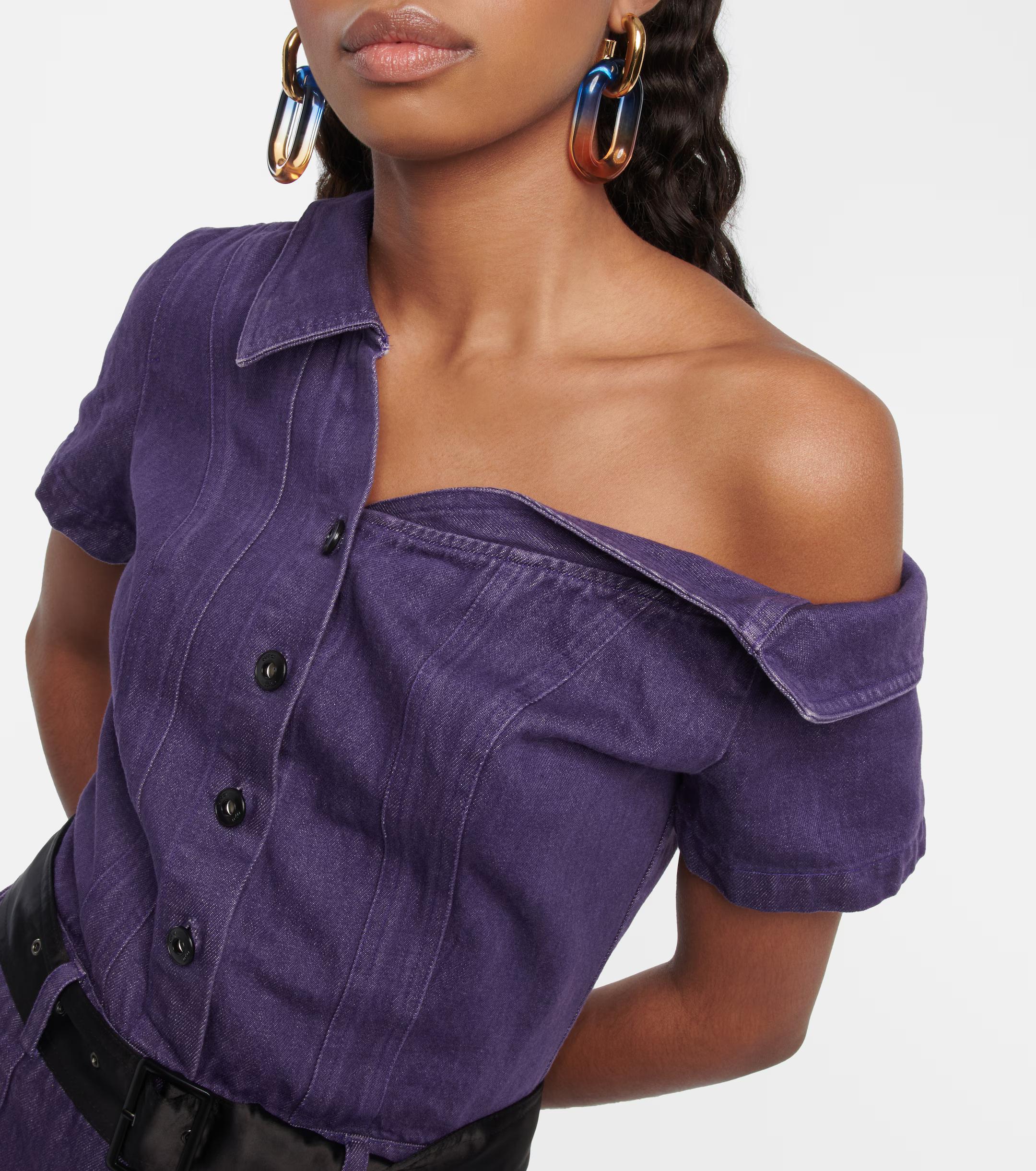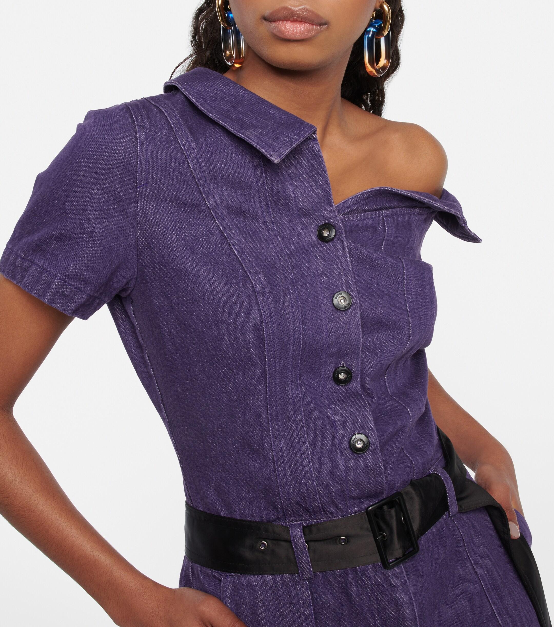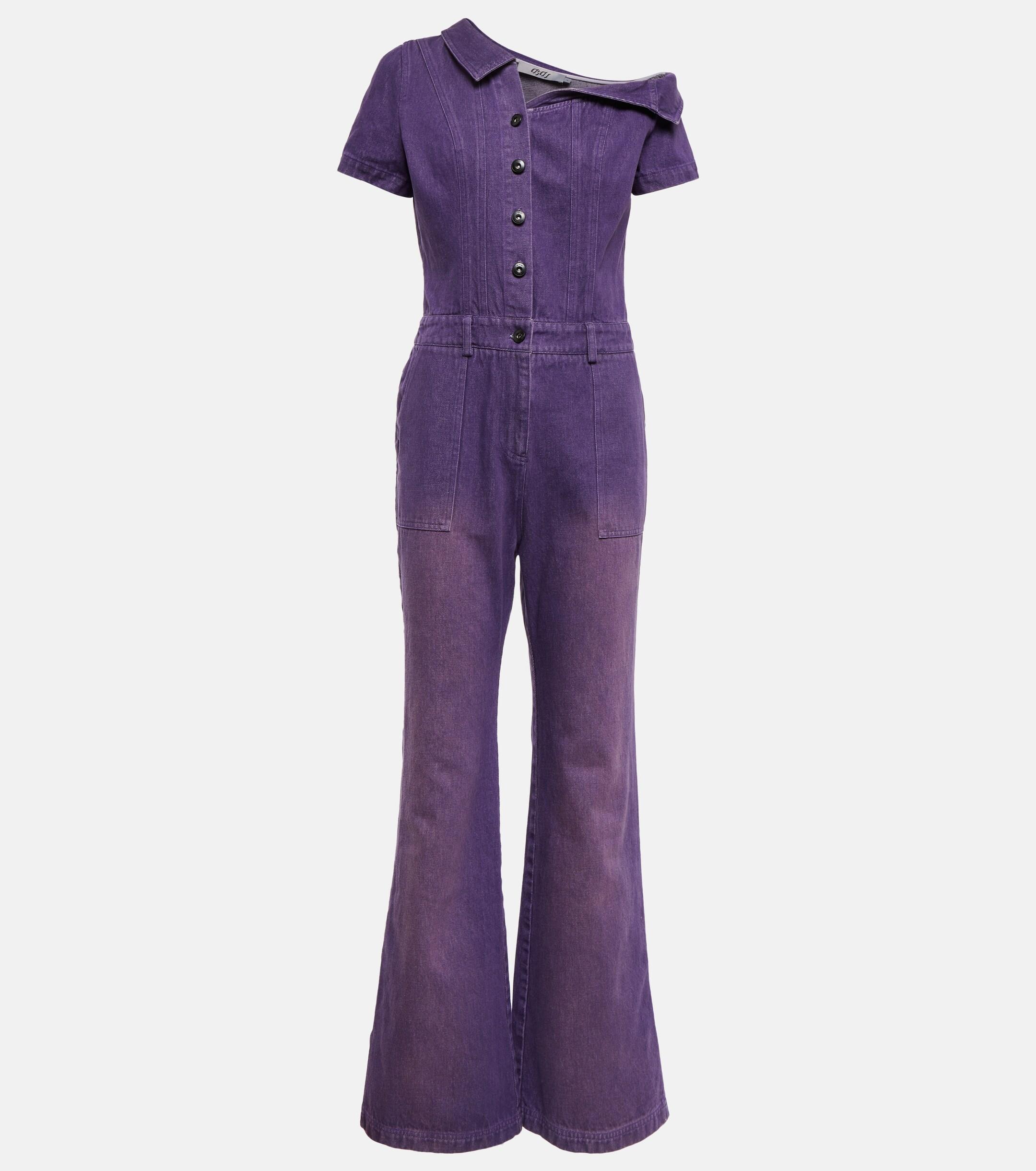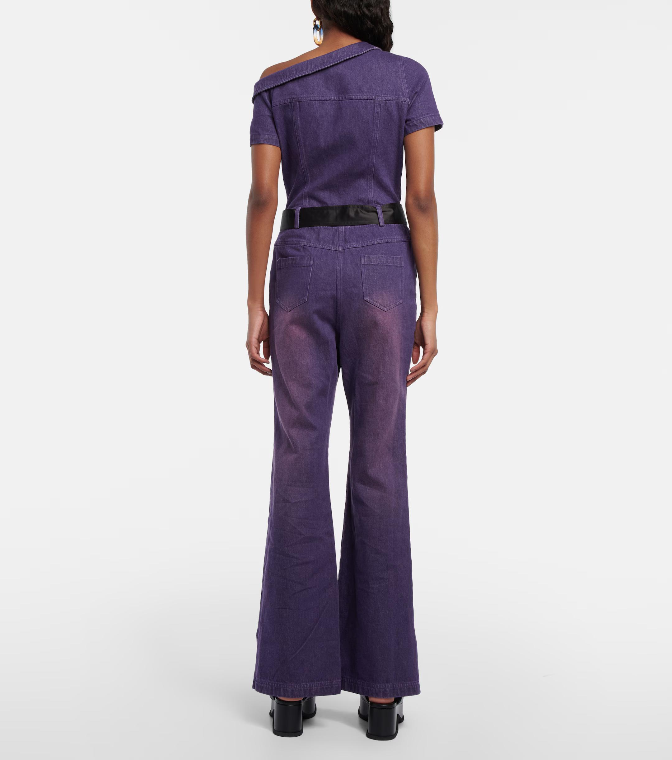 Part of the China Designer Program by Mytheresa, Didu's Insomnia Desert collection encourages self-expression and acceptance through bold and subversive designs. This purple denim jumpsuit is cut off one shoulder with a nylon belt and split-hem flared legs.