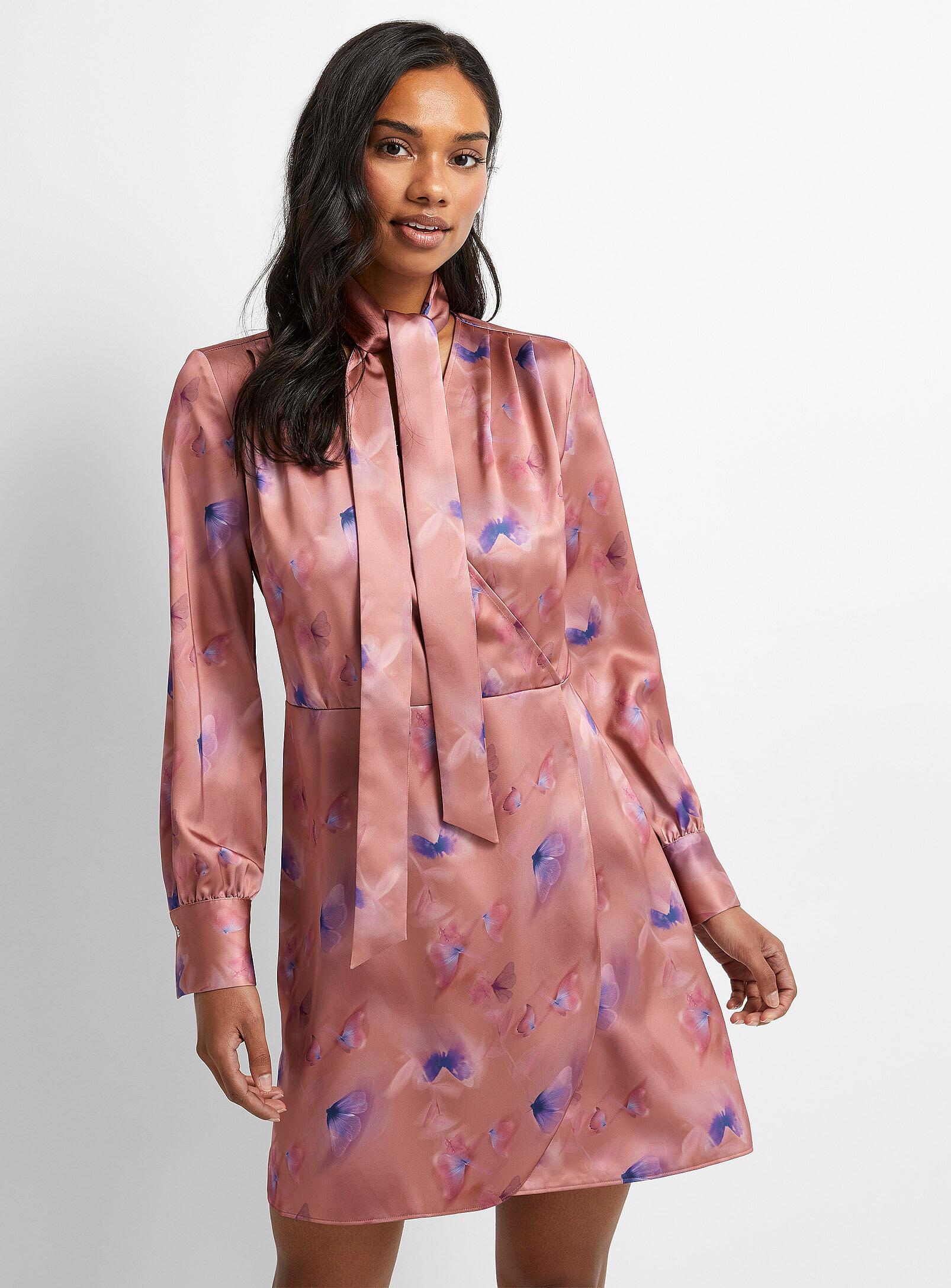Soft, light and fluid satiny weave. Unlined. Straight style, slightly fitted at the waist. Mini length. Crossover V neck. Wrap style. Removable scarf-style collar. Chic pleated details at the front