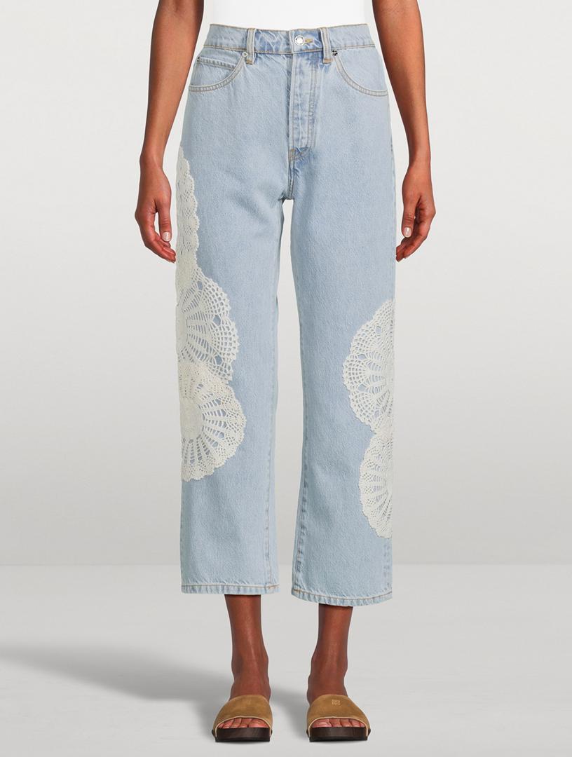 Featuring a high-rise waist, straight-leg, and cropped inseam, these 100% regenerative cotton jeans are crafted with rigid structure that softens over time. Finished with a button fly and crochet doilies along each outseam for an artisanal twist.