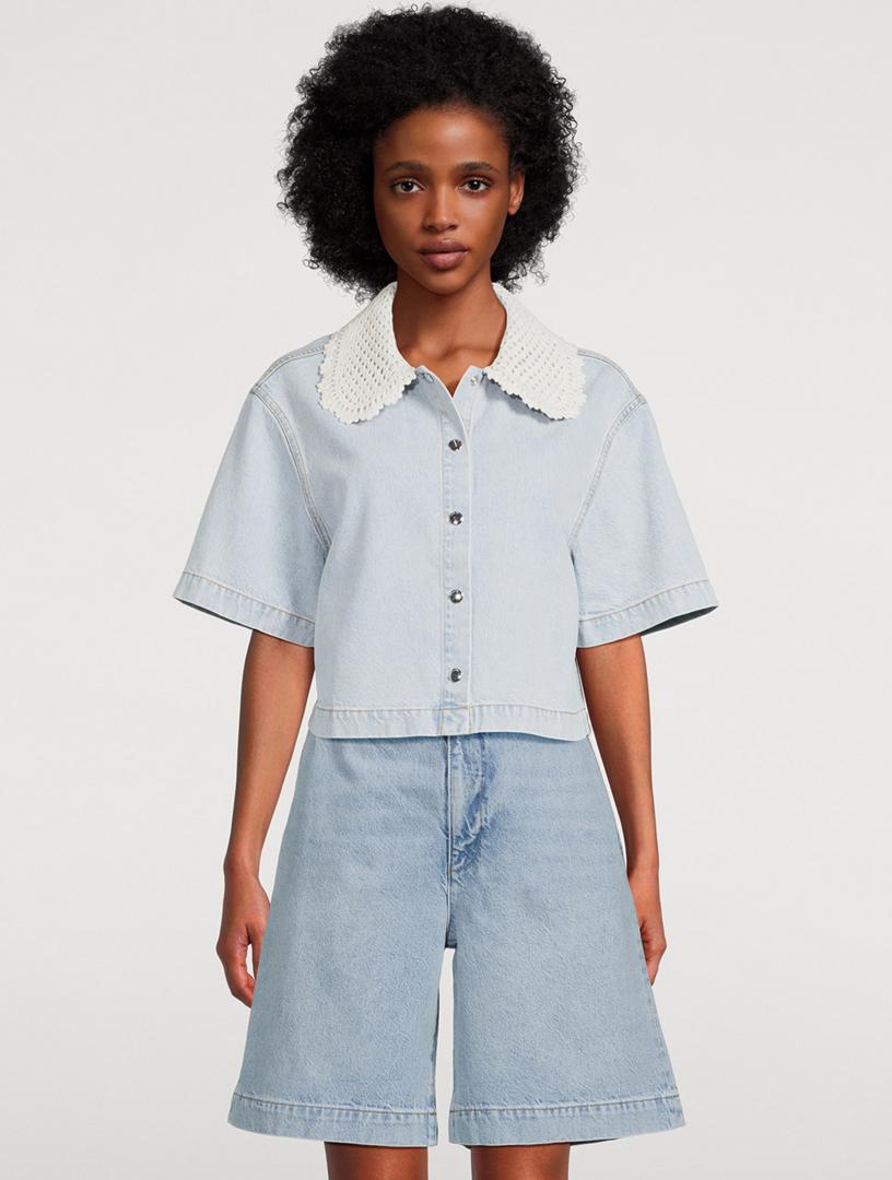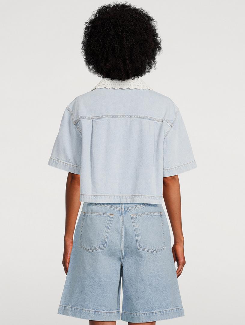 A boxy denim top with crisp short sleeves, cut from lightweight, rigid denim and washed for a worn-in feel. Finished with shiny silver-tone snaps and a scalloped crochet collar that adds a touch of texture—and a hint of sweetness.