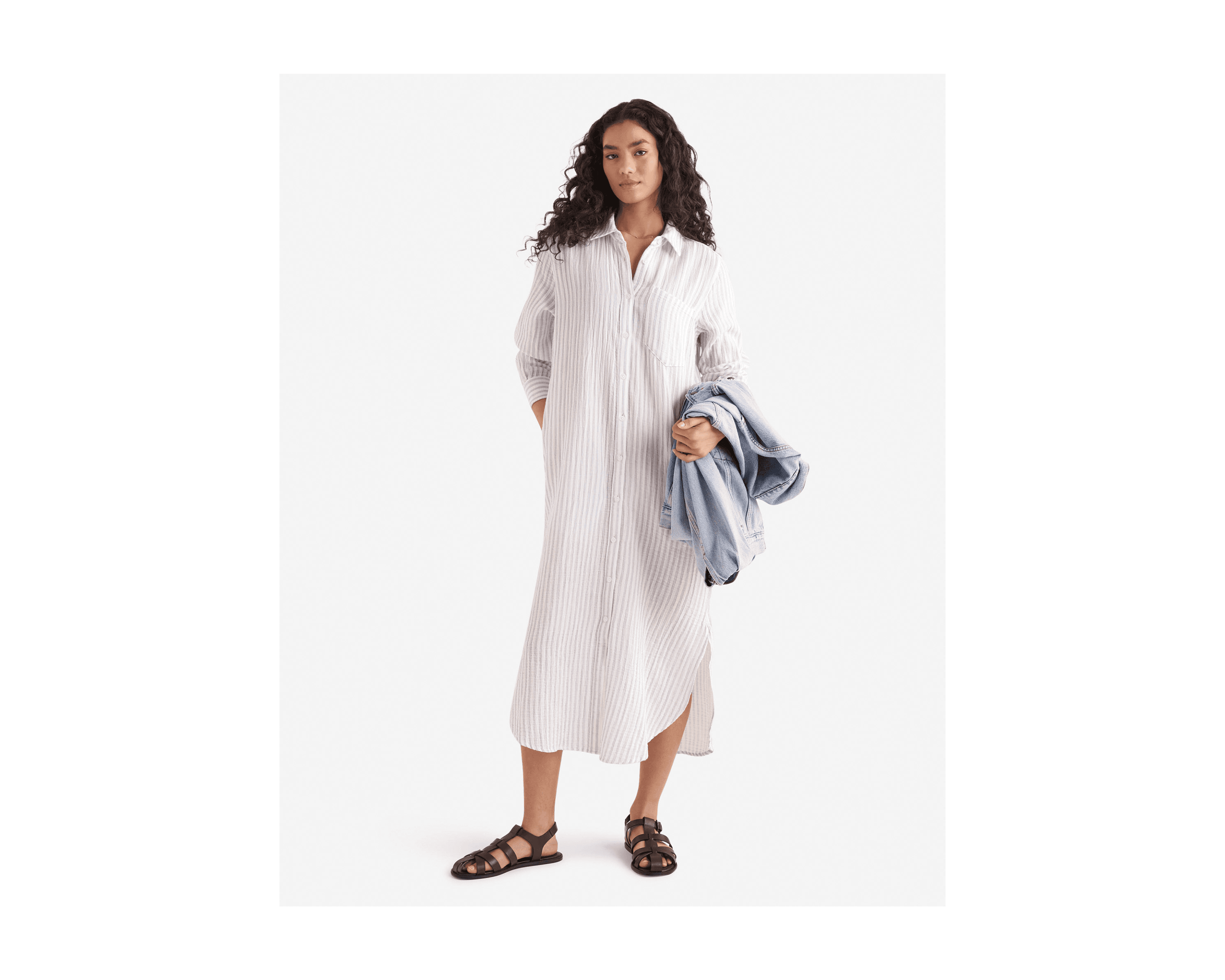 Easy, breezy comfort. Our Isla Cotton Gauze Shirt Dress is breathable, soft and perfect for summer days and cottage nights. 100% organic cotton gauze. Classic fit. Relaxed shape. Spread collar. Chest patch pocket. Side pockets. Shell buttons.