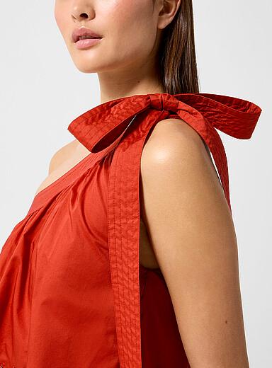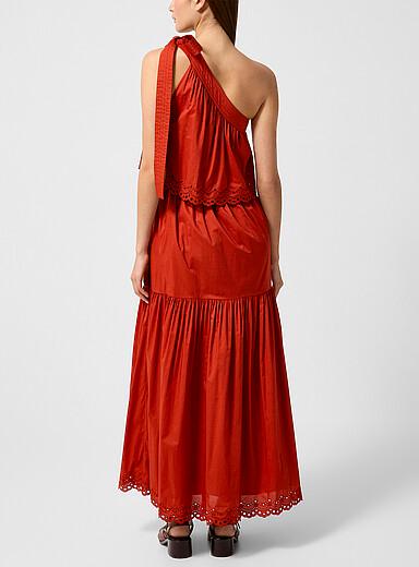 A fabulously romantic and summery silhouette defines this dress showcasing a myriad of details like tiered ruffled with scalloped trim and a single tie-up strap. Soft and crinkling pure cotton poplin. Asymmetrical tie-up shoulder strap. Combining comfort, romance, and a purely Parisian aesthetic, the brand offers timeless, chic, and casual styles that are essential for the free, modern woman who doesn't subscribe to dress codes.