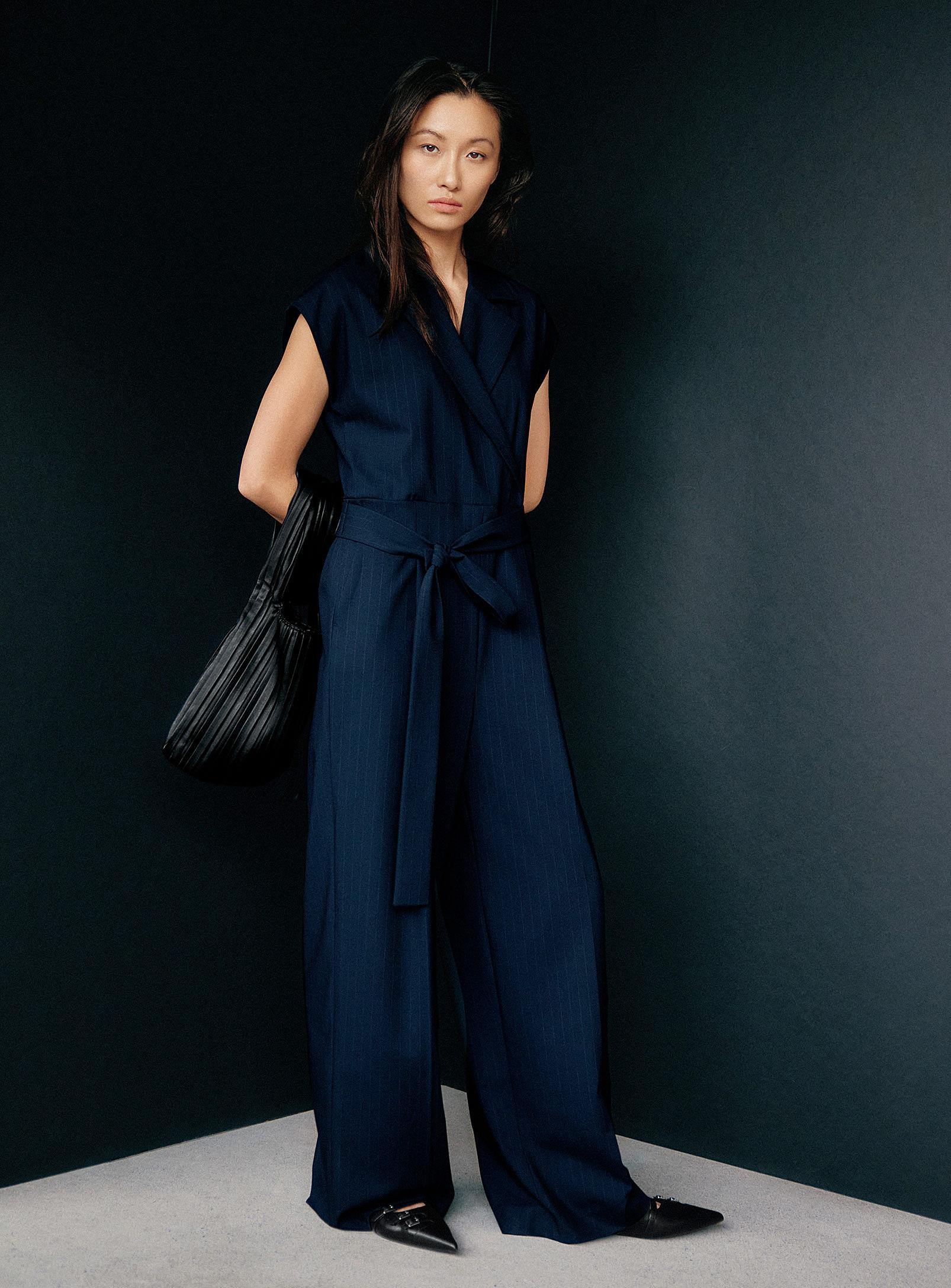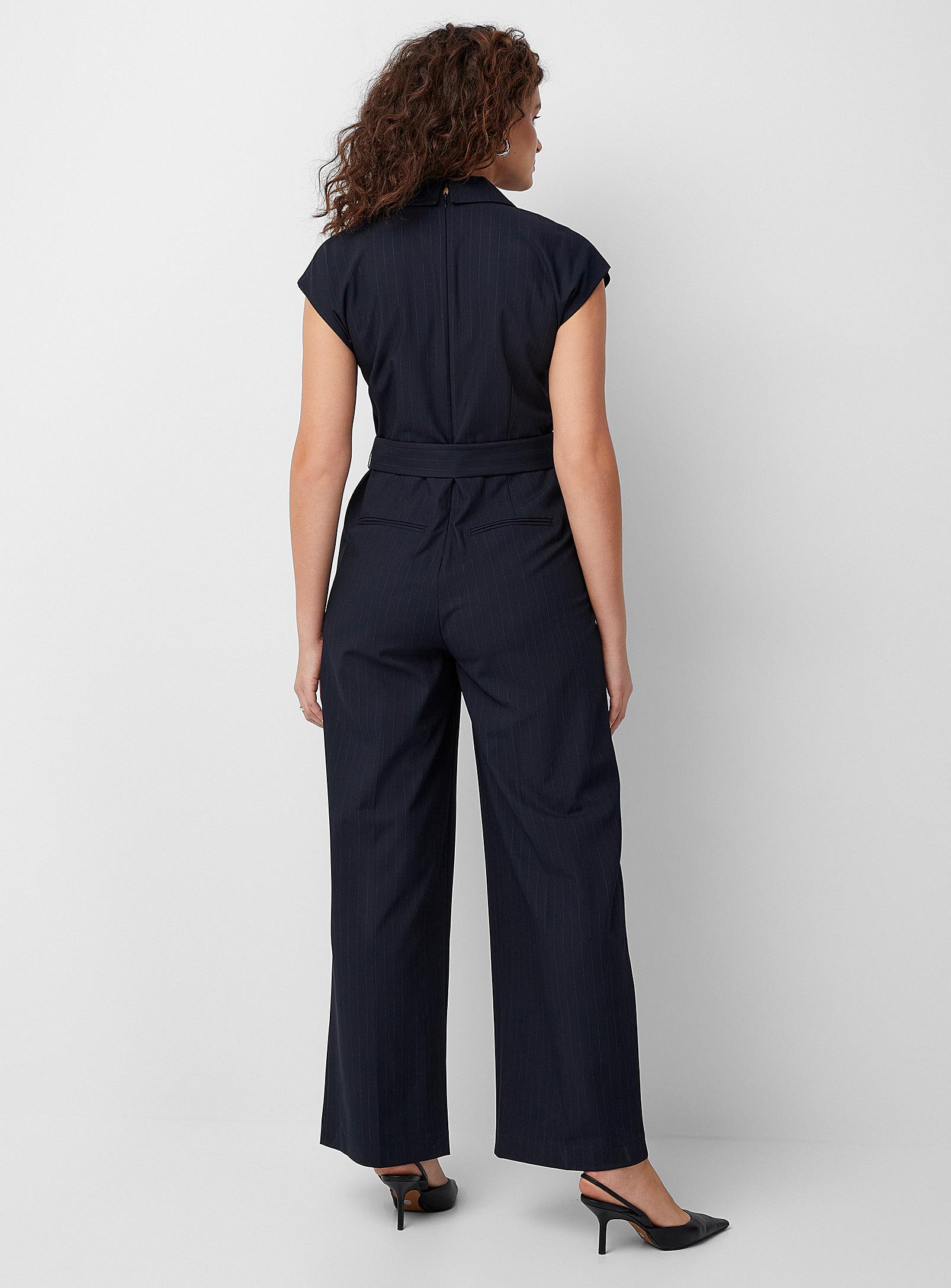 Contemporaine - Pinstripe tie-belt jumpsuit Contemporaine Contemporaine exclusive Soft stretch fabric Satiny lining at the bodice Two sewn pleats at the waist Side slant pockets Wide leg Hidden back zip closure Matching tie belt (removable) Notch collar Inseam length: 30" (76 cm) The size of the item pictured is small