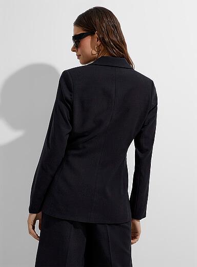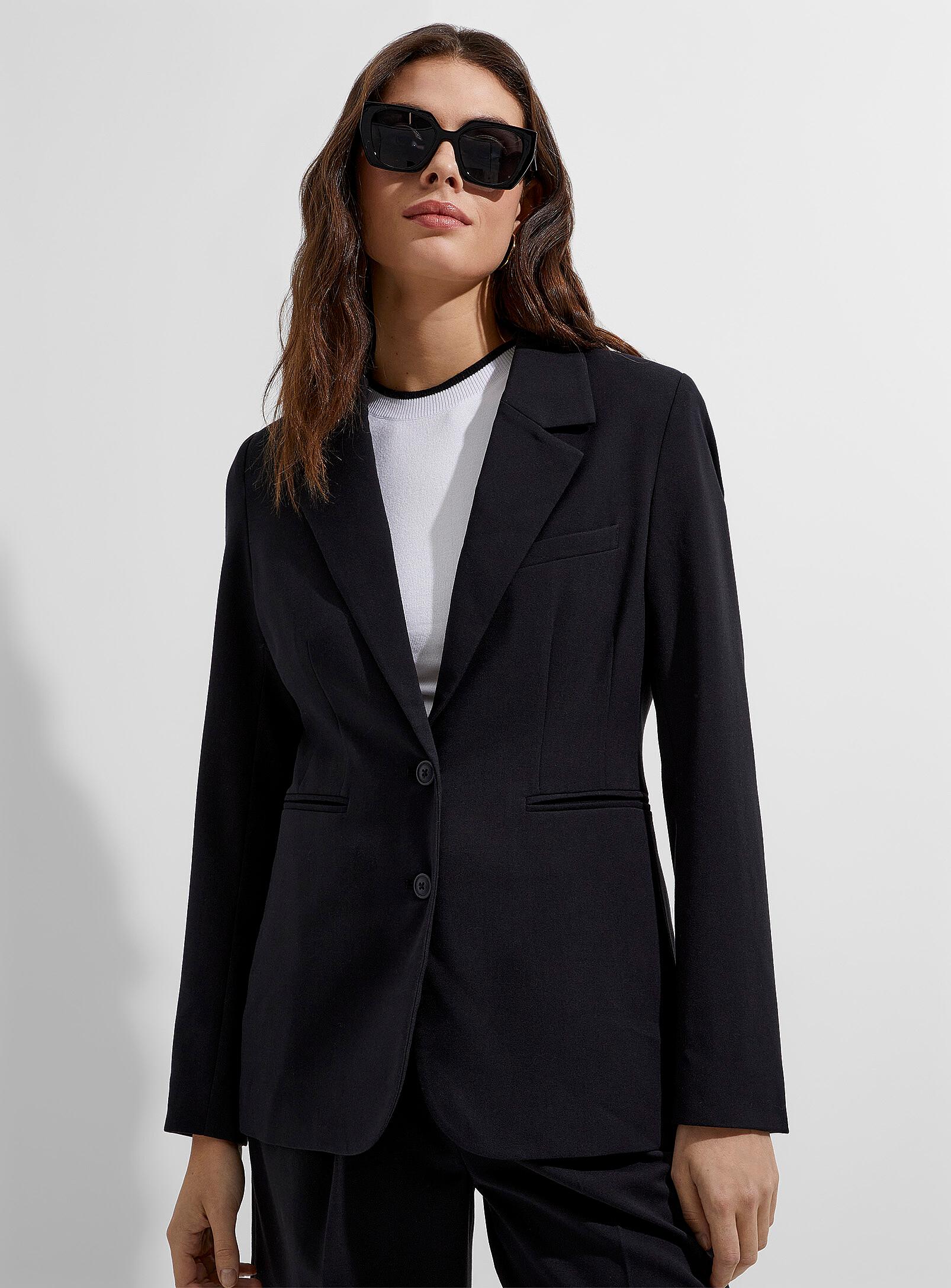 Fine, soft, and slightly stretch twill. Made with polyester from recycled plastic bottles. Touch of wool. Built-in fine silky lining. Loose style, slightly fitted at the waist. Notch collar. Built-in shoulder pads. Small trompe-l'oeil chest pocket. Piped pockets. Simple two-button closure.