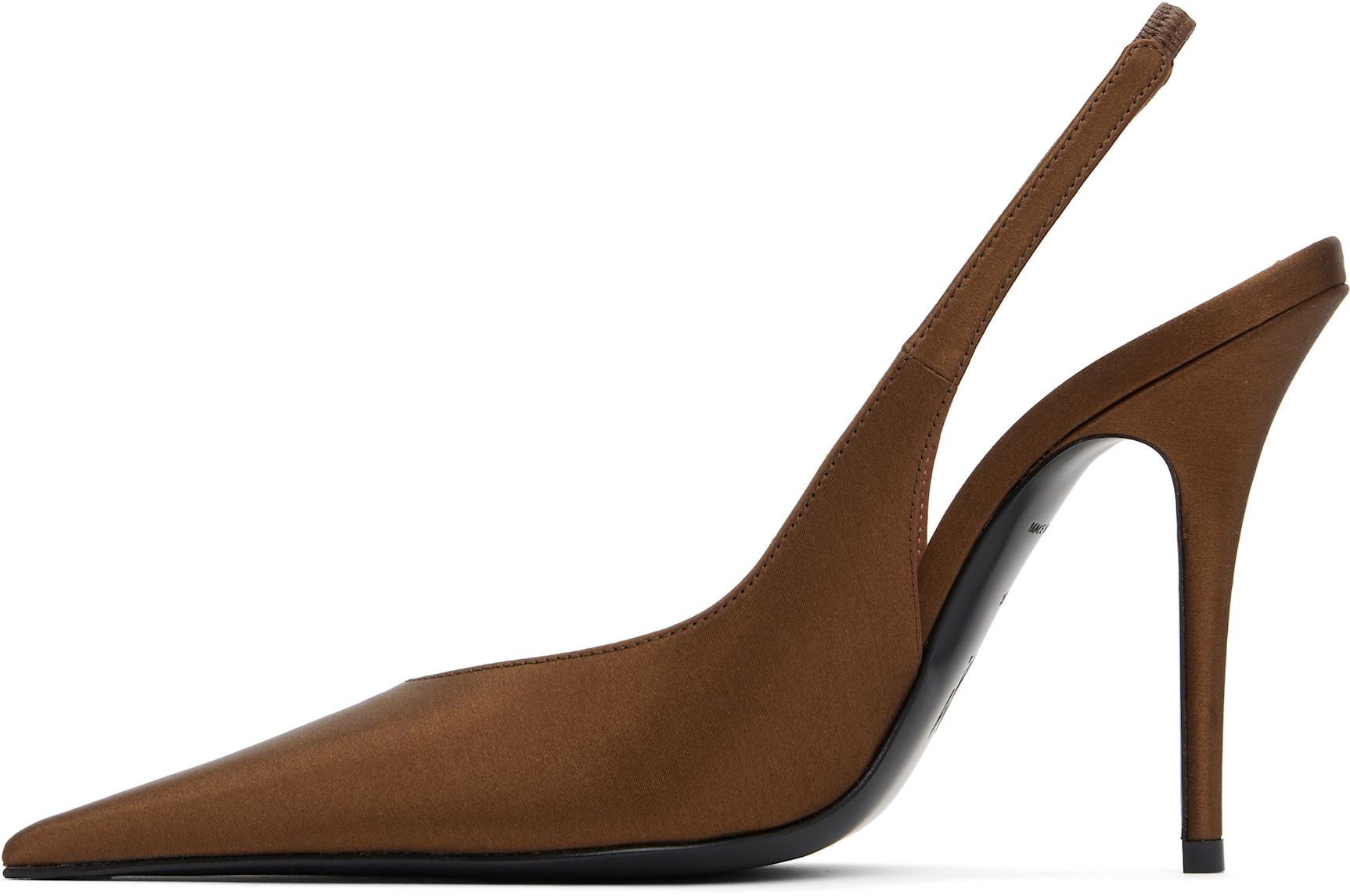 Silk satin heels in brown. Pointed toe. Partially elasticized slingback strap. Logo-embossed goatskin footbed. Covered stiletto heel with rubber injection. Polished leather sole with rubber injection.