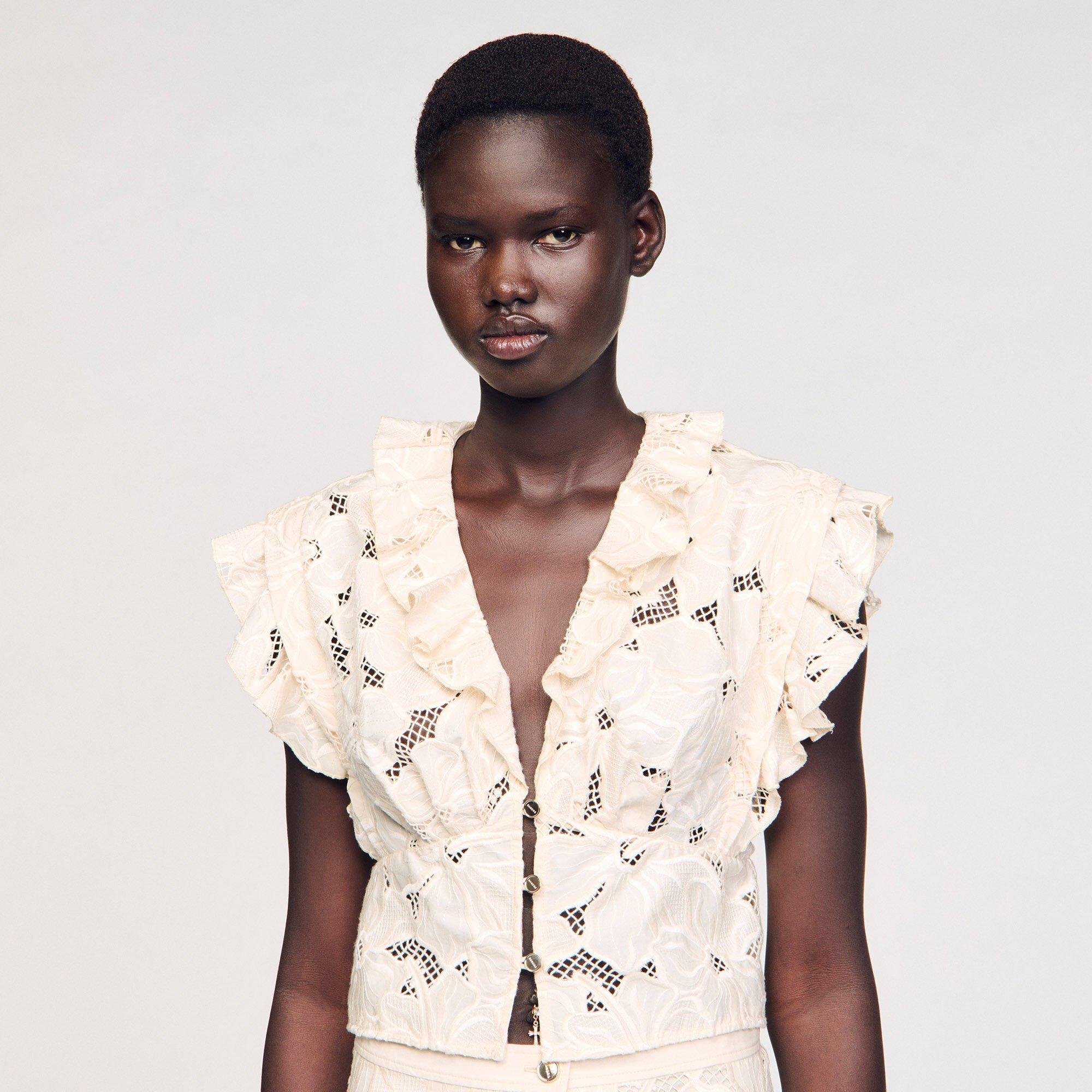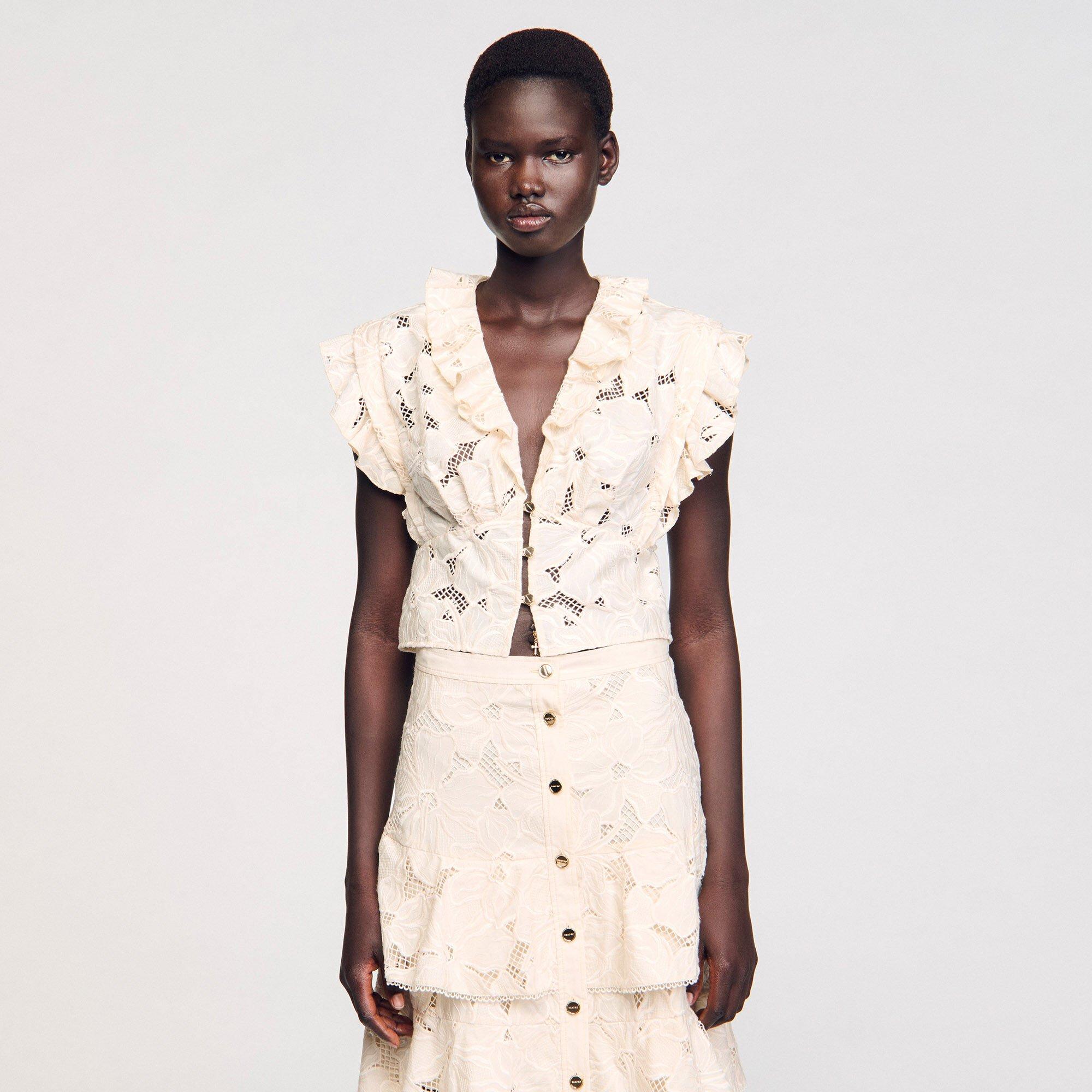 Sandro polyester. Embroidered crop top with short ruffled sleeves, a V-neck and a buttoned placket. Sandro Women's embroidered crop top V-neck Short ruffled sleeves Button placket on front Designed for a slim, cropped fit This top matches the skirt. This