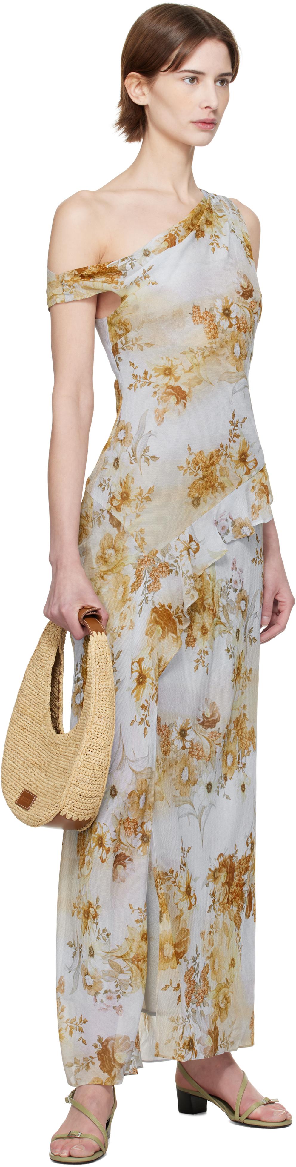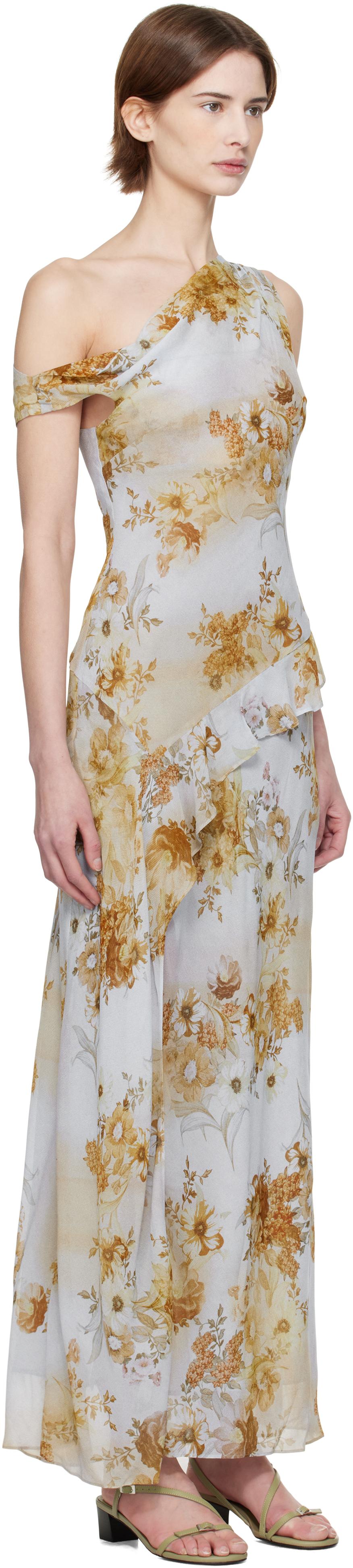 Viscose georgette maxi dress. Floral pattern printed throughout. · Single-shoulder construction · Darts at chest · Asymmetrical ruffled trim at waist · Slit at front hem · Fully lined Supplier color: Antique denim floral